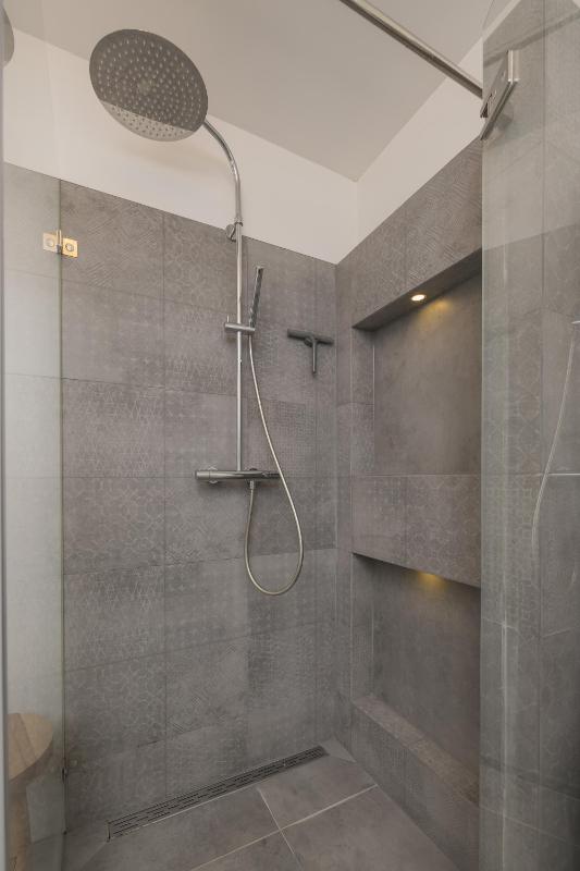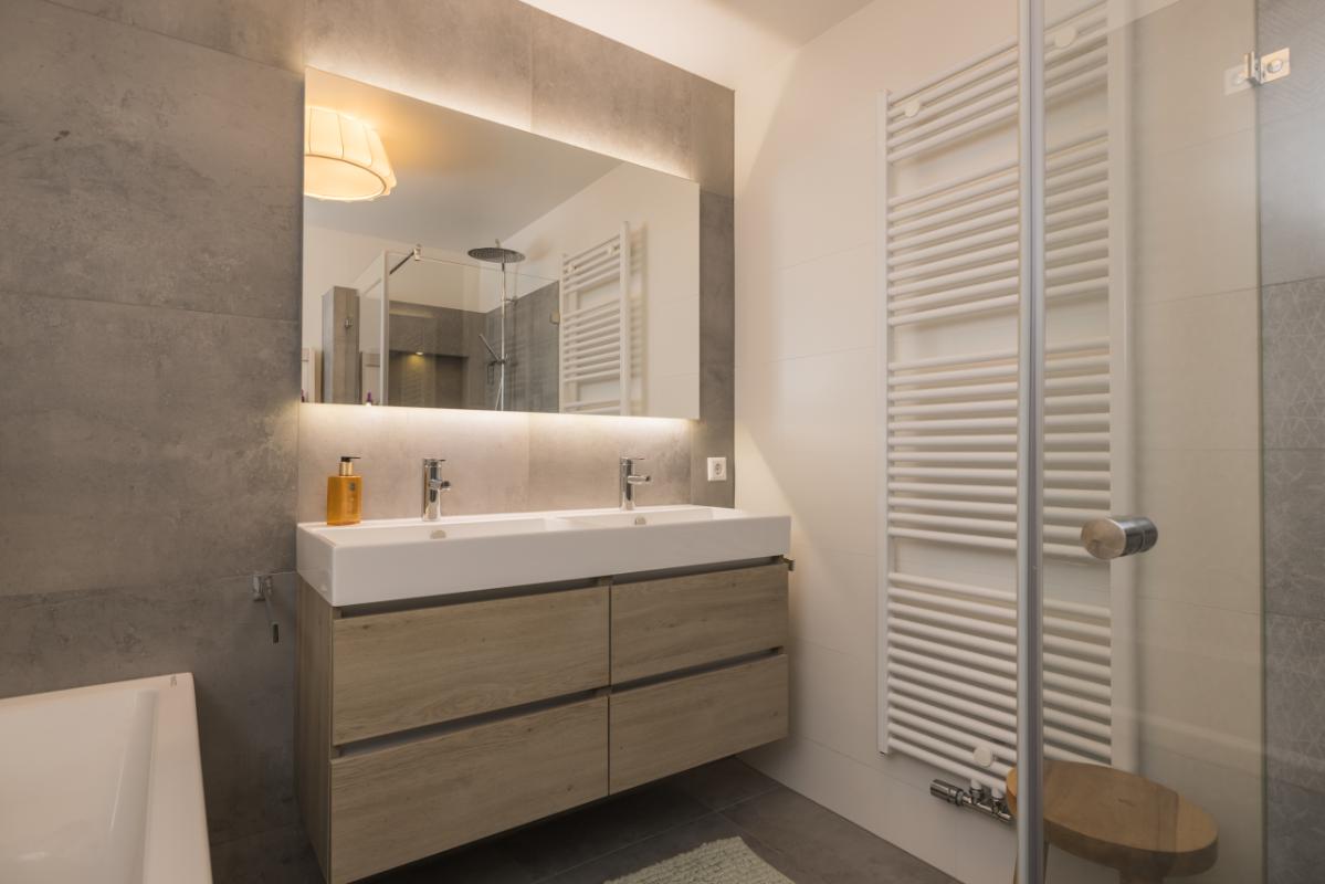 The stylish bathroom features a modern white/gray color scheme and is fully equipped. With a bathtub, double vanity, designer radiator, and luxurious walk-in shower with built-in lighting and a rain showerhead, it's a wonderful place to relax.