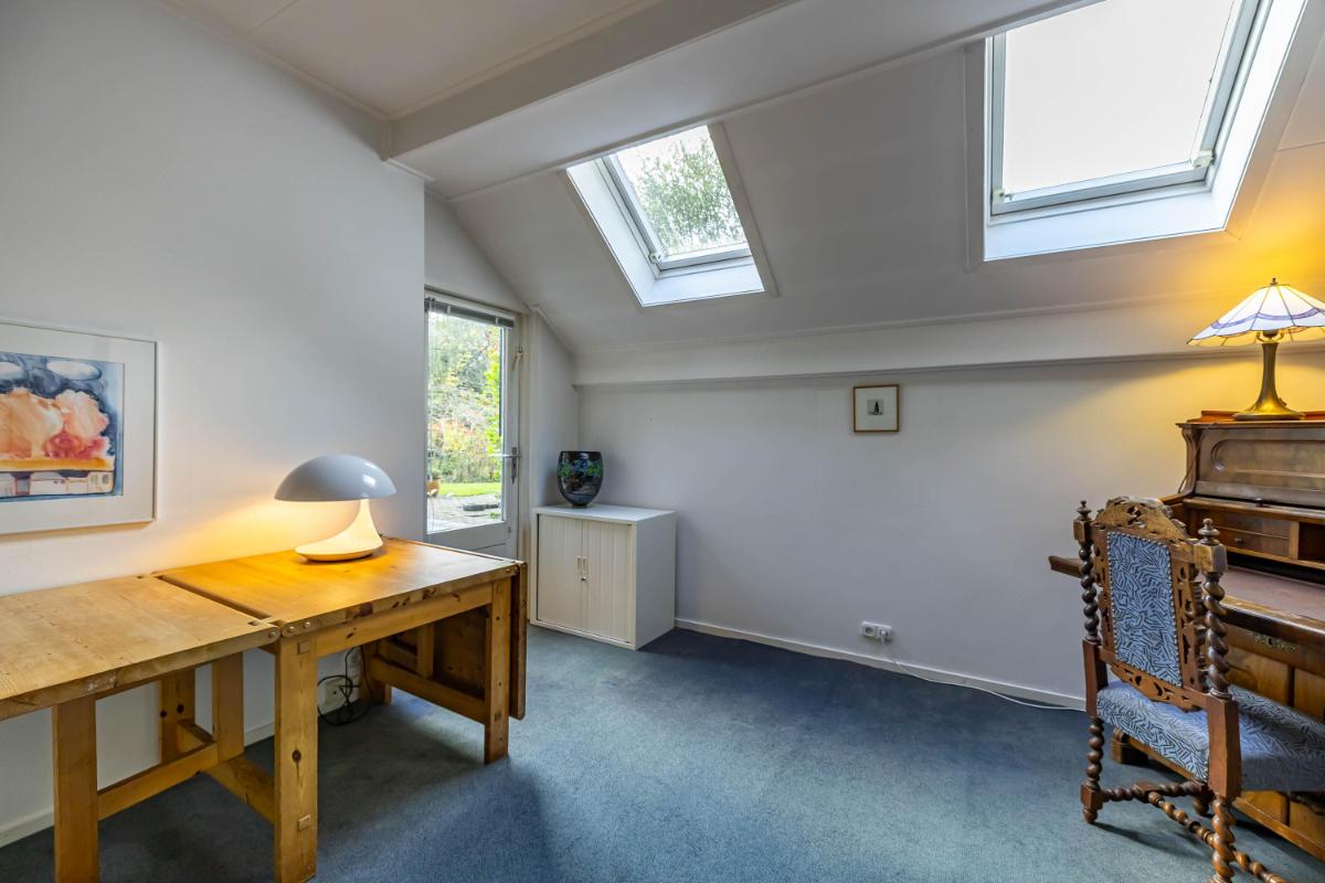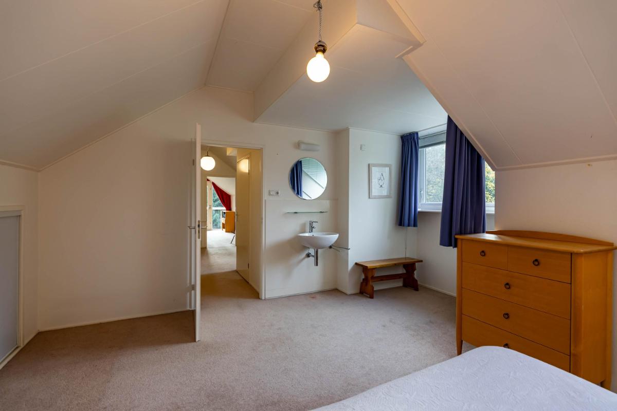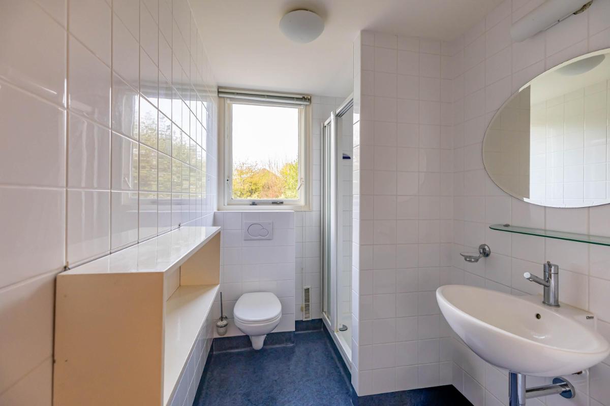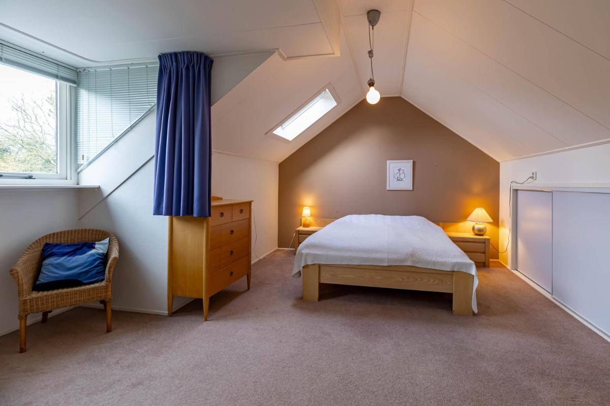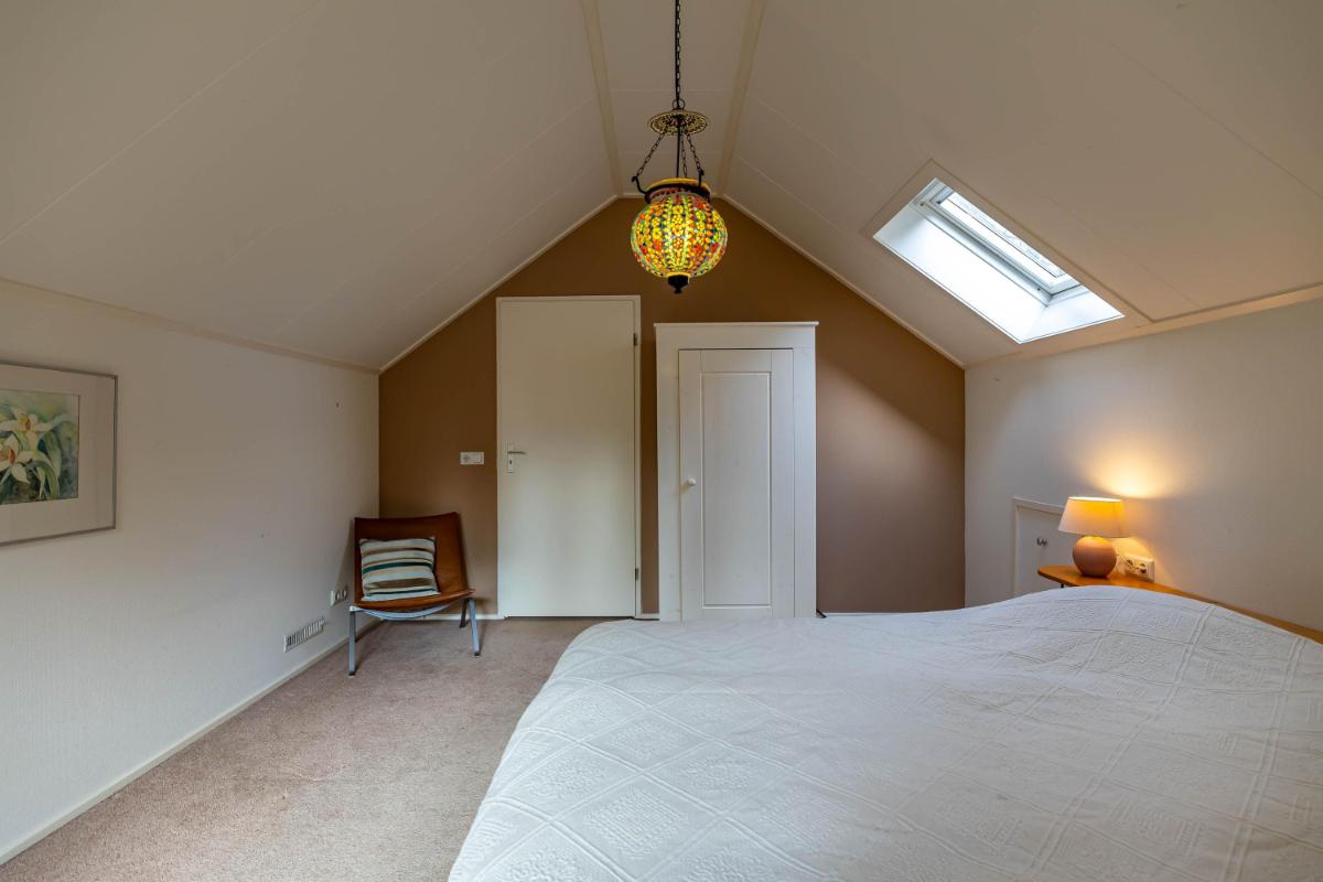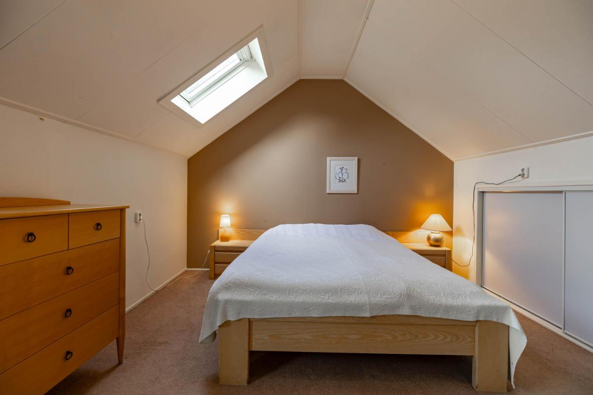 Op de eerste verdieping bevinden zich twee zeer ruime slaapkamers (20 en 18 m²) en een royale overloop (16 m²), die desgewenst ook als extra slaapkamer of werkkamer kan worden ingericht. De overloop biedt tevens toegang tot de badkamer met douche, toilet en wastafel en wordt verlicht door een raam in de dakkapel. De slaapkamer van ca. 20 m² is voorzien van een wastafel en geniet van een mooie lichtinval. De tweede slaapkamer (ca. 18 m²) heeft een dakraam aan de voorzijde en extra ramen in de zijgevel, wat zorgt voor bijzonder veel daglicht. Achter de knieschotten is op deze verdieping volop bergruimte aanwezig.