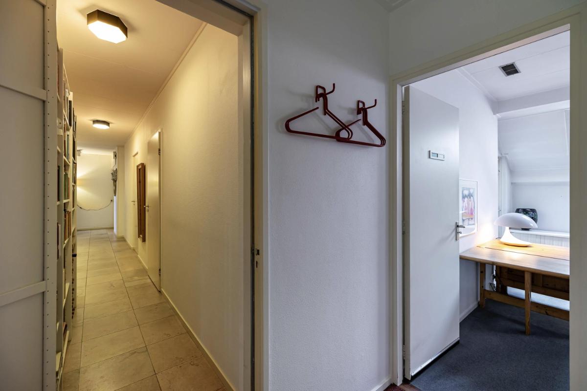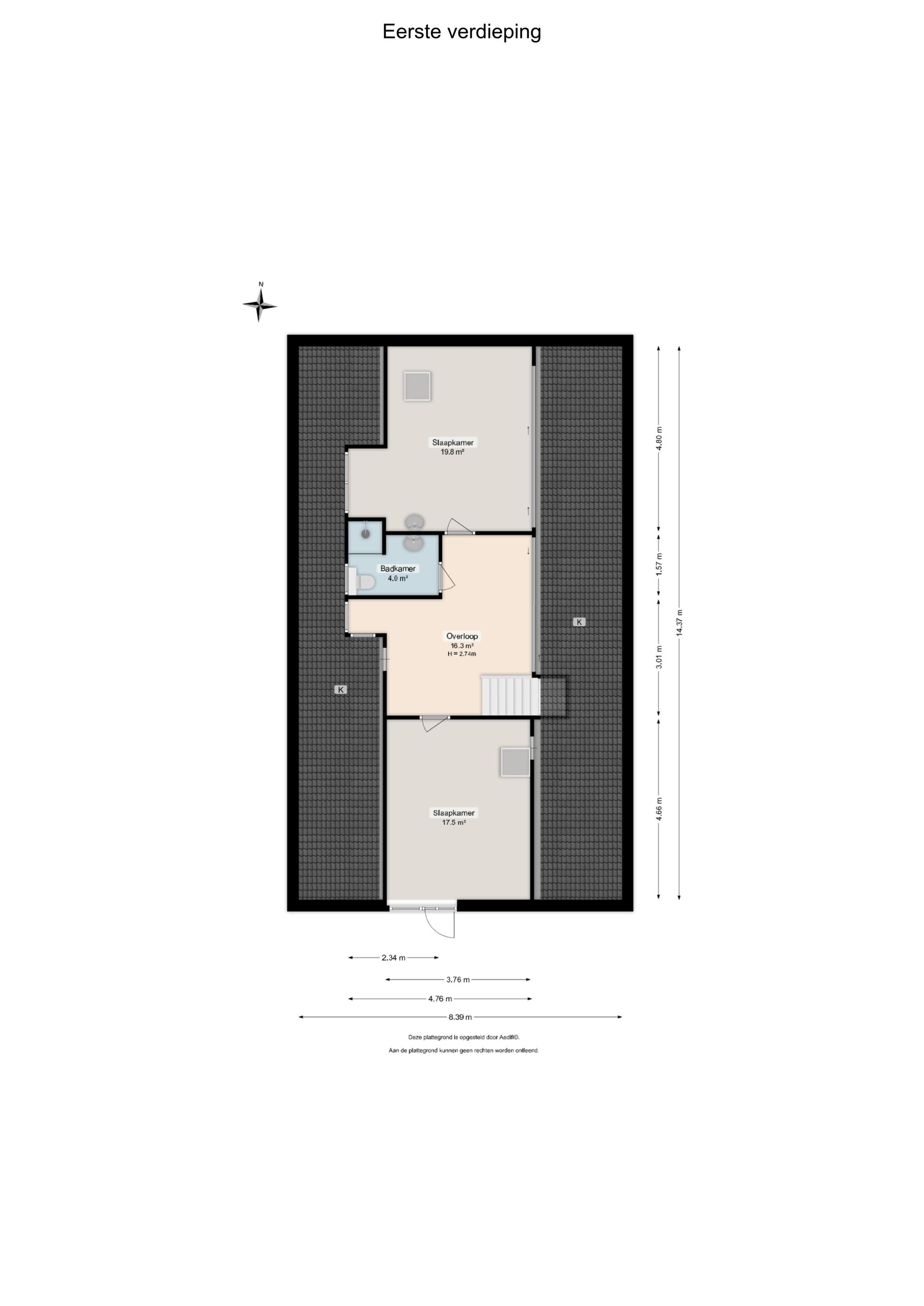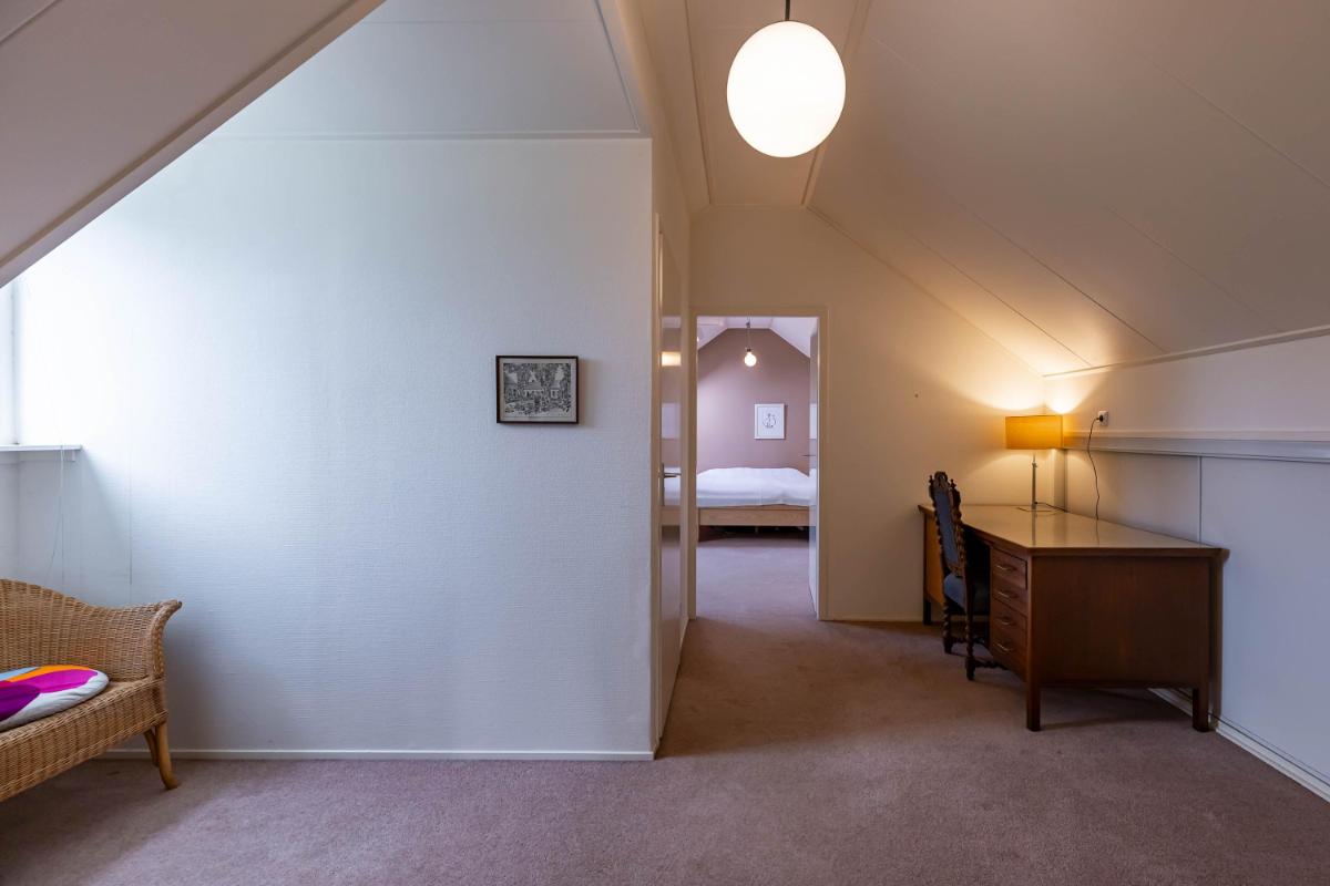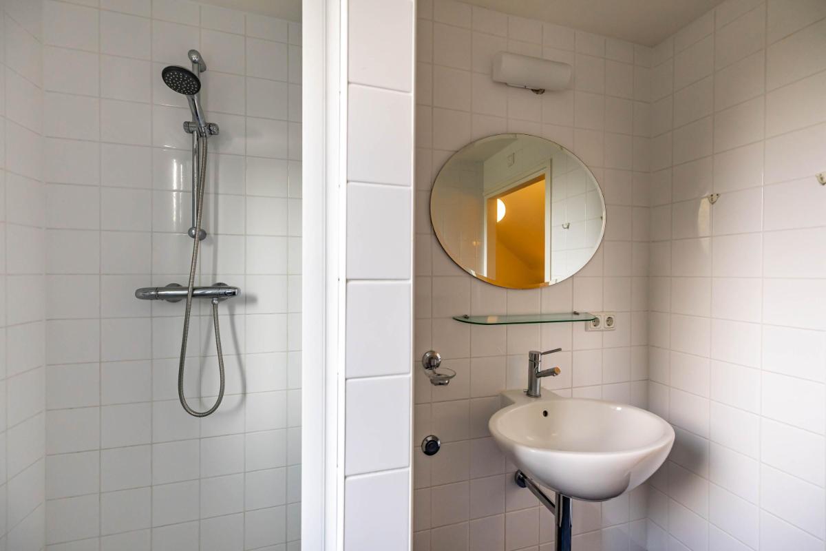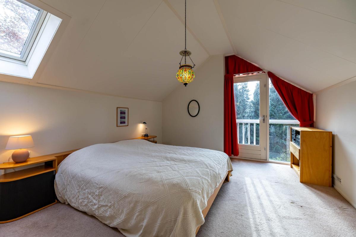 Op de eerste verdieping bevinden zich twee zeer ruime slaapkamers (20 en 18 m²) en een royale overloop (16 m²), die desgewenst ook als extra slaapkamer of werkkamer kan worden ingericht. De overloop biedt tevens toegang tot de badkamer met douche, toilet en wastafel en wordt verlicht door een raam in de dakkapel. De slaapkamer van ca. 20 m² is voorzien van een wastafel en geniet van een mooie lichtinval. De tweede slaapkamer (ca. 18 m²) heeft een dakraam aan de voorzijde en extra ramen in de zijgevel, wat zorgt voor bijzonder veel daglicht. Achter de knieschotten is op deze verdieping volop bergruimte aanwezig.