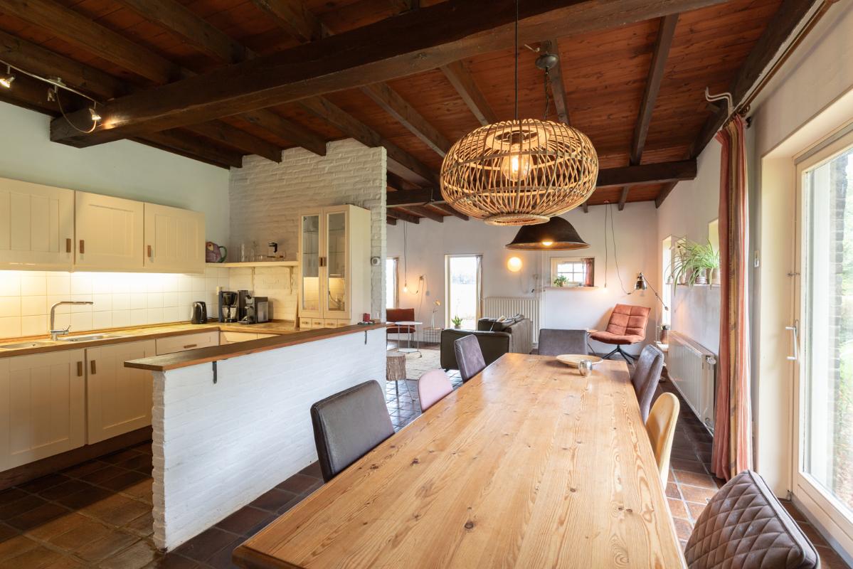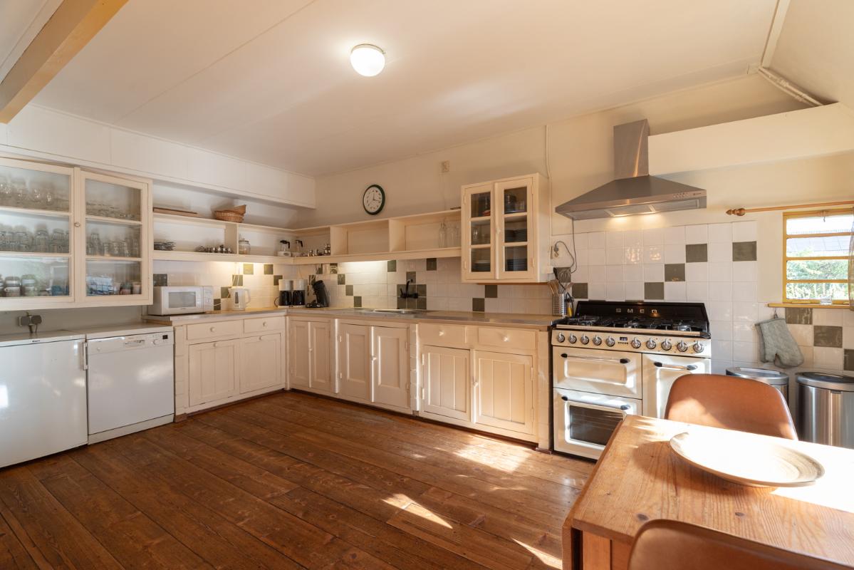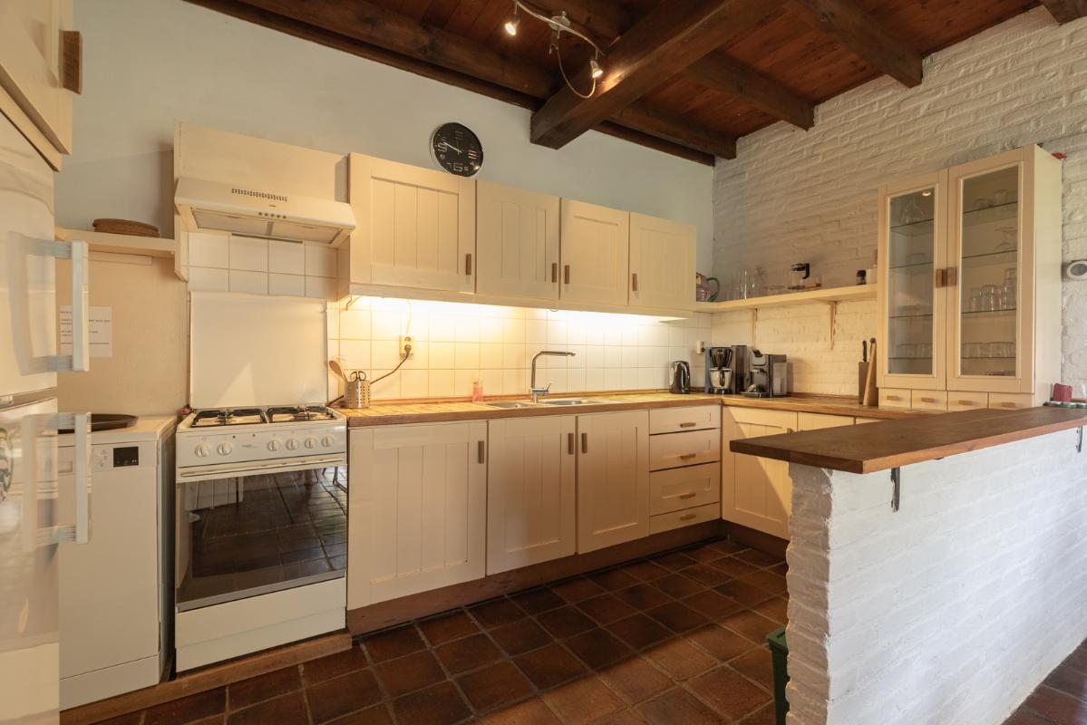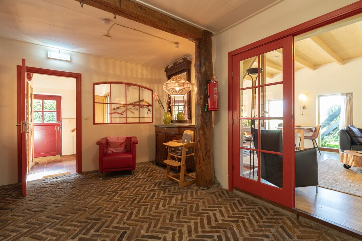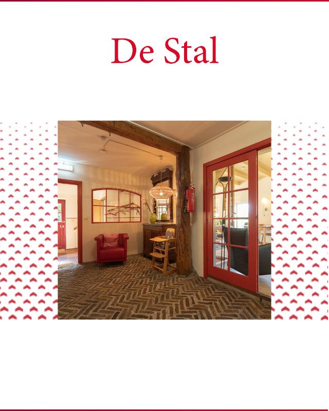 GROEPSACCOMMODATIE "De Stal" (8-16 personen): Begane grond: entree/hal met toilet; de centrale hal (met prachtige klinkervloer) geeft middels dubbele deuren toegang tot de woonkamer (ca. 38m²) met dubbele openslaande deuren naar de tuin en het terras. De zeer royale tuingerichte woonkeuken (ca. 45m²) heeft een nette keukeninrichting is voorzien van een groot fornuis en veel kast- en werkruimte. De badkamer op de begane grond heeft een douche, wastafelmeubel en wandcloset. Eerste verdieping: overloop; toilet, 2 doucheruimtes met wastafel en 6 slaapkamers (ca. 14, 13, 12, 10, 10 en 9m²).