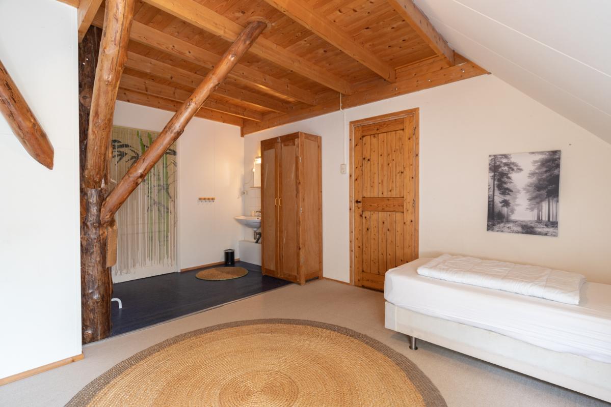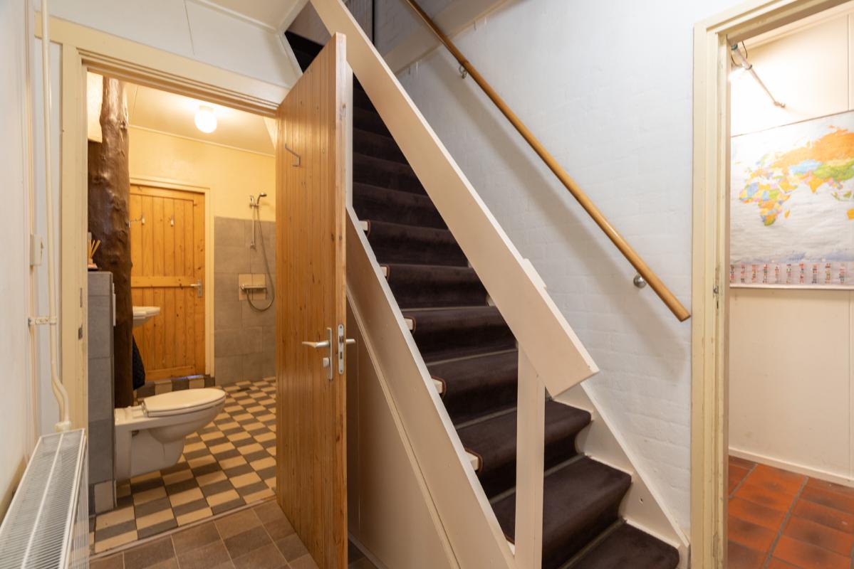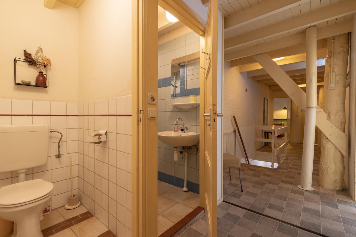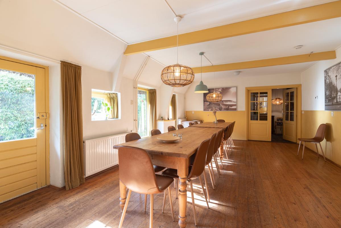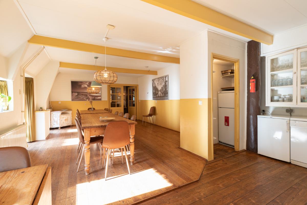VOORHUIS: Begane grond: hal/entree met toilet; een ruime woonkamer (ca. 20m²) met aangrenzende halfopen woonkeuken (ca. 28m²); achterkamer/werkkamer (ca. 11m²) en een naastgelegen inpandige bijkeuken. Vanuit de bijkeuken is er via de gang toegang tot de twee groepsaccommodaties. Bij het huis hoort ook nog een ruime berging/schuur (ca. 15m²) toegankelijk via de voormalige baanderdeuren. Eerste verdieping: overloop; 4 slaapkamers (ca. 12, 10, 9 en 5m²) en een nette badkamer voorzien van wastafelmeubel, wandcloset en inloopdouche. Tweede verdieping: overloop; een ruime zolderkamer (ca. 15m² vloeroppervlakte) voorzien van een groot dakraam.