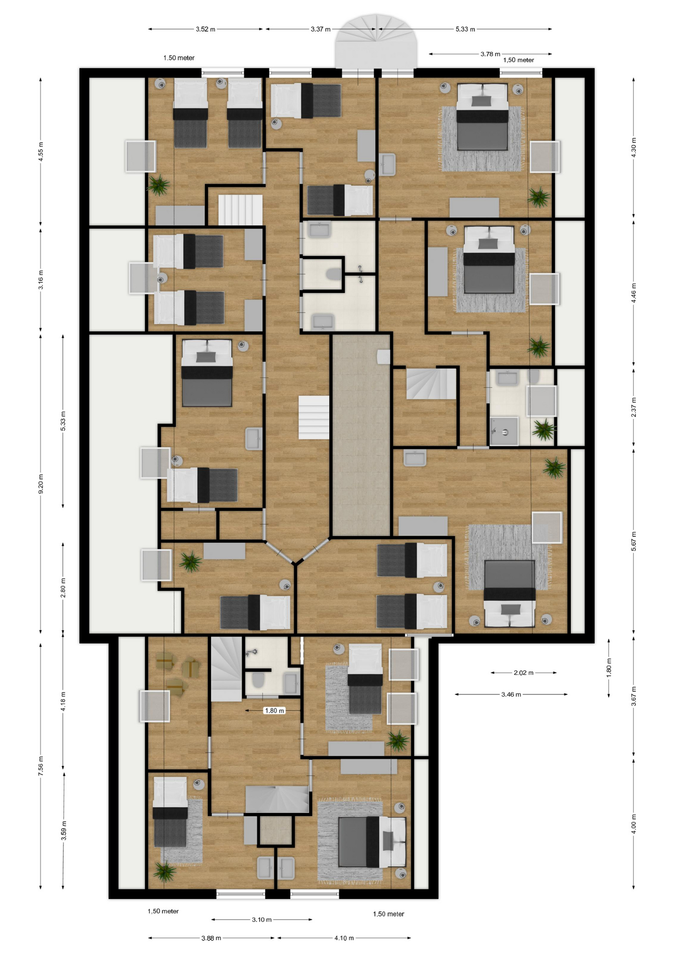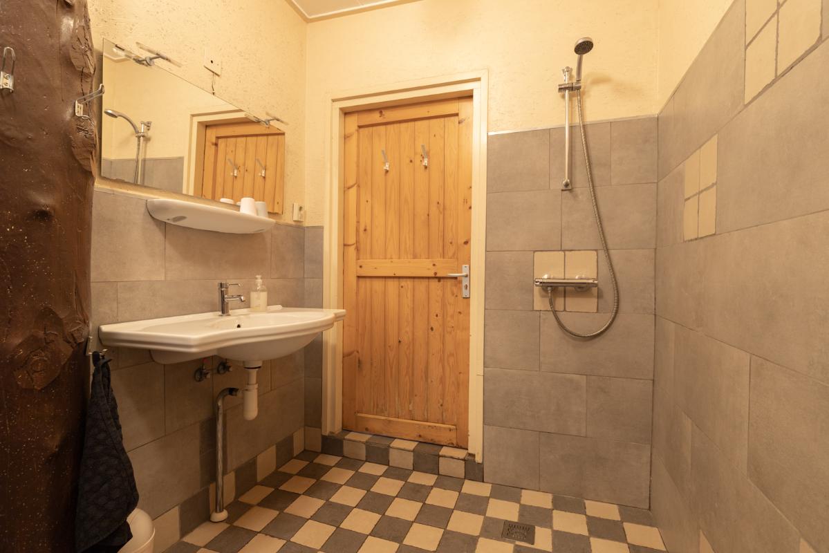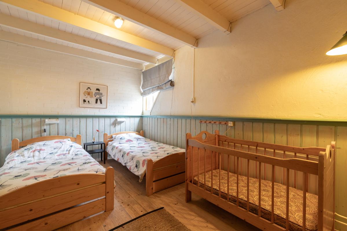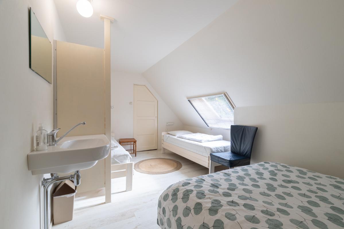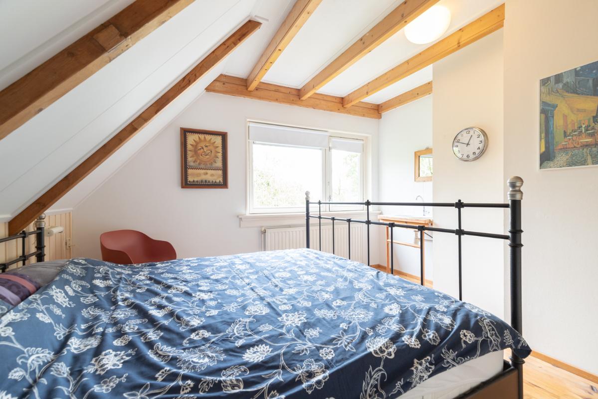 VOORHUIS: Begane grond: hal/entree met toilet; een ruime woonkamer (ca. 20m²) met aangrenzende halfopen woonkeuken (ca. 28m²); achterkamer/werkkamer (ca. 11m²) en een naastgelegen inpandige bijkeuken. Vanuit de bijkeuken is er via de gang toegang tot de twee groepsaccommodaties. Bij het huis hoort ook nog een ruime berging/schuur (ca. 15m²) toegankelijk via de voormalige baanderdeuren. Eerste verdieping: overloop; 4 slaapkamers (ca. 12, 10, 9 en 5m²) en een nette badkamer voorzien van wastafelmeubel, wandcloset en inloopdouche. Tweede verdieping: overloop; een ruime zolderkamer (ca. 15m² vloeroppervlakte) voorzien van een groot dakraam.