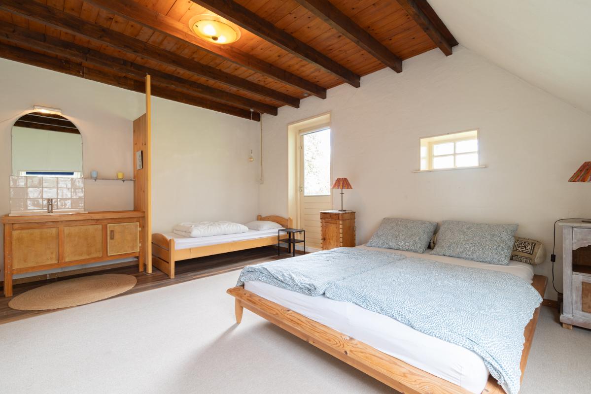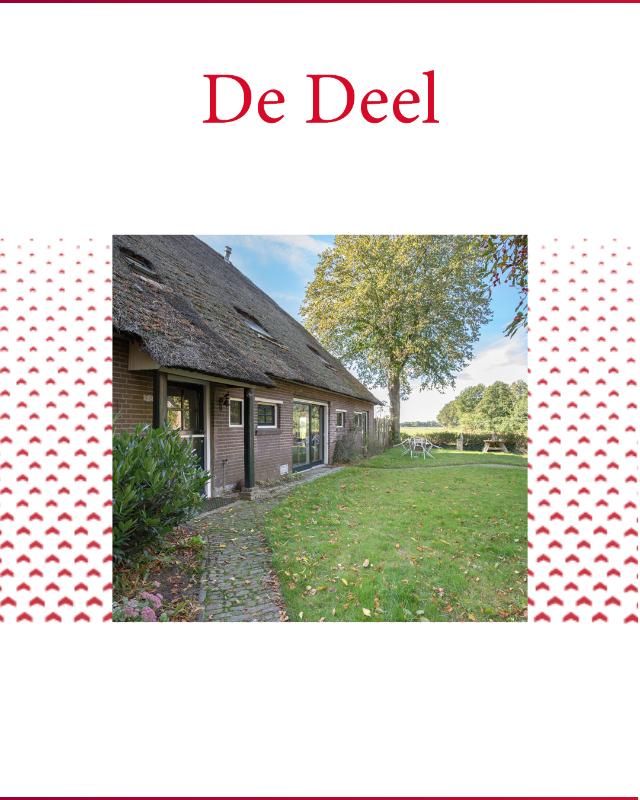 GROEPSACCOMMODATIE ''De Deel'' (2-8 personen): Begane grond: hal/entree met toilet; een royale woonkamer met woonkeuken (ca. 53m²) met schuifpui naar de tuin; een slaapkamer van 9m² en een badkamer voorzien van een douche, ligbad en twee wastafels. Eerste verdieping: overloop; 3 ruime slaapkamers (ca. 20, 18 en 12m²) en een compacte tweede badkamer voorzien van douche, toilet en wastafel.