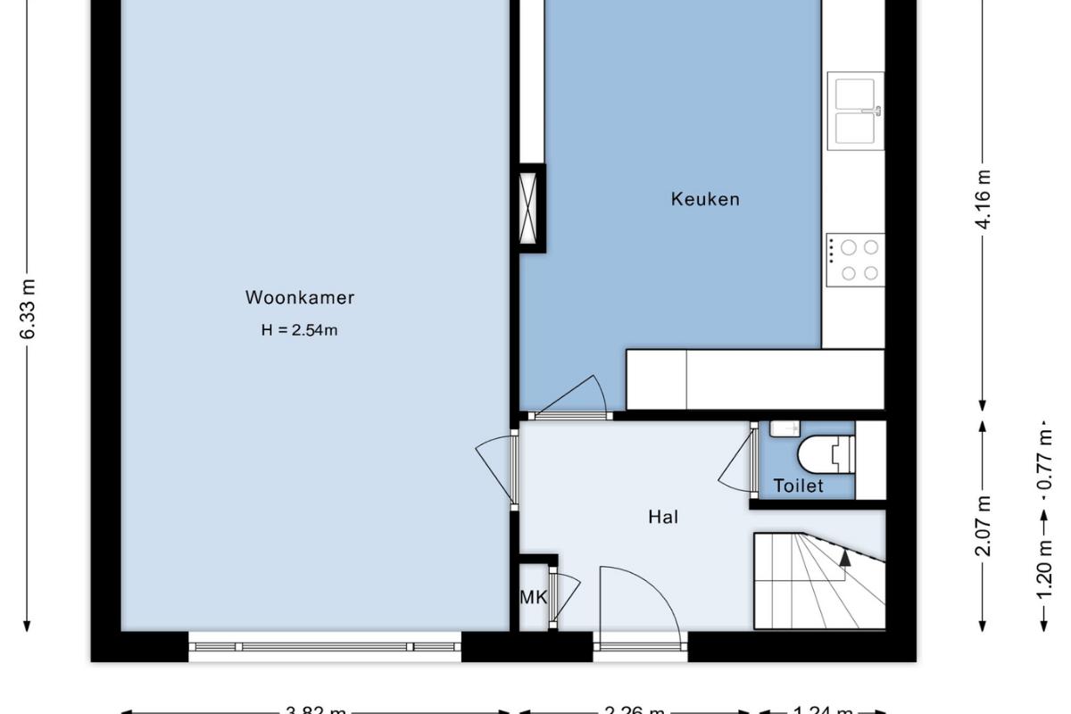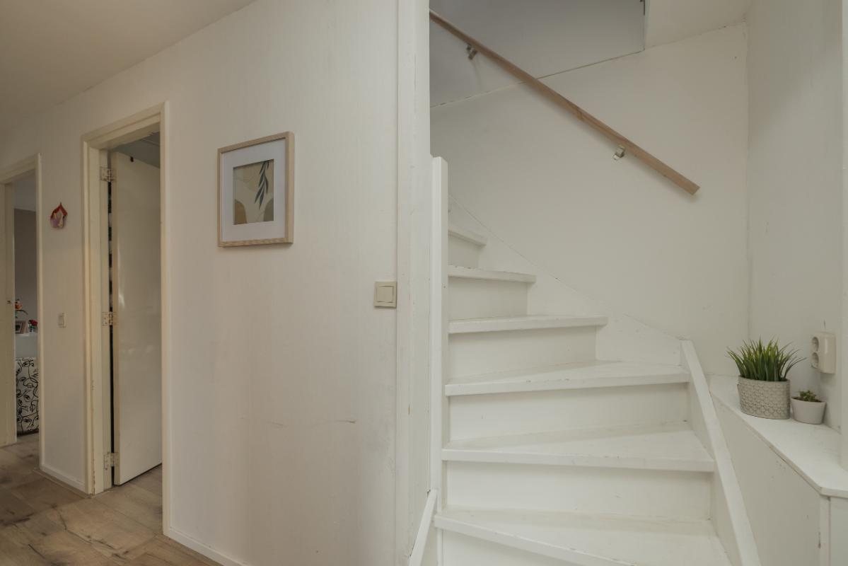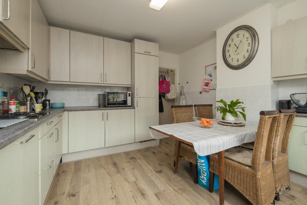 Indeling begane grond Entree, hal met meterkast en toilet met fonteintje. De woonkamer is heerlijk licht dankzij de grote raampartij met schuifpui naar de achtertuin. Vanuit de hal is de woon-/eetkeuken (ca. 15 m²) bereikbaar. De keuken is uitgevoerd in een L-opstelling met lichte kasten en lades, gecombineerd met een grijs werkblad. De keuken is uitgerust met inbouwapparatuur, waaronder een gaskookplaat, afzuigkap, vaatwasser, koel-vriescombinatie en een aansluiting voor de wasmachine.