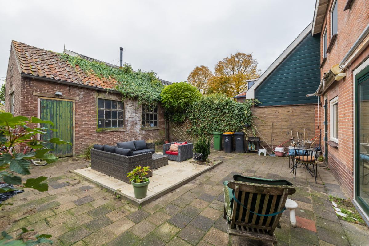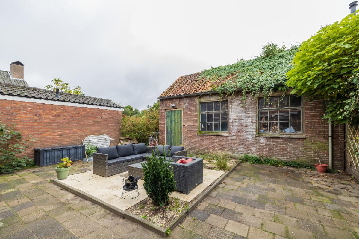 Tuin Via het zijpad (ca. 1,80 meter breed) is de ruime achtertuin bereikbaar, met een breedte van ca. 9,5 meter en een diepte van ca. 8,40 meter tot aan de berging. De tuin is gelegen op het zonnige zuidwesten en biedt een heerlijk vrije ligging, ideaal om optimaal van het buitenleven te genieten. Achterin de tuin bevindt zich een grote berging/werkplaats van ca. 34 m², perfect voor het opbergen van spullen en fietsen, of te gebruiken als werk- of atelierruimte.