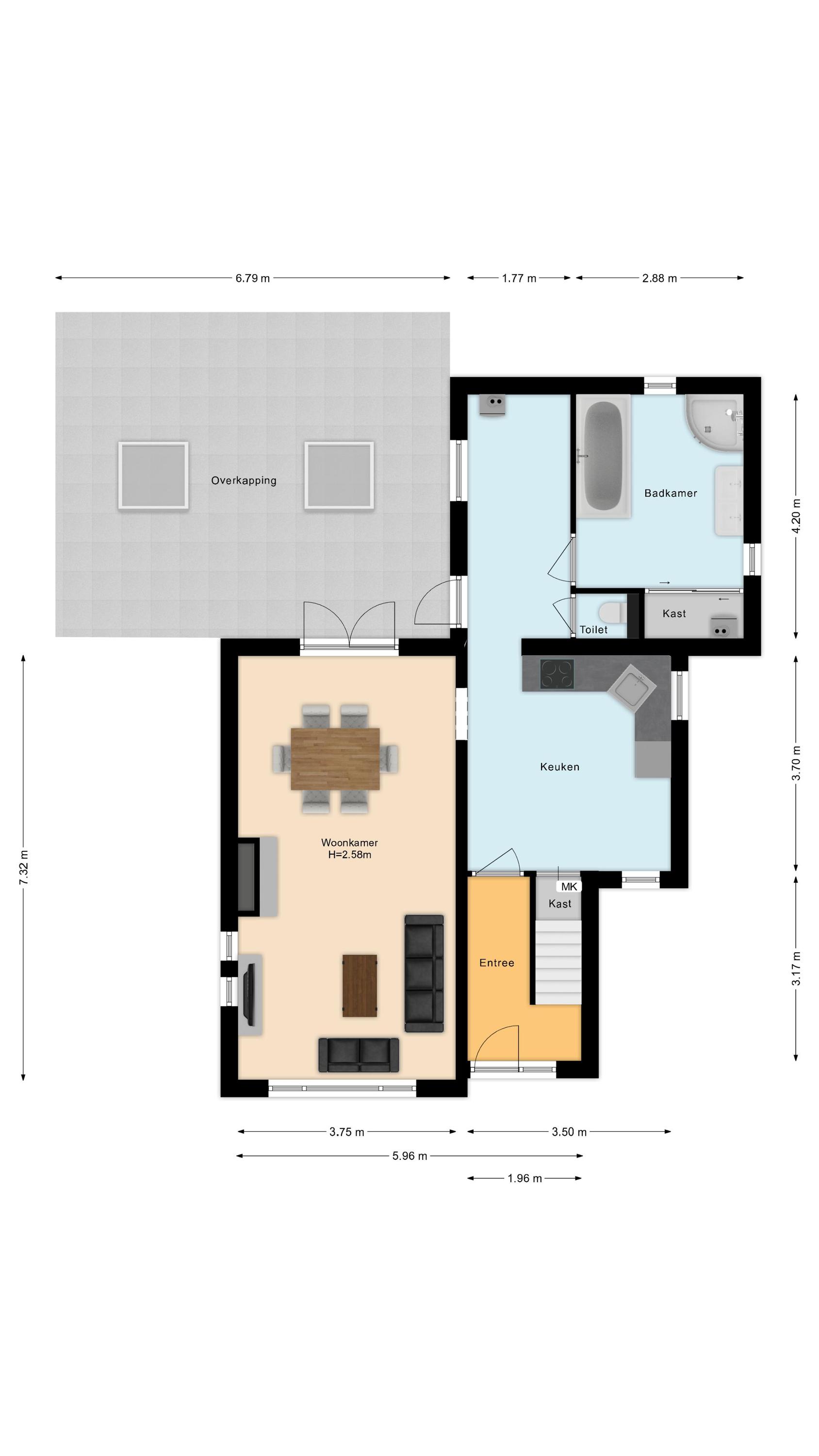 Woonkamer: Een gezellige en lichte ruimte met ramen aan meerdere zijden, waardoor u geniet van veel daglicht en uitzicht op de tuin. De woonkamer biedt voldoende ruimte voor een zithoek en eethoek, en is het hart van het huis. Via de woonkamer heeft u toegang tot de achtertuin met overkapping.