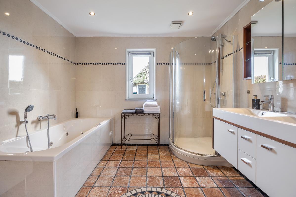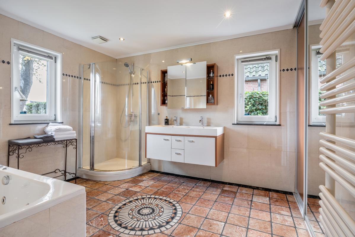 Badkamer: Gelegen op de begane grond, voorzien van douche, ligbad, dubbel wastafelmeubel en aansluitingen voor wasmachine en droger. Praktisch en comfortabel.