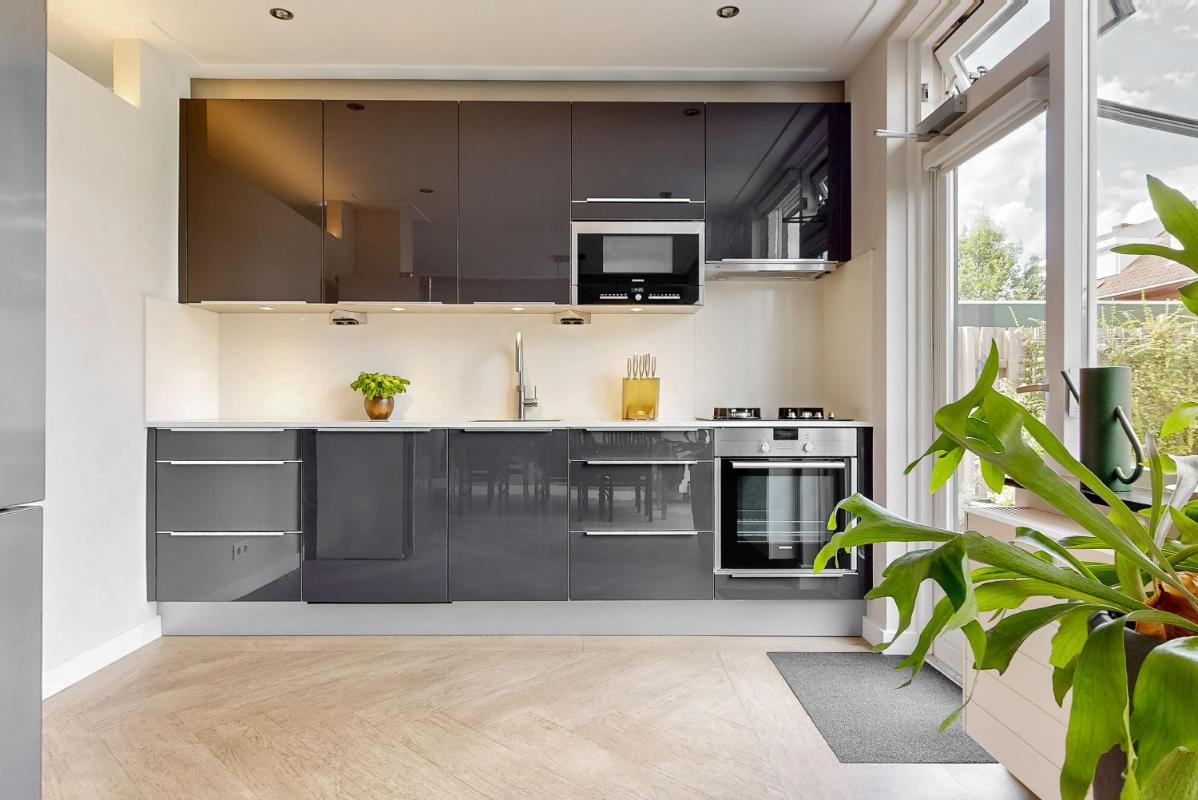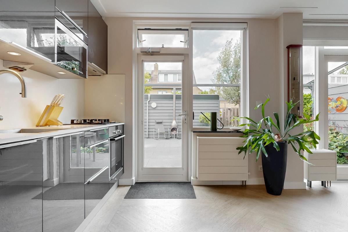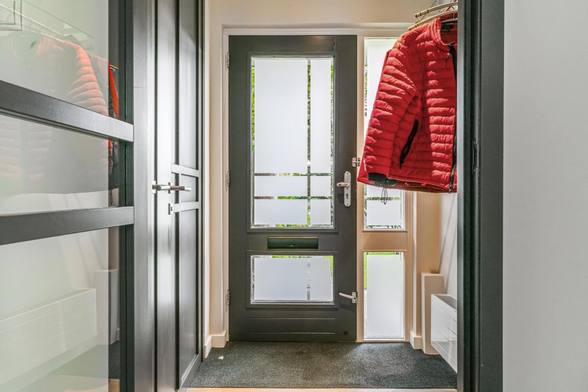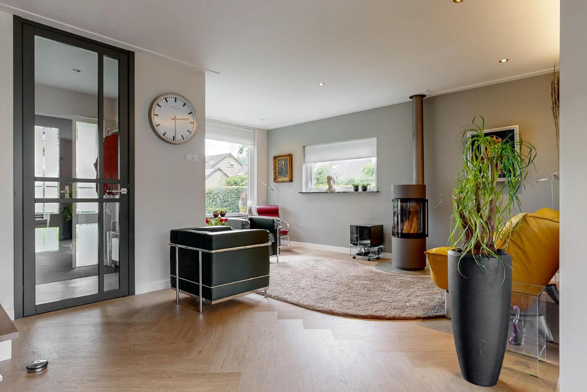 Al bij aankomst valt de ruime voortuin op, gelegen op het zuidoosten, waar u heerlijk van de zon kunt genieten. Via de voortuin komt u binnen in de hal met garderobe, de meterkast, het moderne toilet met fontein en toegang tot de leefruimte. De woonkamer voelt licht en sfeervol aan dankzij de grote raampartijen, de pvc-visgraatvloer, ingebouwde spots, strak plafond en de houtkachel die warmte en gezelligheid toevoegt. Aan de achterzijde loopt de woning over in de eethoek, waar openslaande deuren toegang geven tot de verzorgde achtertuin. De open keuken, in een rechte opstelling, is voorzien van de volgende inbouwapparatuur: een 4-pitsgasfornuis met afzuigkap, oven, magnetron, Quooker en vaatwasser. Een deur vanuit de keuken biedt eveneens toegang tot de tuin. Voor extra comfort is de woning aan de voorzijde voorzien van elektrische screens, aan de achterzijde van een elektrisch uitvalscherm met sfeervolle verlichting en heaters en aan de zijkant van een handmatig te bedienen zonnescherm. In de woonkamer bevindt zich de trap naar de eerste verdieping en de handige provisiekast.