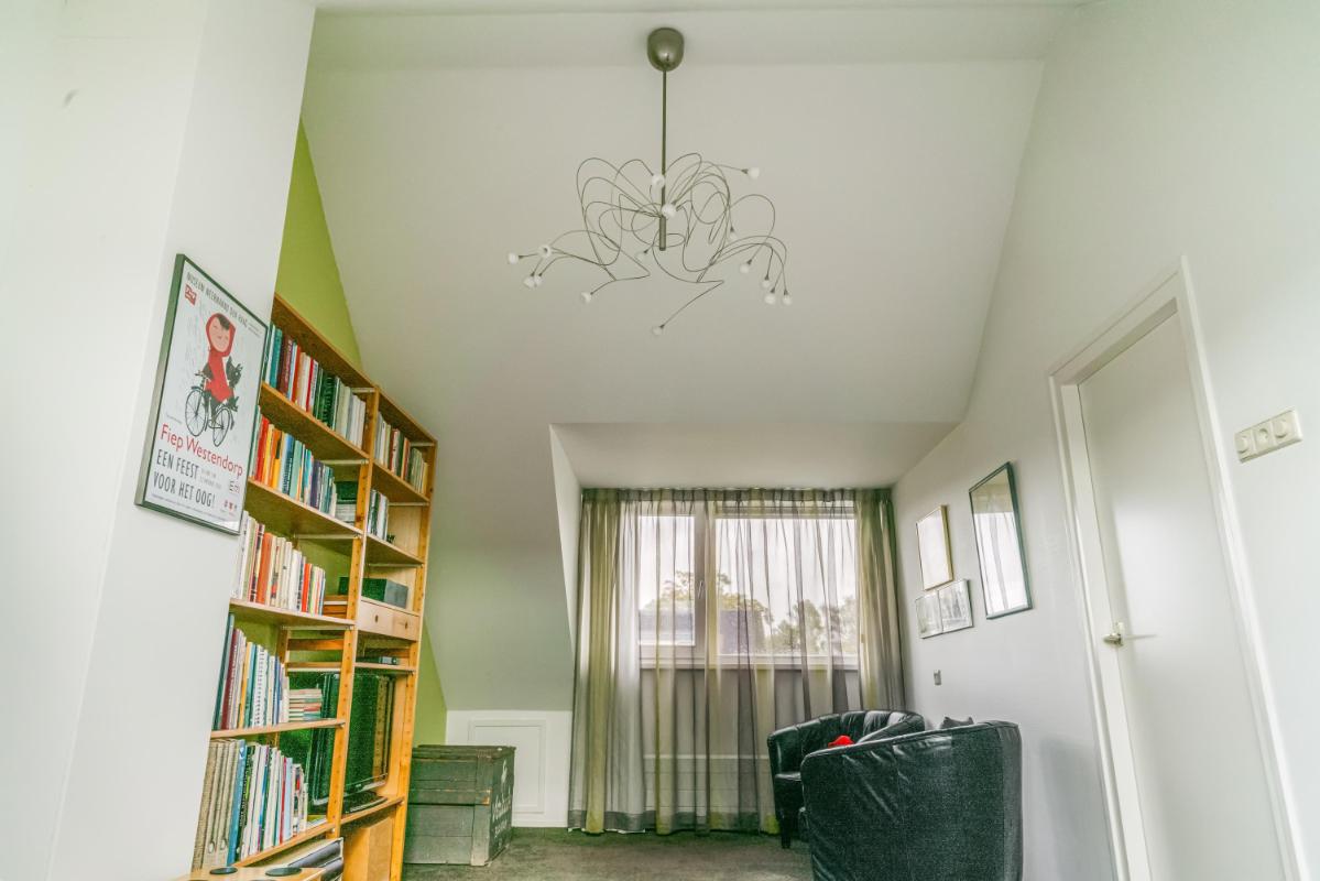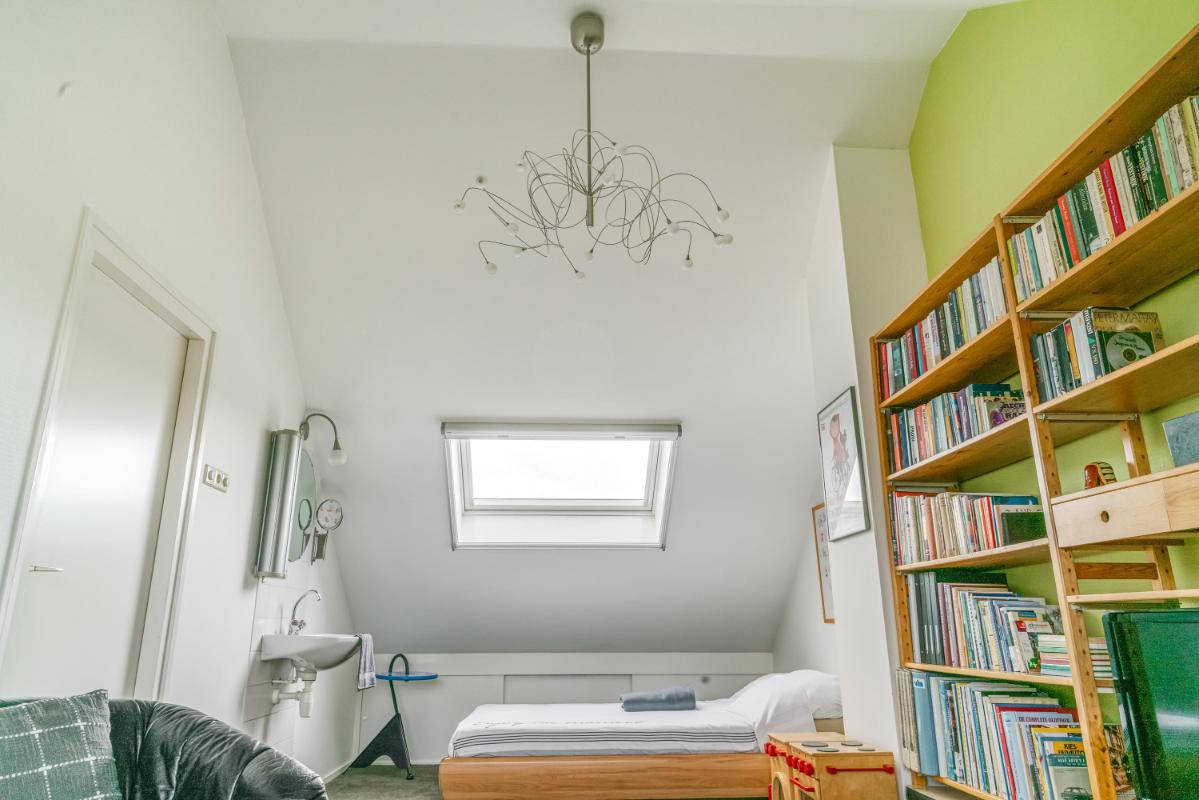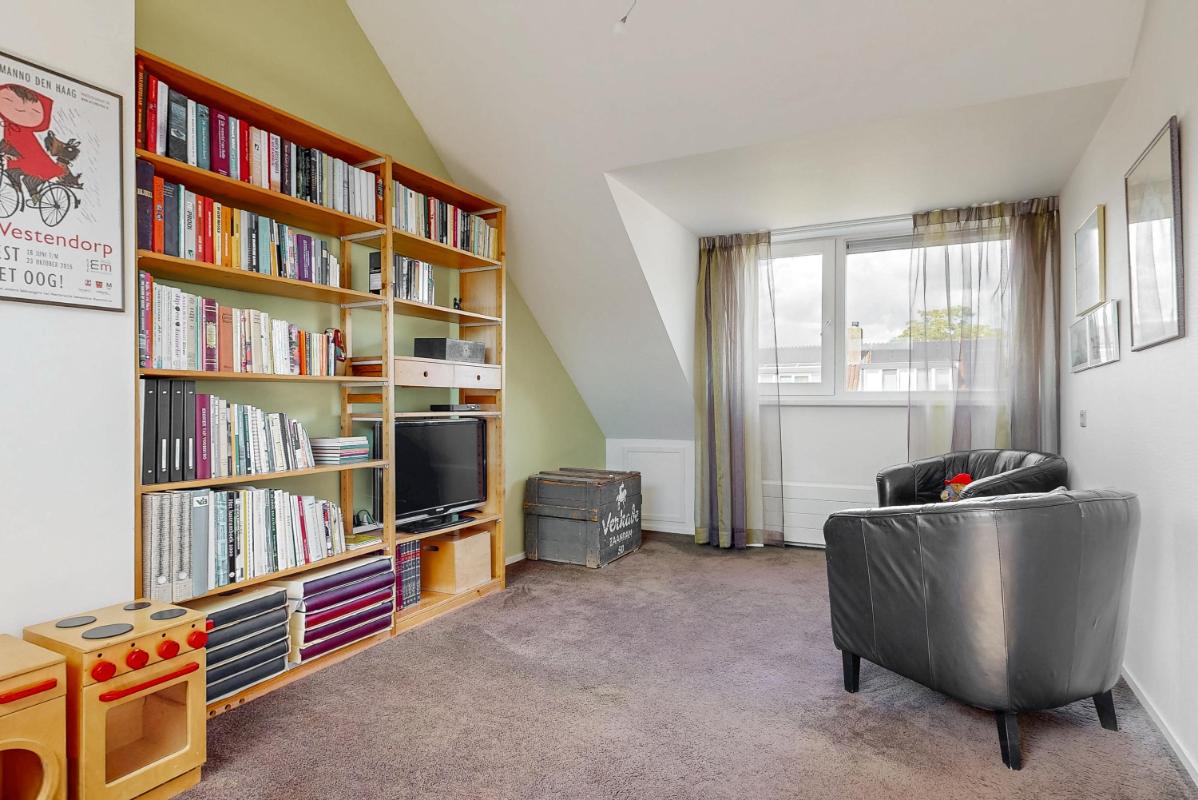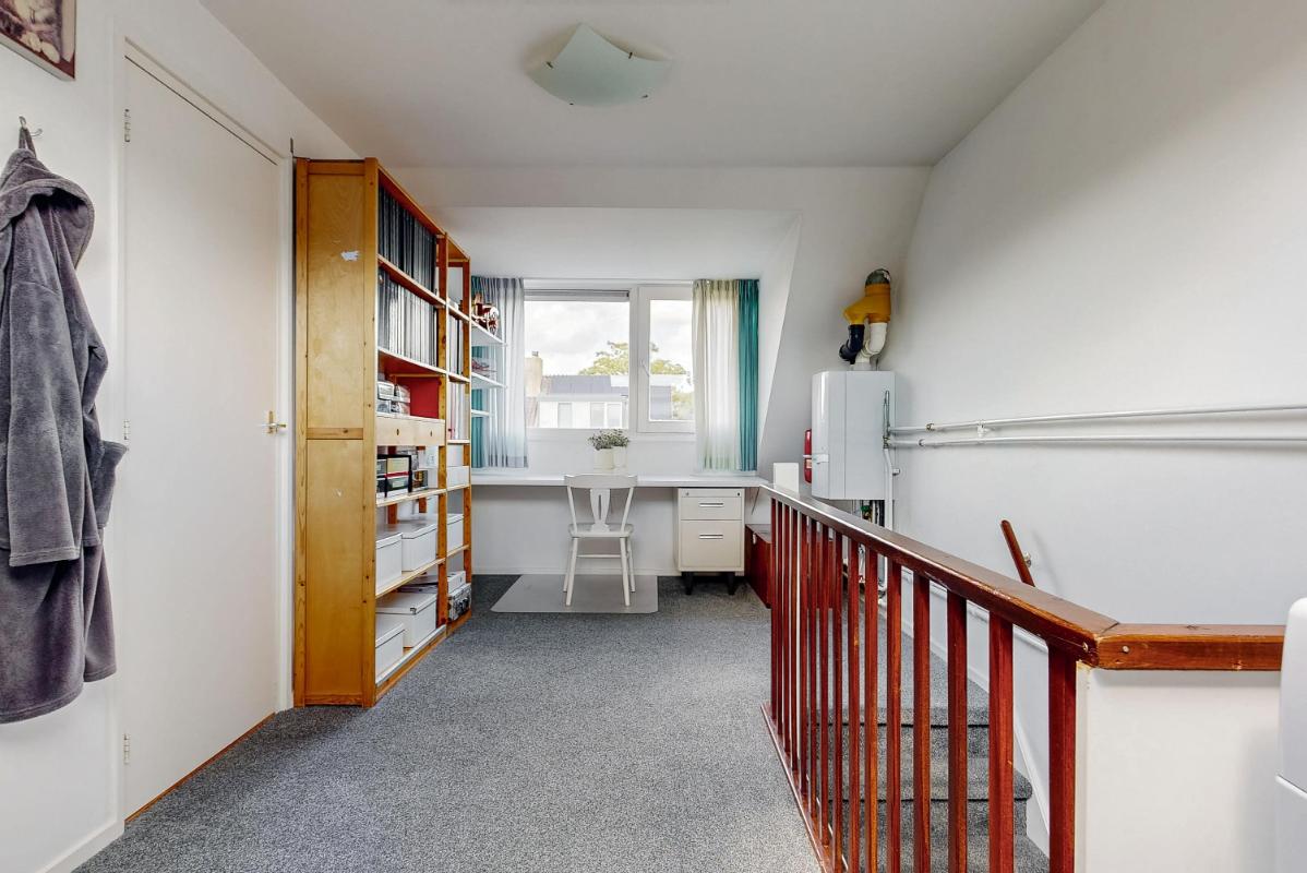 De tweede verdieping biedt verrassend veel licht en ruimte dankzij het dakraam aan de voorzijde en de grote dakkapel aan de achterzijde. Hier vindt u een riante vierde slaapkamer met eigen wastafel, dakraam en bergruimte achter de knieschotten. De vierde slaapkamer is dusdanig royaal dat deze te splitsen is in twee kamers. Op de overloop bevinden zich de cv-installatie en de aansluitingen voor wasmachine en droger. Ook hier is extra bergruimte aanwezig, zowel achter de knieschotten als op de geïsoleerde vliering in de nok van het huis. Ook vindt u hier een prettige en lichte werkplek, geschikt voor werk of hobby, met uitzicht over de achtertuin.