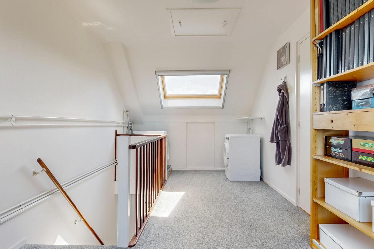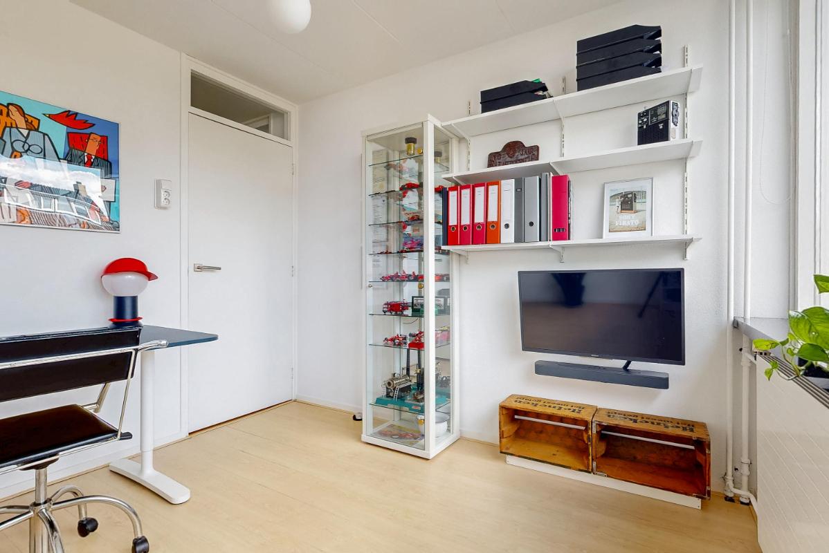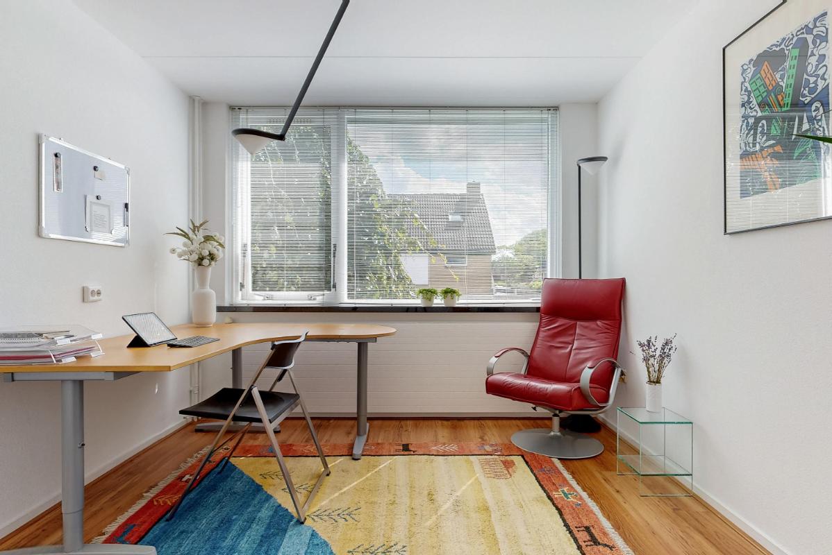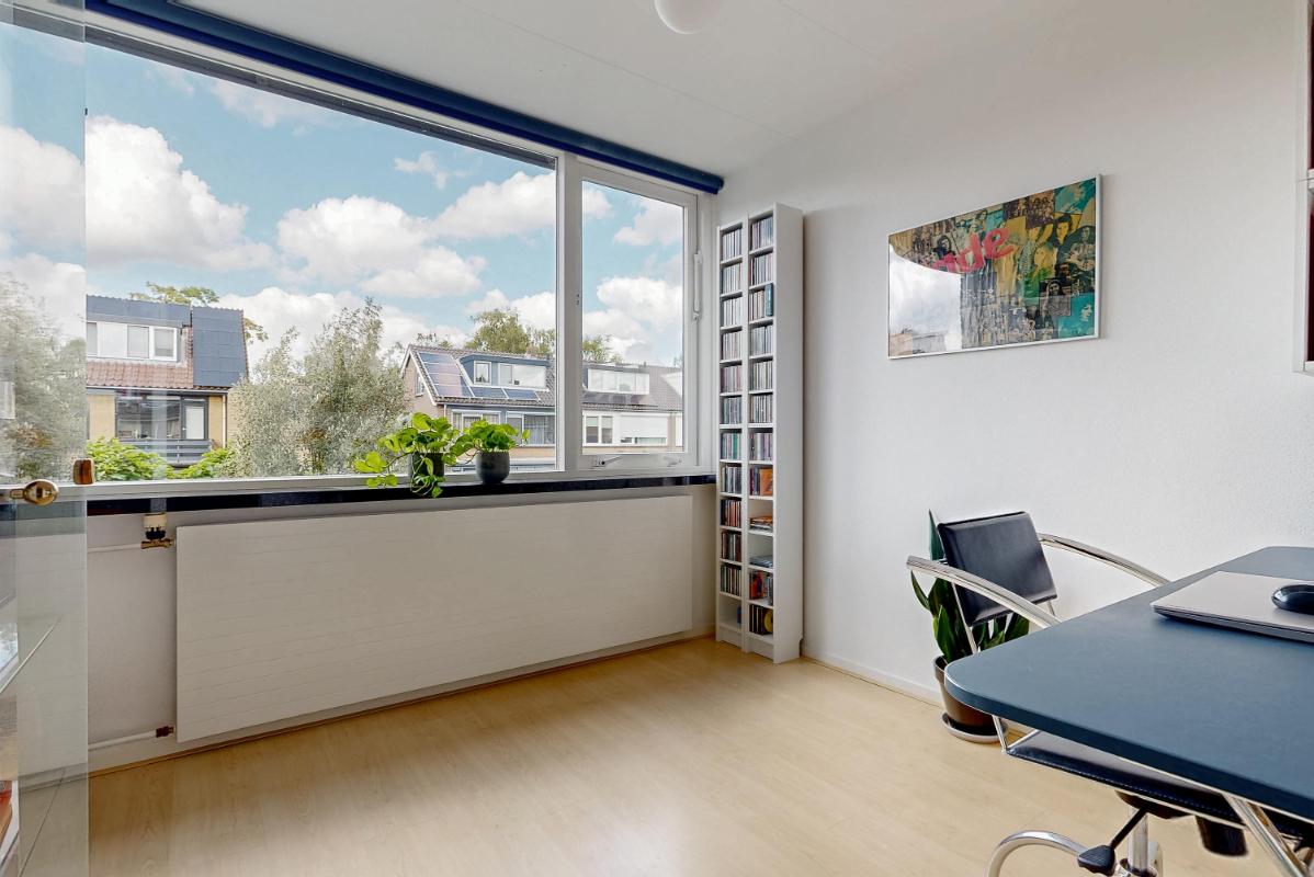 De tweede verdieping biedt verrassend veel licht en ruimte dankzij het dakraam aan de voorzijde en de grote dakkapel aan de achterzijde. Hier vindt u een riante vierde slaapkamer met eigen wastafel, dakraam en bergruimte achter de knieschotten. De vierde slaapkamer is dusdanig royaal dat deze te splitsen is in twee kamers. Op de overloop bevinden zich de cv-installatie en de aansluitingen voor wasmachine en droger. Ook hier is extra bergruimte aanwezig, zowel achter de knieschotten als op de geïsoleerde vliering in de nok van het huis. Ook vindt u hier een prettige en lichte werkplek, geschikt voor werk of hobby, met uitzicht over de achtertuin.