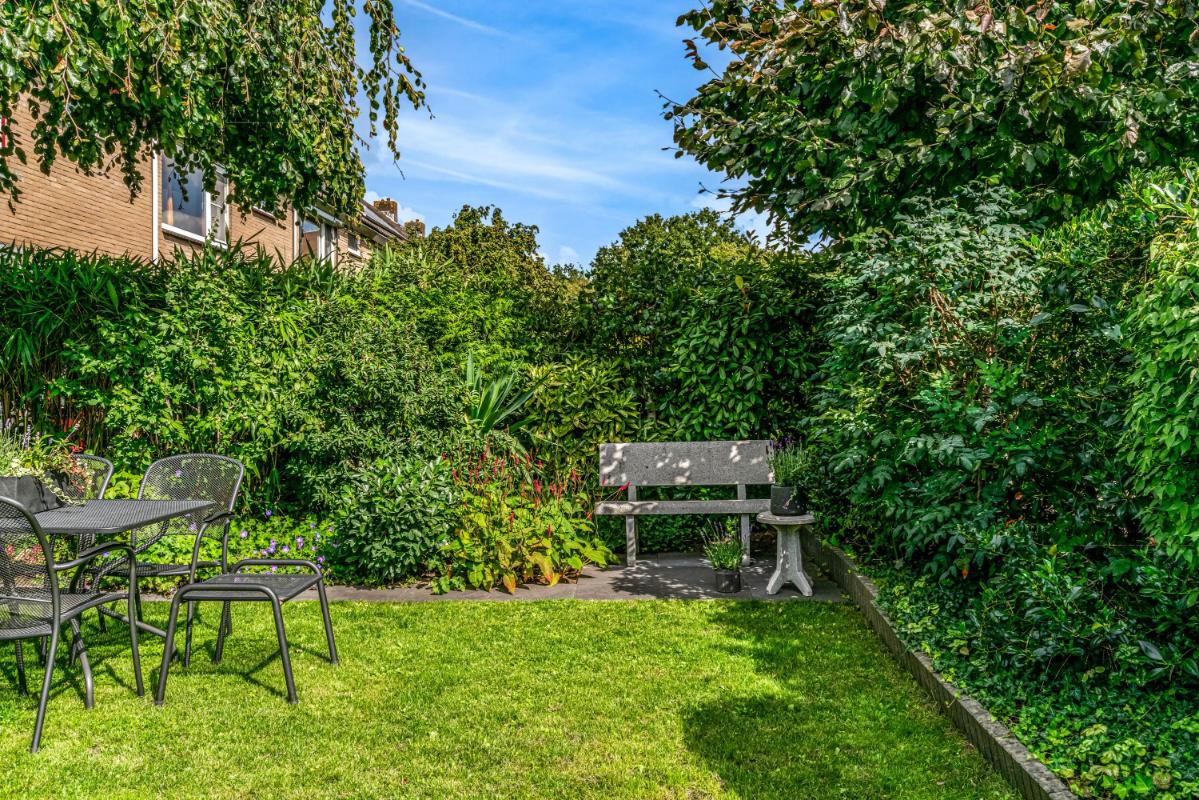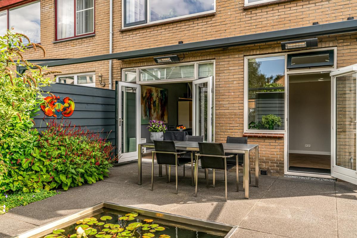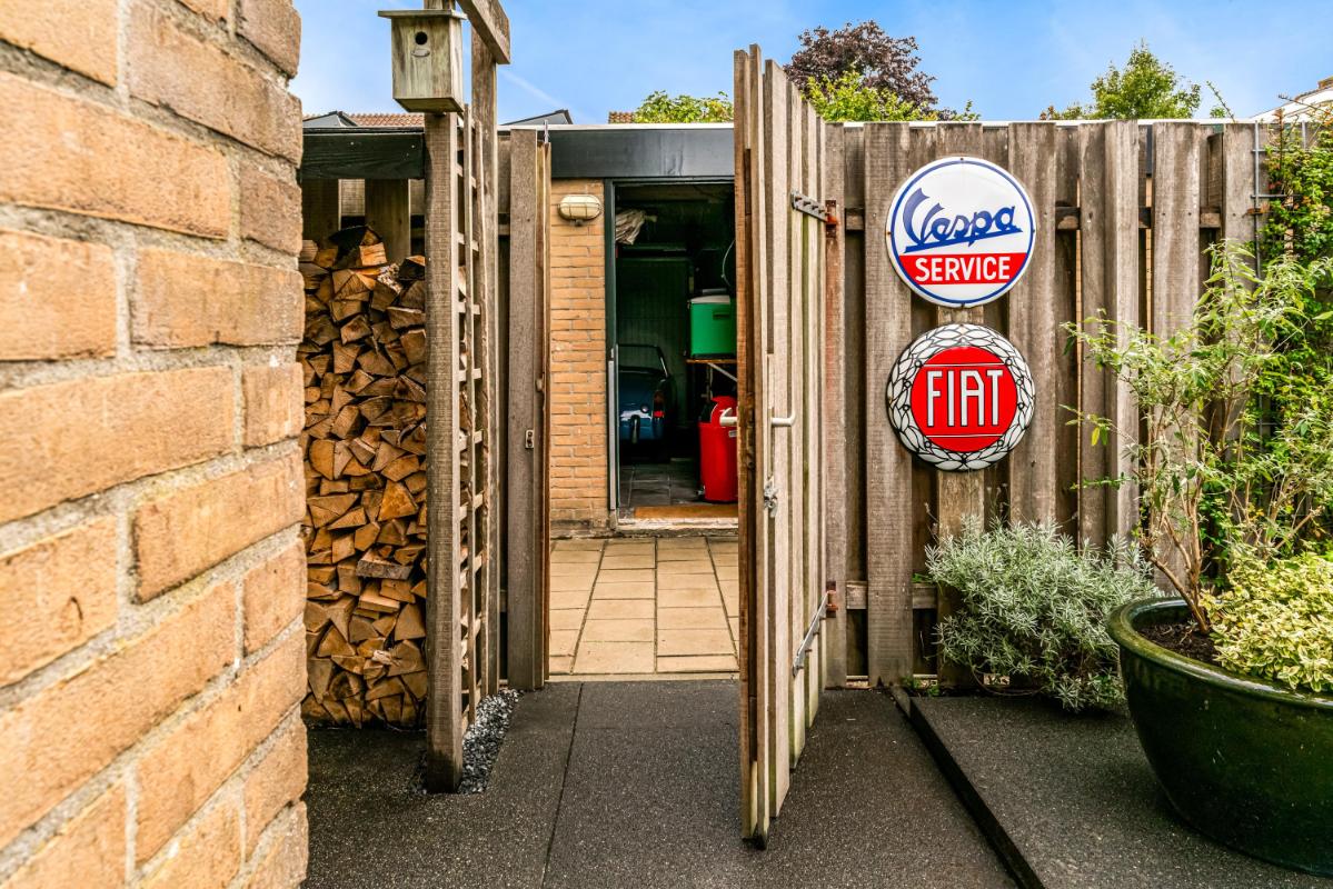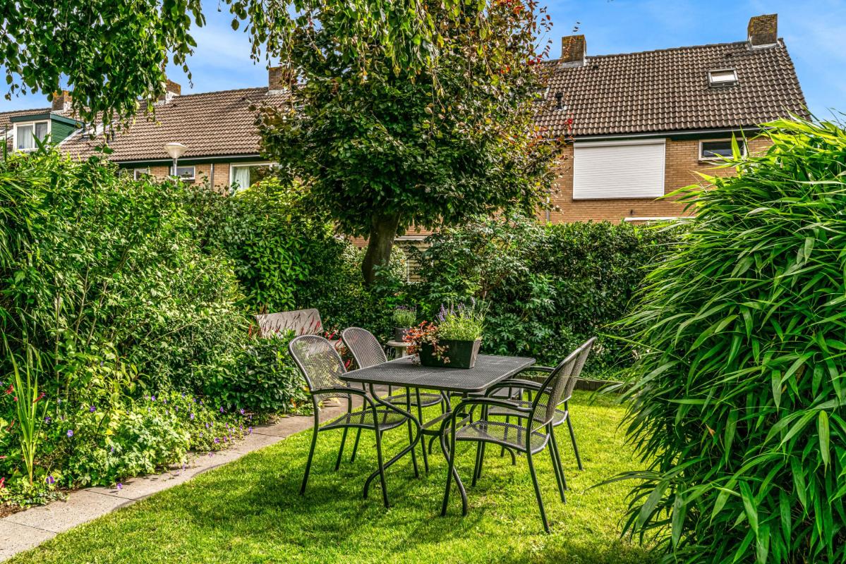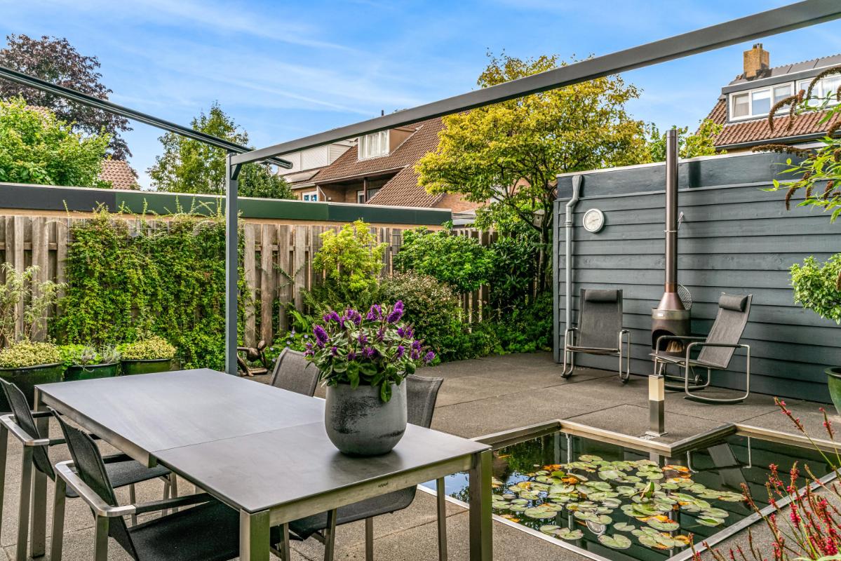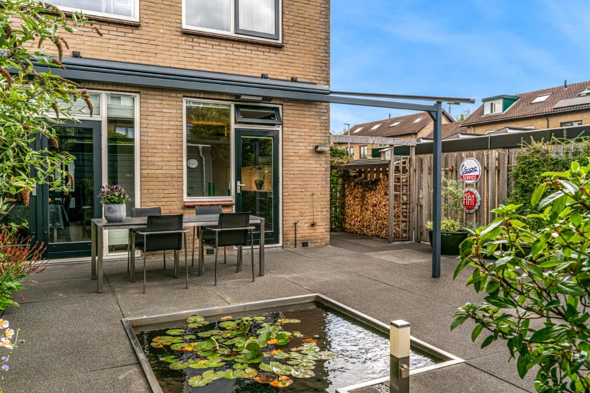 De voortuin, gelegen op het zuidoosten, biedt veel privacy. Heerlijk om een boek te lezen en te eten in de ochtendzon! De achtertuin is een heerlijke plek om te ontspannen. Een vijver, elektra-aansluiting en een waterpunt maken de achtertuin praktisch en comfortabel. Het ruime elektrische zonnescherm creëert een fijne zitplek met verlichting en verwarming. Daarnaast is er een vrijstaande stenen berging, mooi afgetimmerd, met lichtkoepel en elektra. De achtertuin beschikt over een achterom en biedt toegang tot de steeg. Voor wie extra ruimte nodig heeft, is er naast de woning een garagebox optioneel bij te kopen, voorzien van elektra en een elektrische deur (kadastraal aangeduid: Woerden A 3676). De garage is direct te bereiken vanuit de zijtuin.