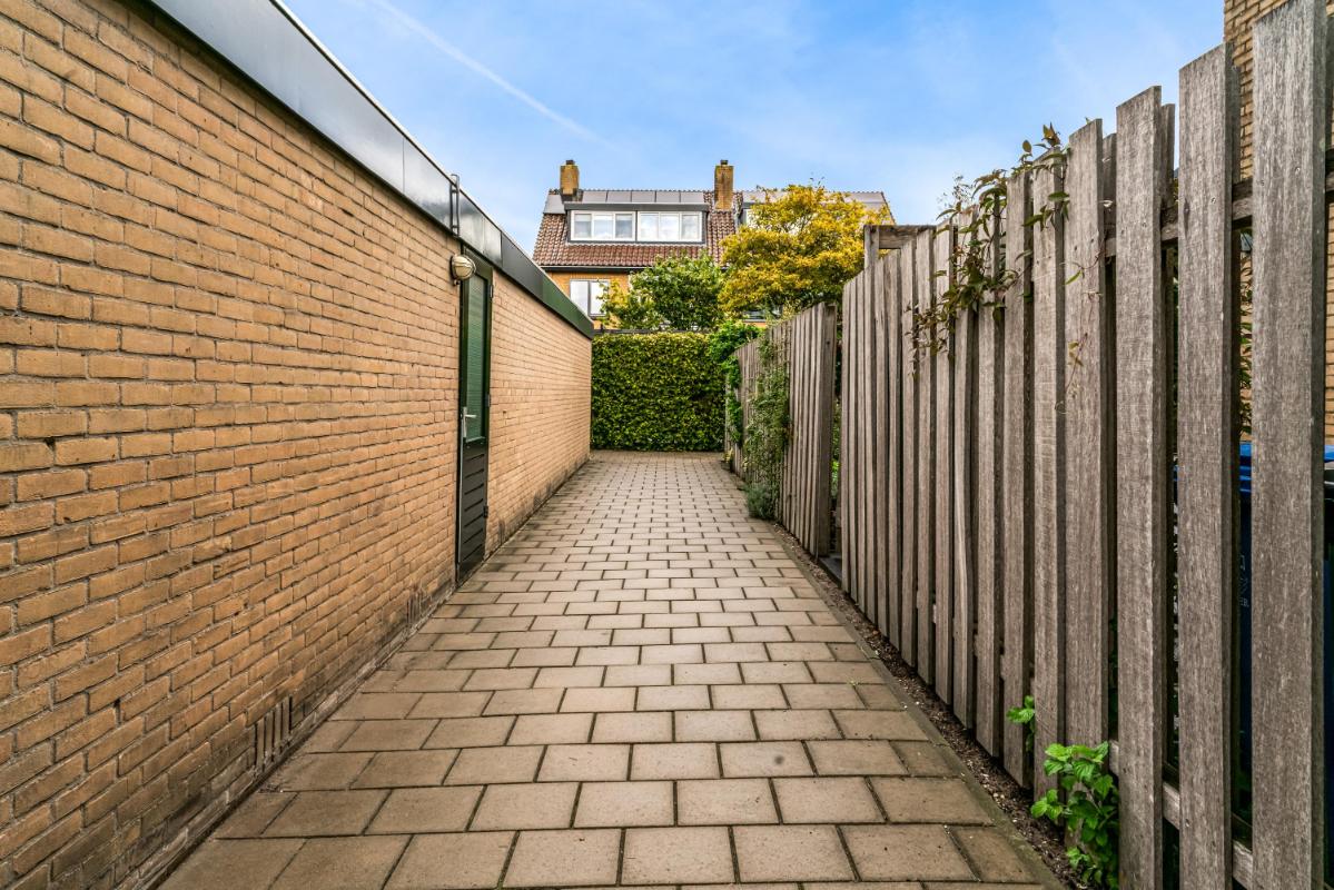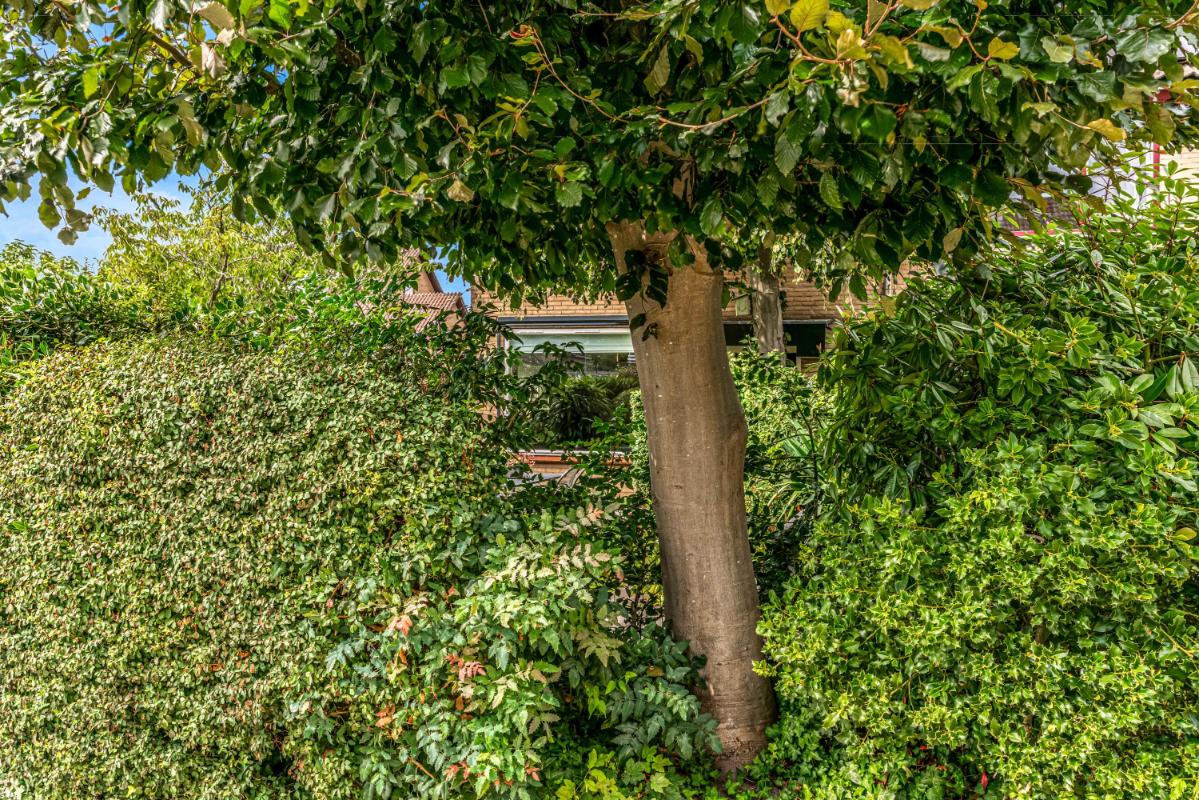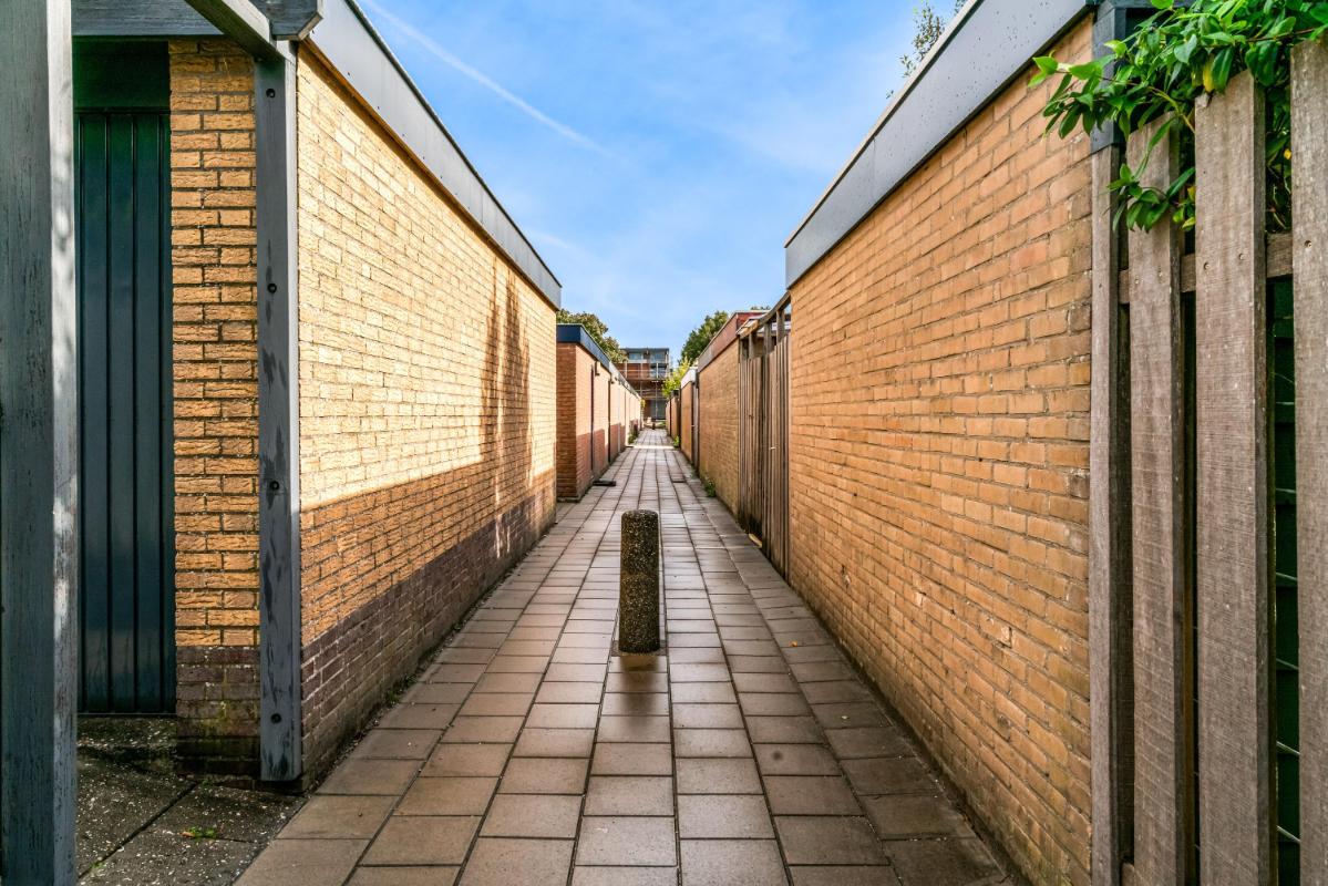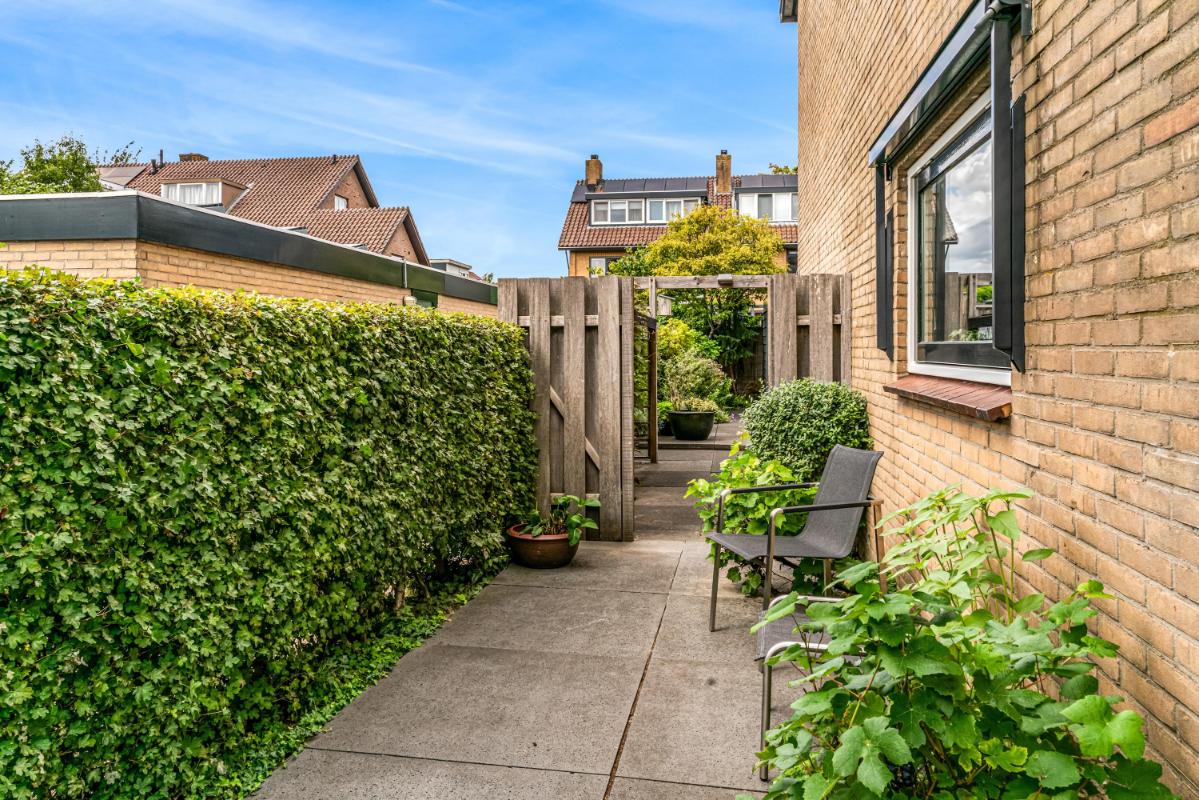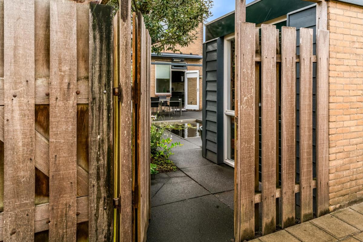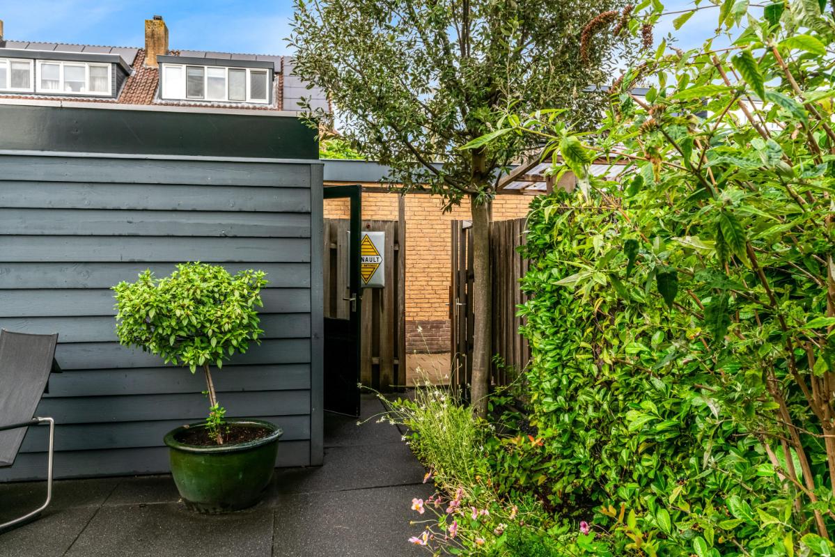 De voortuin, gelegen op het zuidoosten, biedt veel privacy. Heerlijk om een boek te lezen en te eten in de ochtendzon! De achtertuin is een heerlijke plek om te ontspannen. Een vijver, elektra-aansluiting en een waterpunt maken de achtertuin praktisch en comfortabel. Het ruime elektrische zonnescherm creëert een fijne zitplek met verlichting en verwarming. Daarnaast is er een vrijstaande stenen berging, mooi afgetimmerd, met lichtkoepel en elektra. De achtertuin beschikt over een achterom en biedt toegang tot de steeg. Voor wie extra ruimte nodig heeft, is er naast de woning een garagebox optioneel bij te kopen, voorzien van elektra en een elektrische deur (kadastraal aangeduid: Woerden A 3676). De garage is direct te bereiken vanuit de zijtuin.