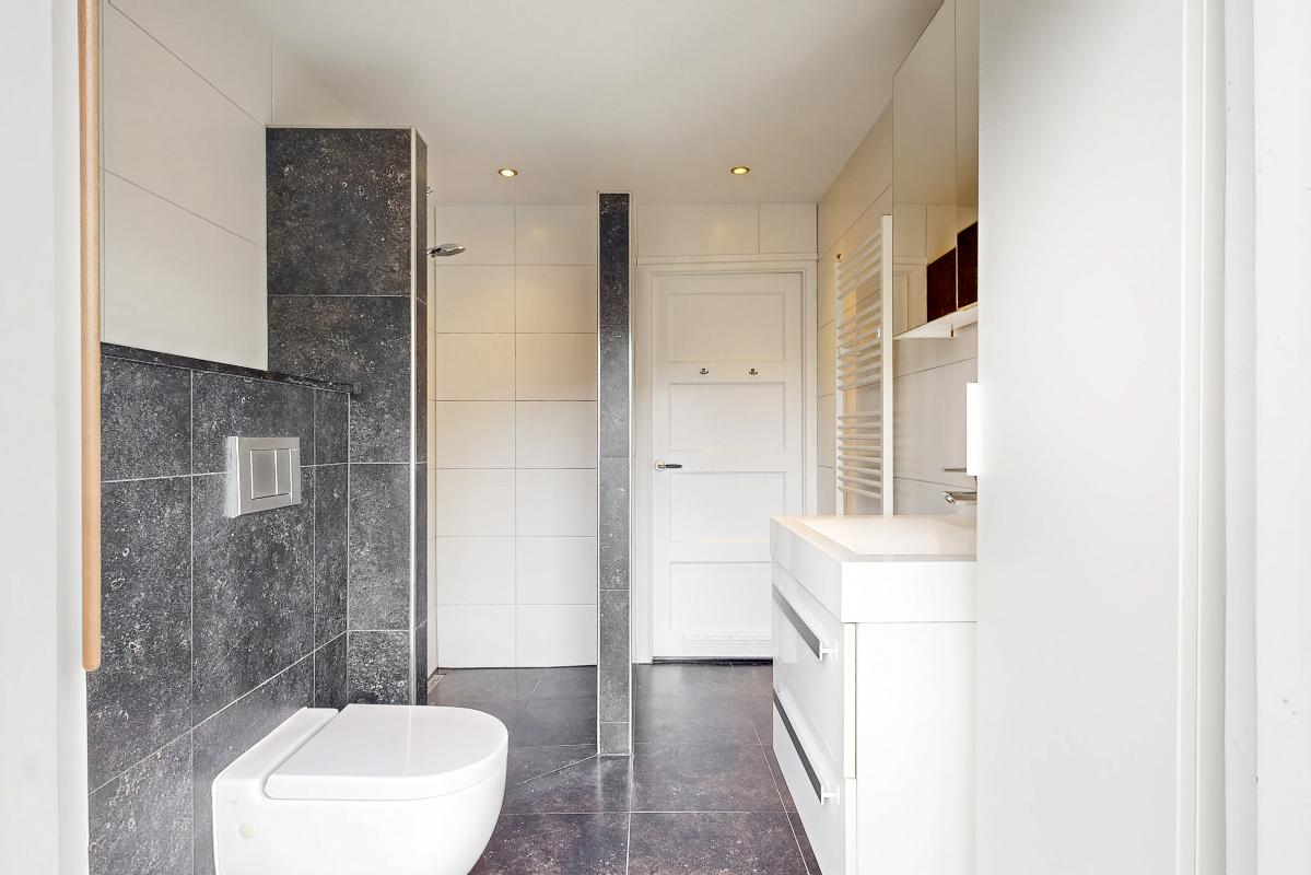 De badkamer is compleet uitgevoerd met een inloopdouche, toilet, wastafel met meubel, designradiator en een praktische wandkast. De mechanische ventilatie is in 2025 geïnstalleerd. Vanuit de badkamer heb je toegang tot het gedeelde dakterras.