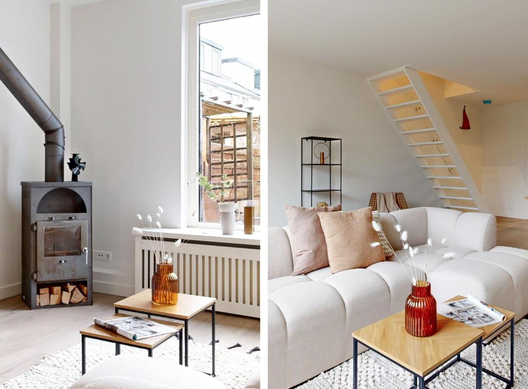 Je komt binnen in de entree met meterkast en toilet. Vanuit hier stap je de woonkamer in. De begane grond is voorzien van vloerverwarming en een nieuwe pvc-vloer, wat direct zorgt voor een warme en moderne uitstraling. Dankzij het extra zijraam profiteer je hier van veel natuurlijk licht. De houtkachel maakt het plaatje compleet en zorgt voor extra sfeer tijdens koude dagen.