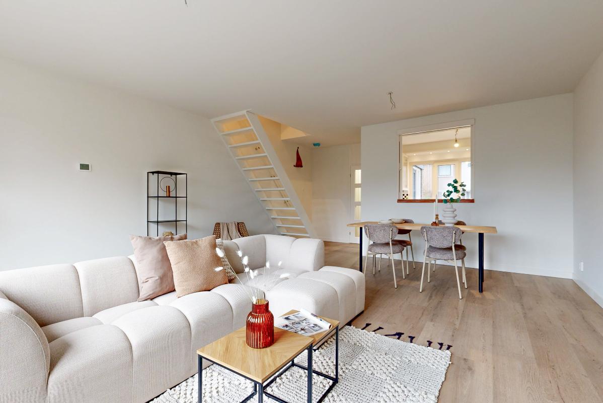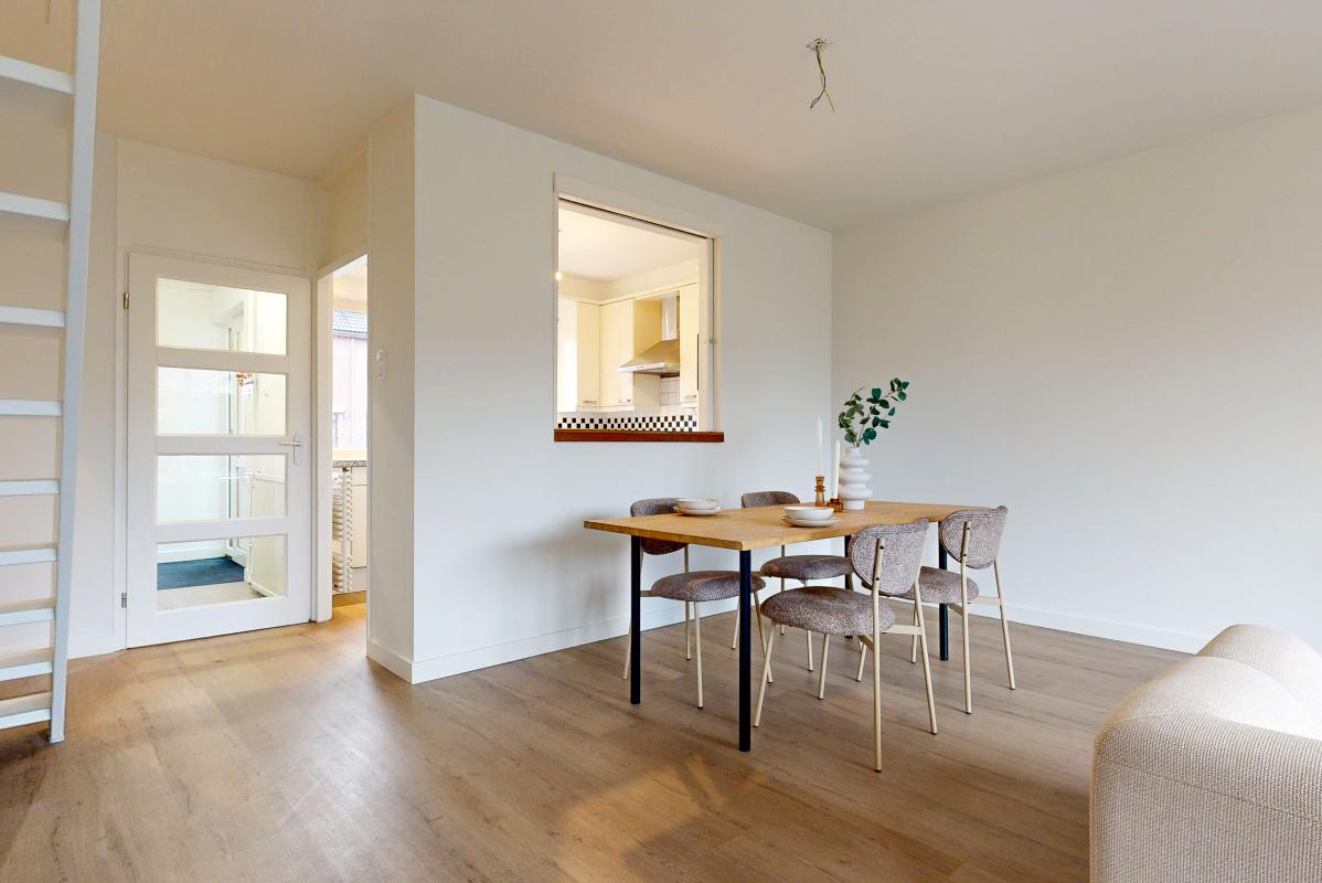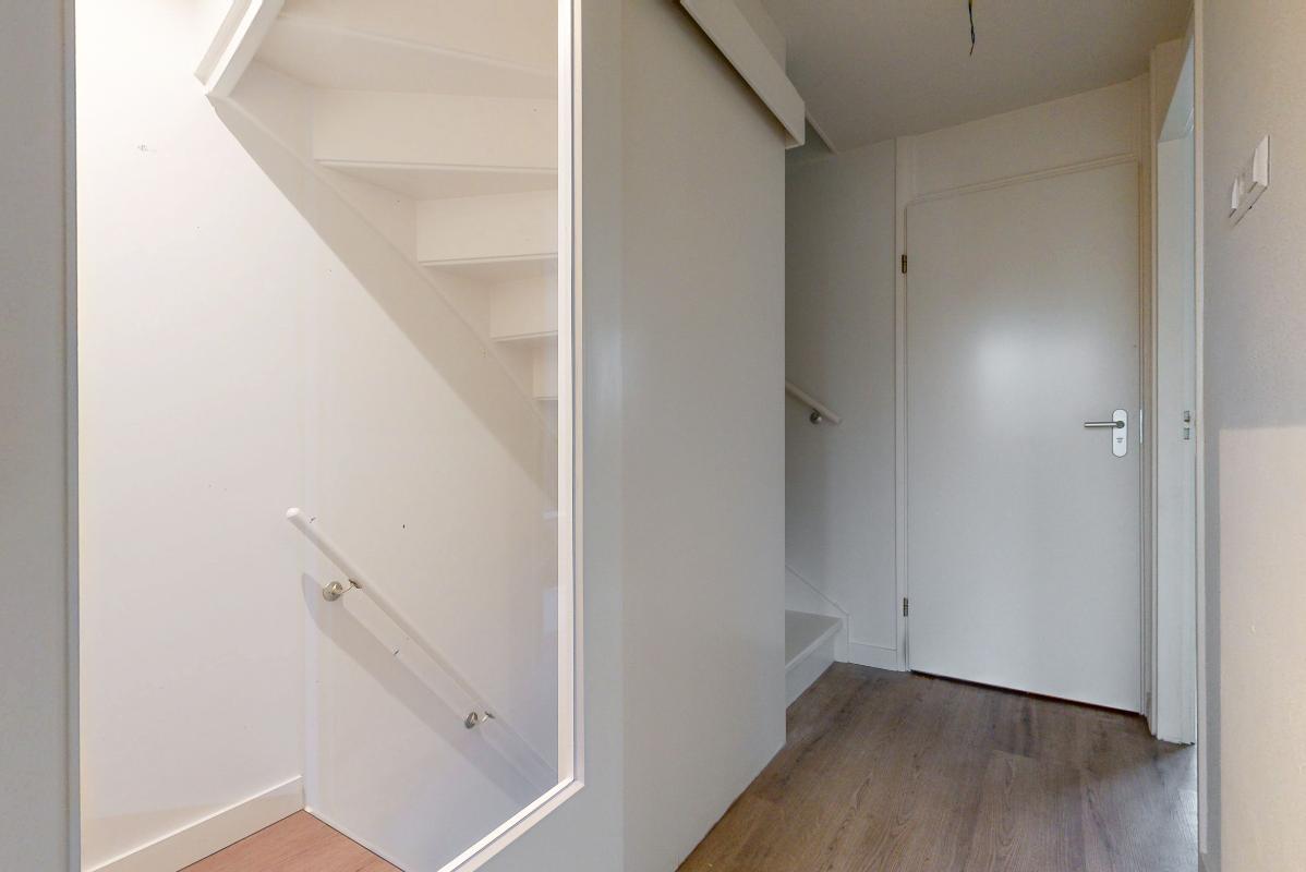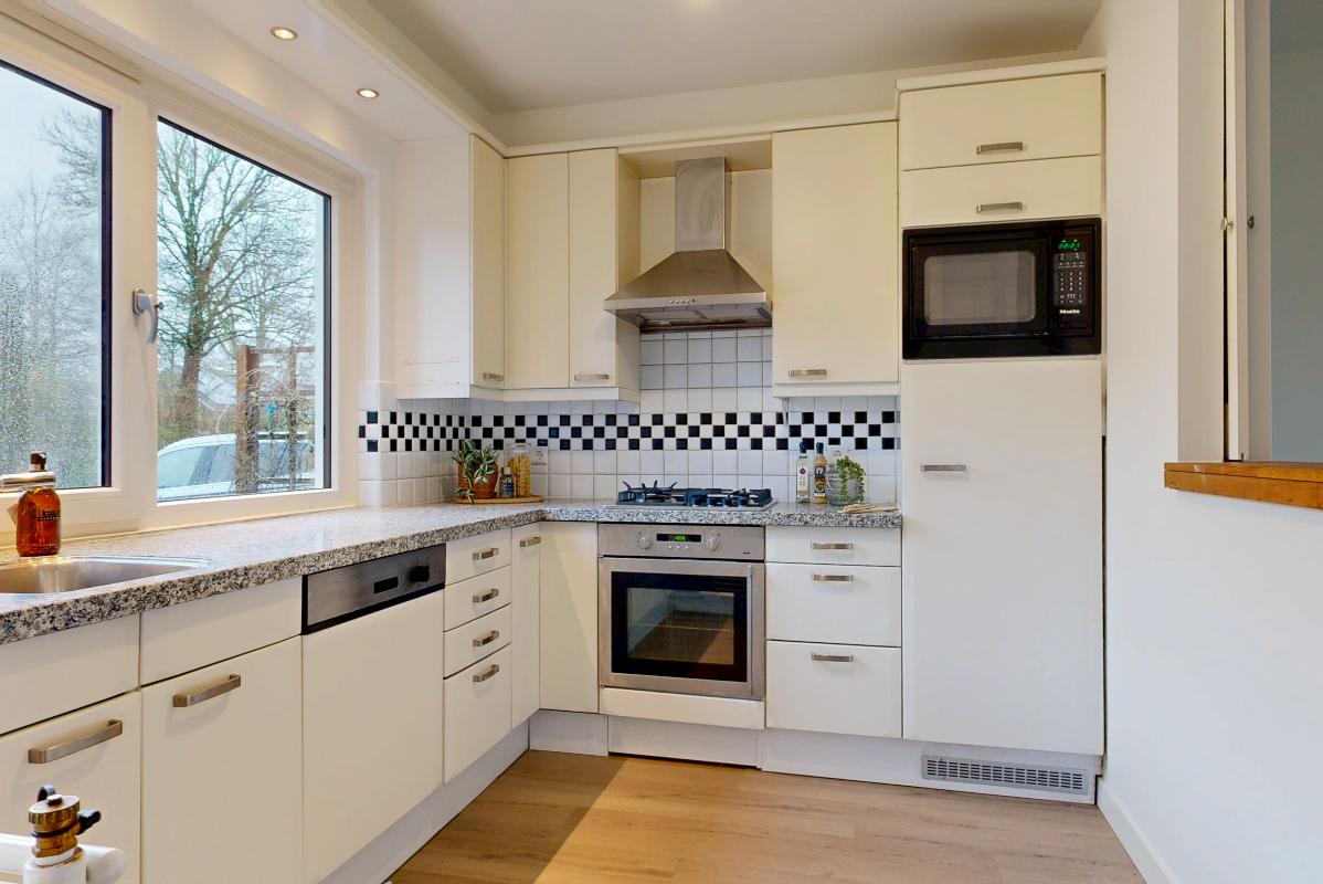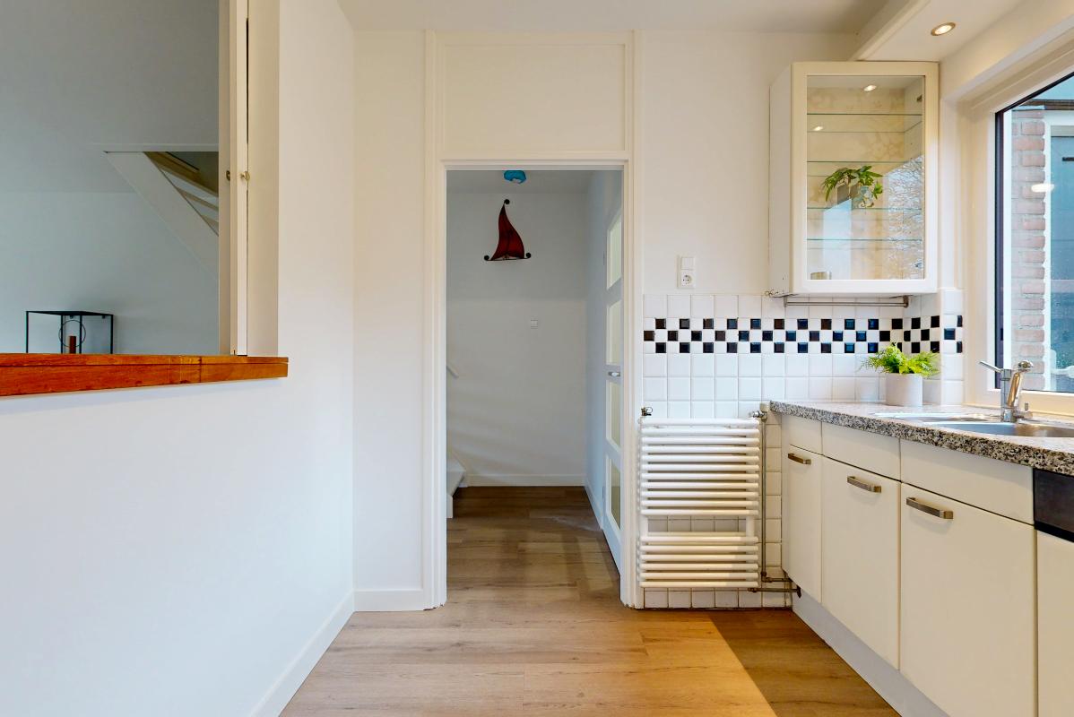 De dichte keuken is praktisch ingericht en voorzien van inbouwapparatuur. Tussen de keuken en de woonkamer zit een doorkijk met schuifdeuren, waardoor je de ruimtes makkelijk met elkaar verbindt of juist afsluit. Vanuit de woonkamer loop je via de deur zo de achtertuin in. De trap naar de eerste verdieping bevindt zich eveneens in de woonkamer.