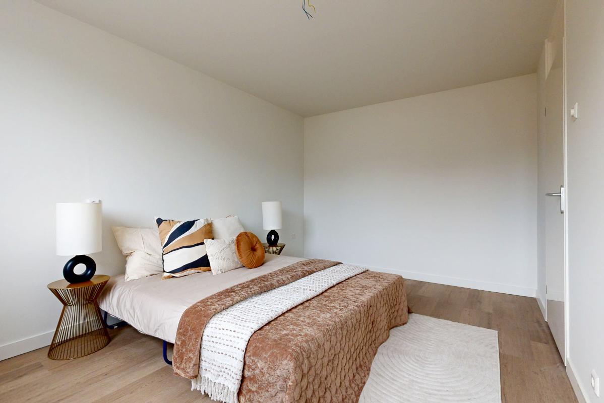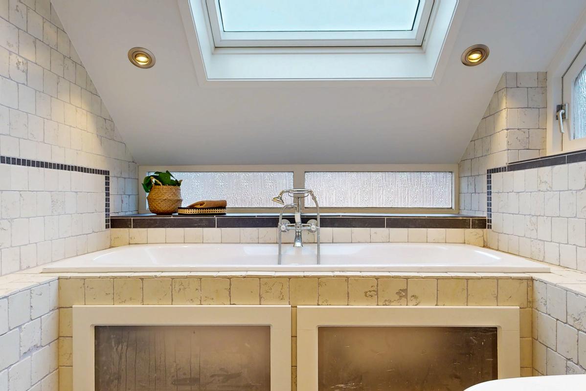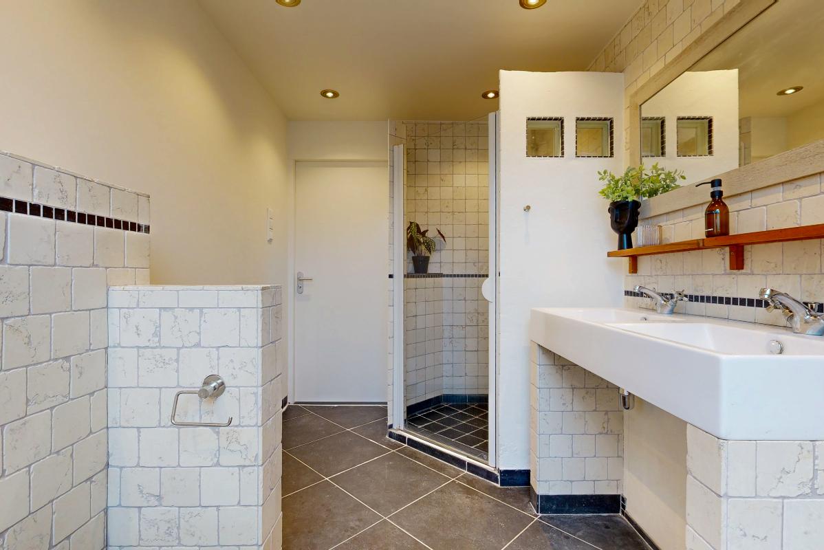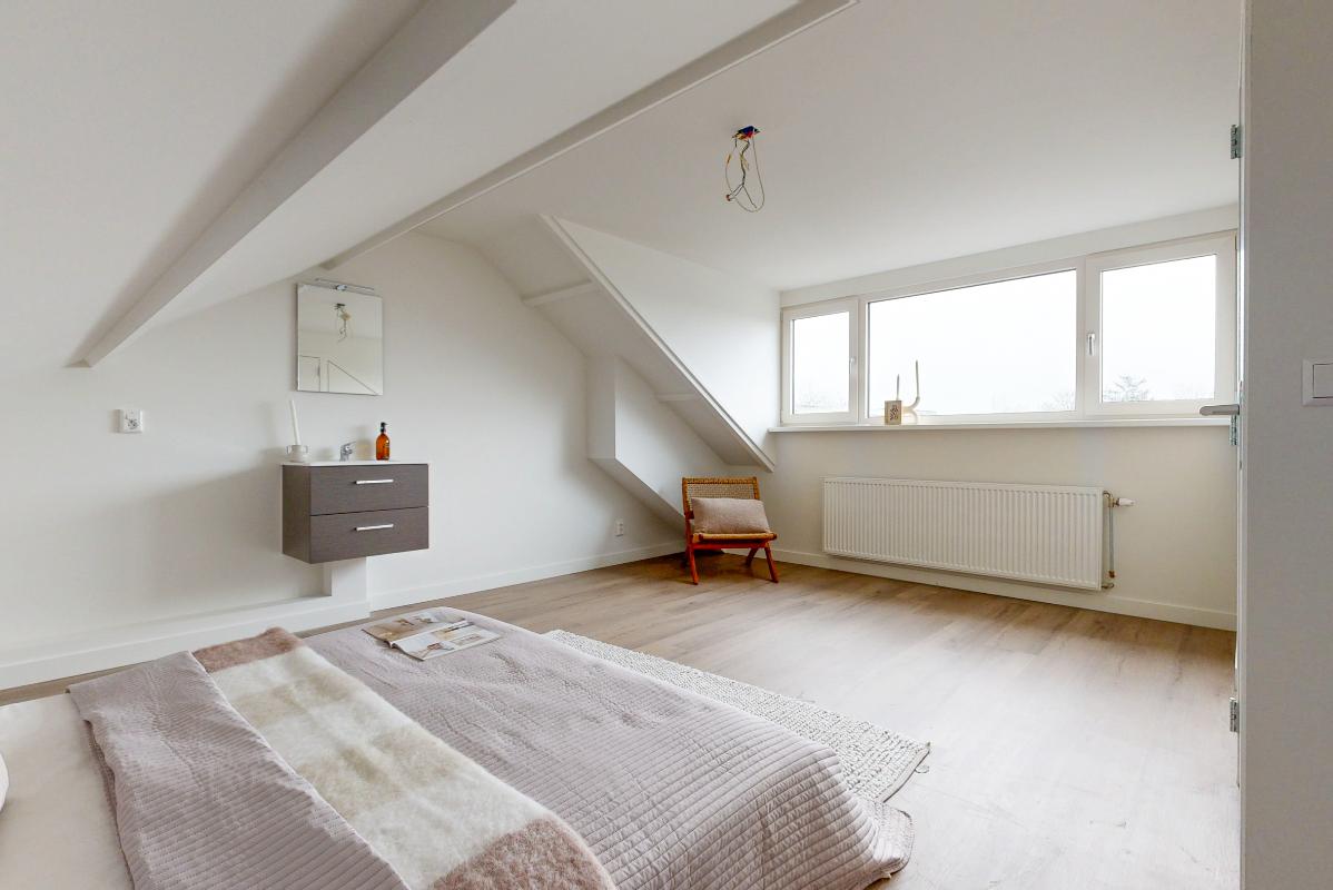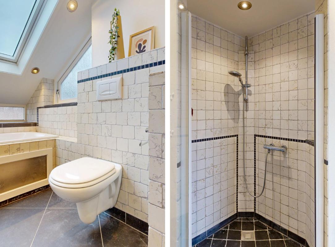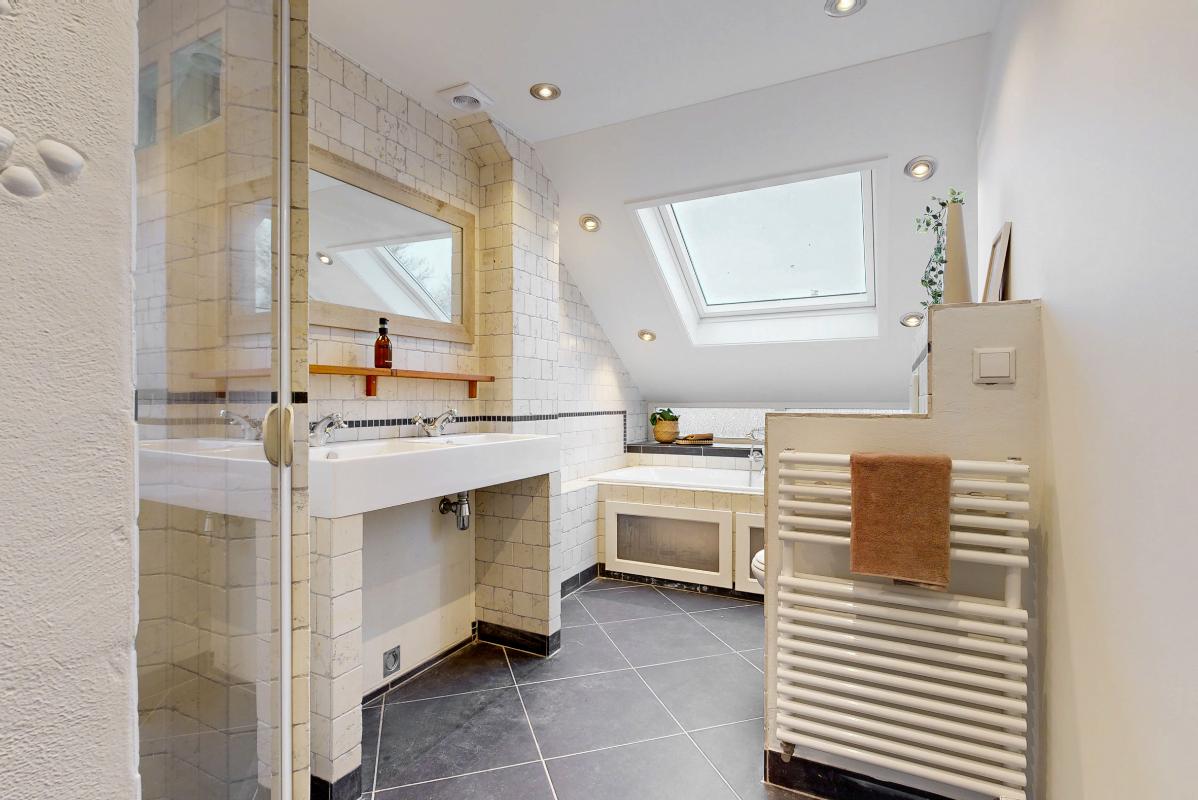 Op de eerste verdieping ligt een pvc-vloer en vind je drie slaapkamers en een royale badkamer. De badkamer is compleet uitgerust met vloerverwarming, een dakraam, ligbad, douche, brede wastafel en toilet.