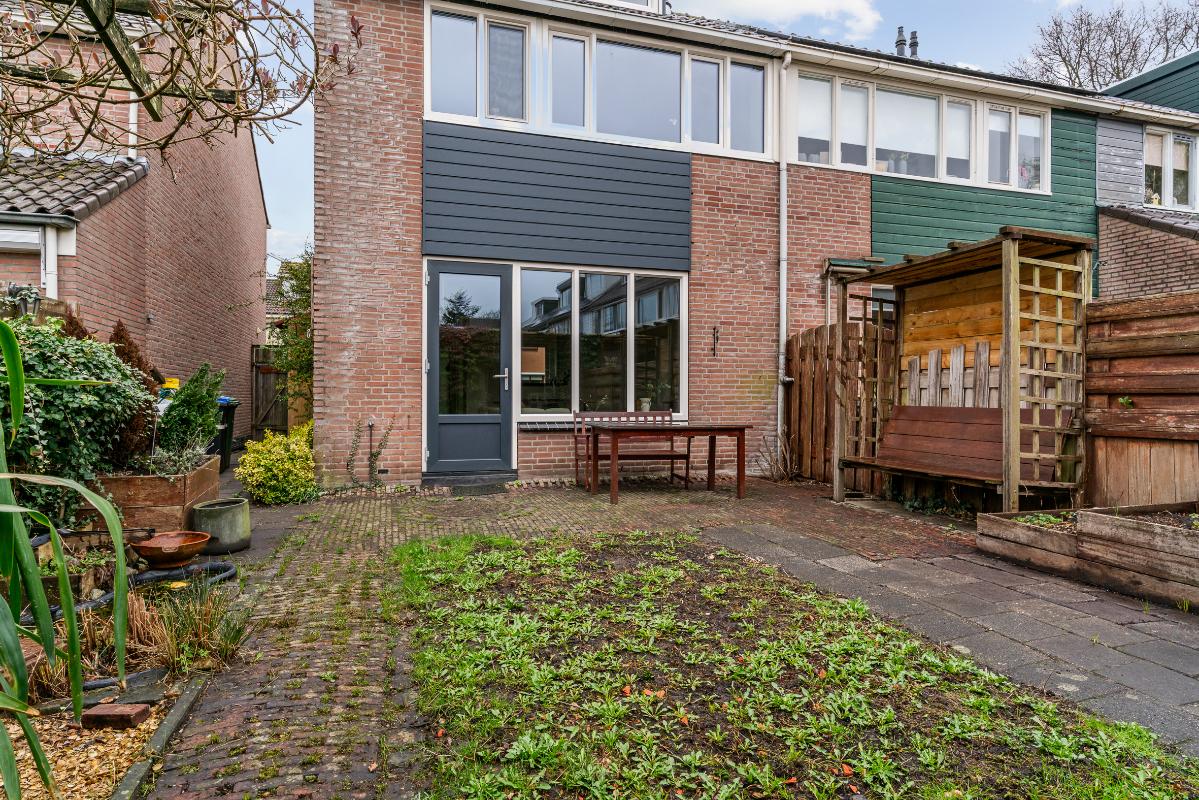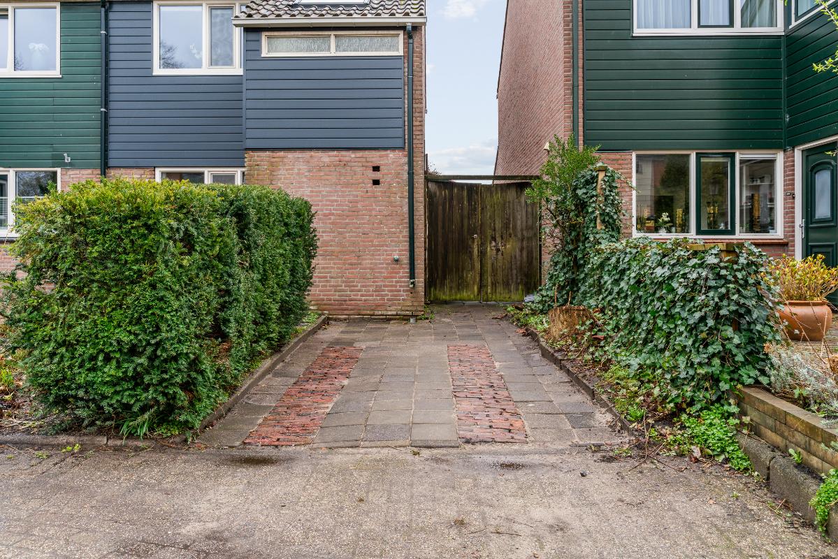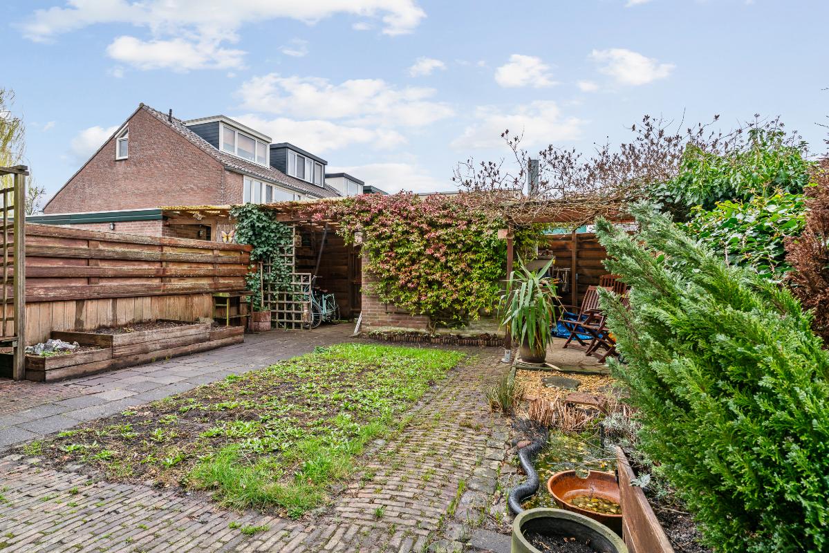 Buiten heb je een voor-, zij- en achtertuin. Op de oprit kun je één auto op eigen terrein parkeren. De achtertuin ligt op het zuidoosten, waardoor je hier heerlijk van de middagzon geniet. In de tuin heb je veel privacy en vind je een overkapping, een stenen berging en toegang via het achterom en via de zijtuin met houten deuren.