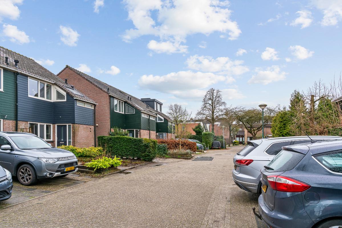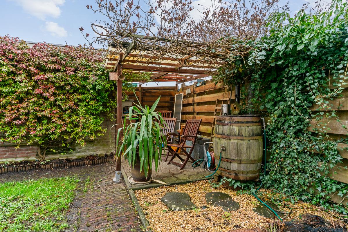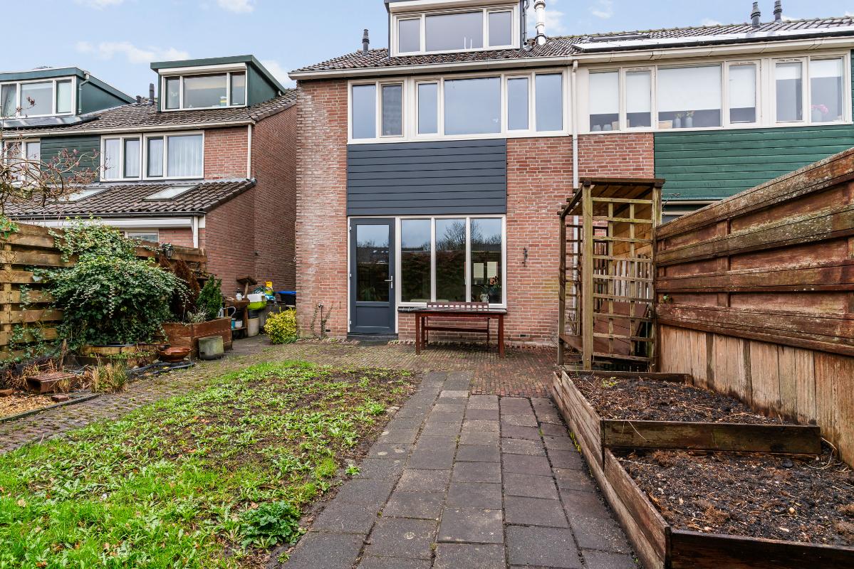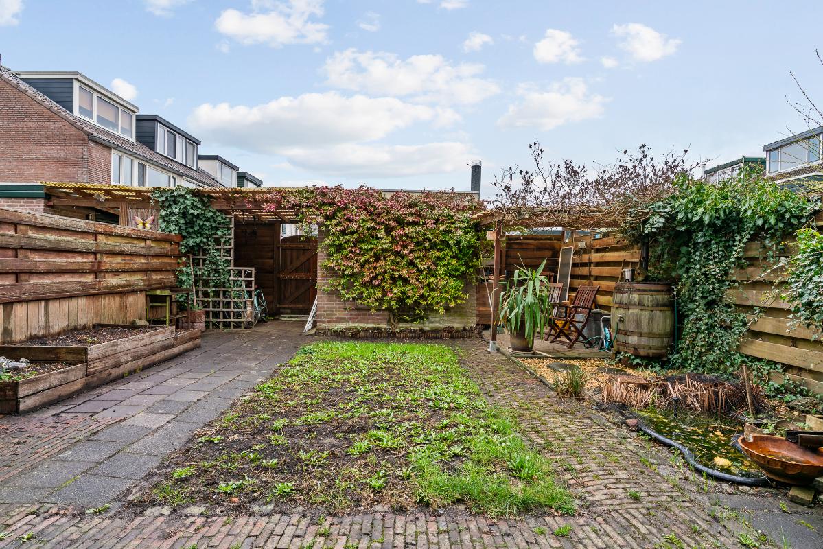 Buiten heb je een voor-, zij- en achtertuin. Op de oprit kun je één auto op eigen terrein parkeren. De achtertuin ligt op het zuidoosten, waardoor je hier heerlijk van de middagzon geniet. In de tuin heb je veel privacy en vind je een overkapping, een stenen berging en toegang via het achterom en via de zijtuin met houten deuren.