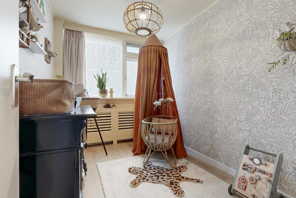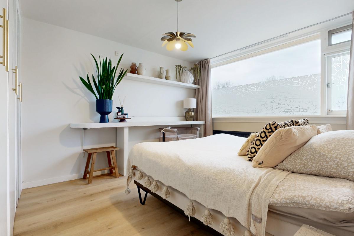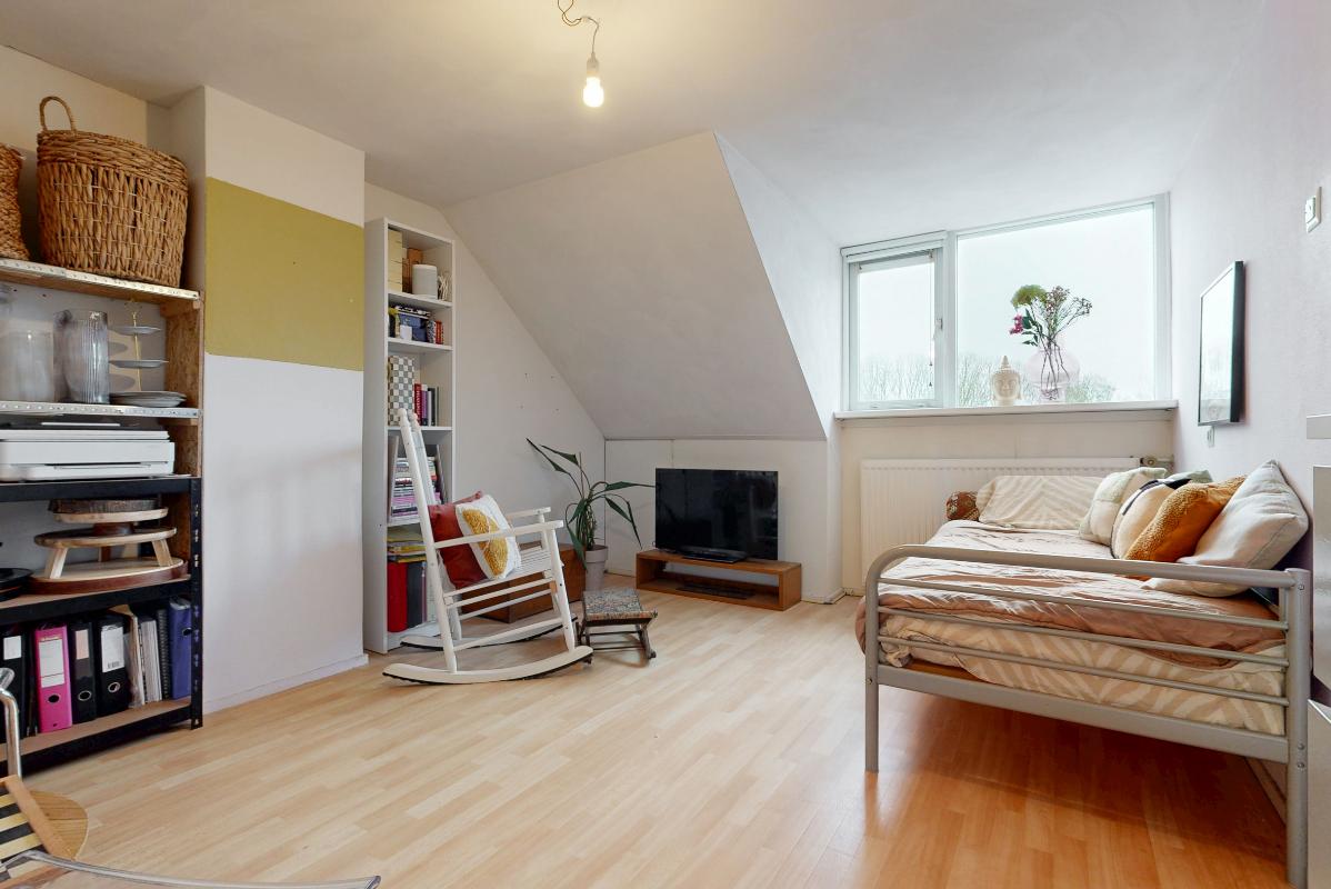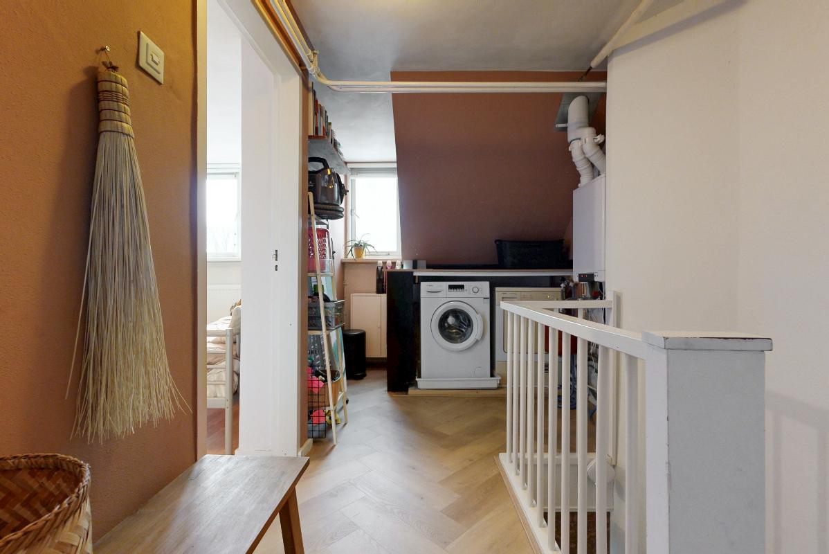 De tweede verdieping biedt een ruime overloop met witgoedaansluiting, cv-ketel en extra bergruimte. Daarnaast bevindt zich hier een vierde slaapkamer met dakkapel en praktische opbergruimte achter de knieschotten.