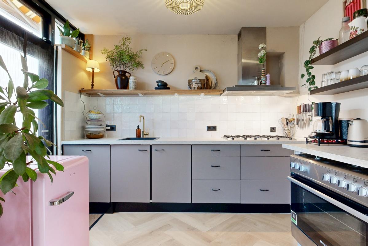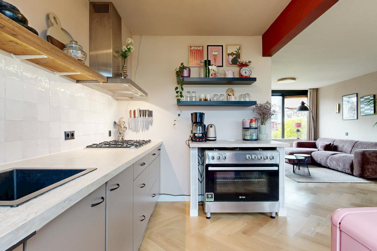 Bij binnenkomst tref je de entree met meterkast, toilet, trapkast en de trapopgang naar de eerste verdieping. De woonkamer is licht en ruim opgezet en valt direct op door de fraaie erker, die zorgt voor extra lichtinval en een sfeervolle uitstraling. De nette PVC-vloer geeft het geheel een moderne afwerking. De open keuken is praktisch ingericht met een 6-pits gaskookplaat, afzuigkap en vaatwasser. Vanuit de keuken heb je via een loopdeur direct toegang tot de zonnige achtertuin.
