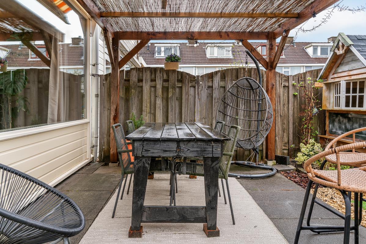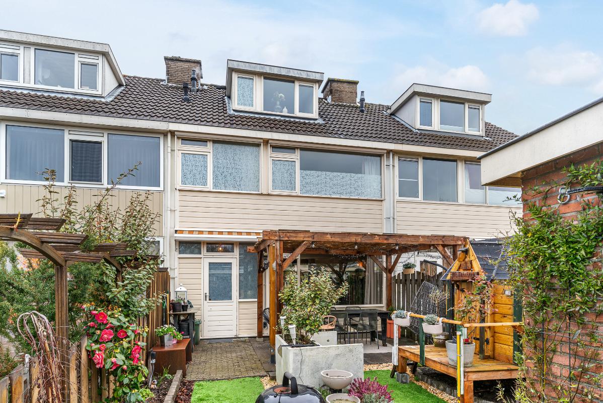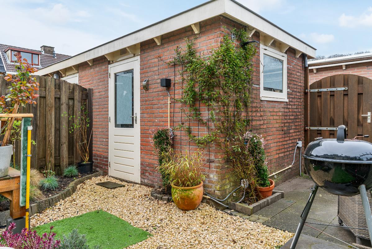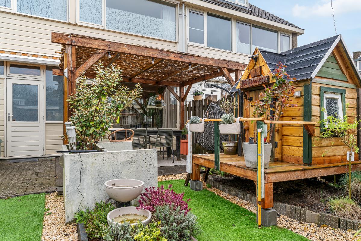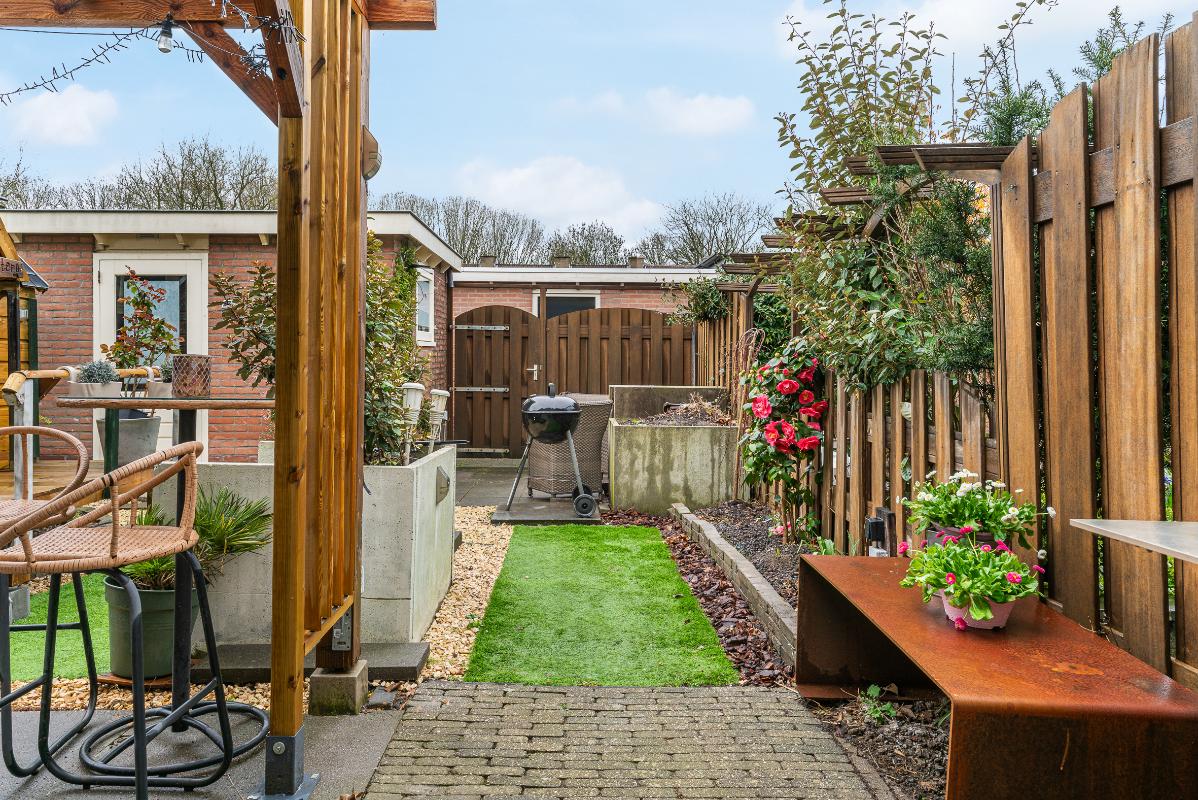 De achtertuin is gunstig gelegen op het zuiden en beschikt over een achterom en een berging voorzien van water en elektra. Het aanwezige zonnescherm zorgt voor extra comfort op zonnige dagen.