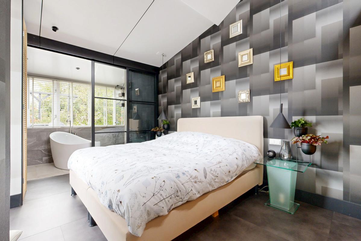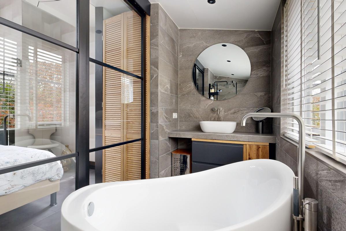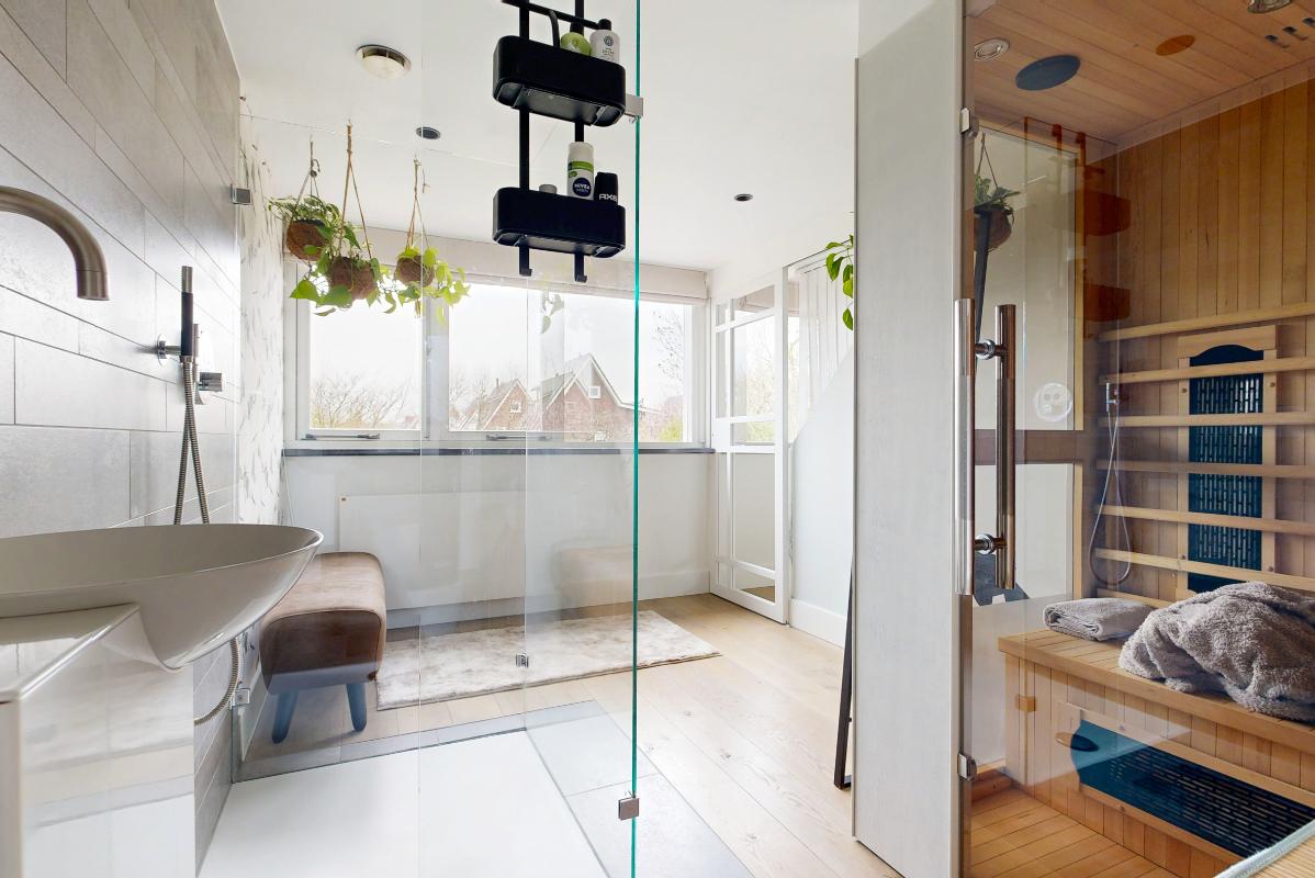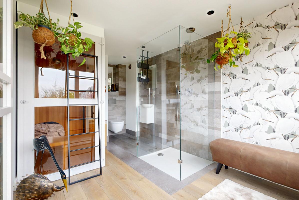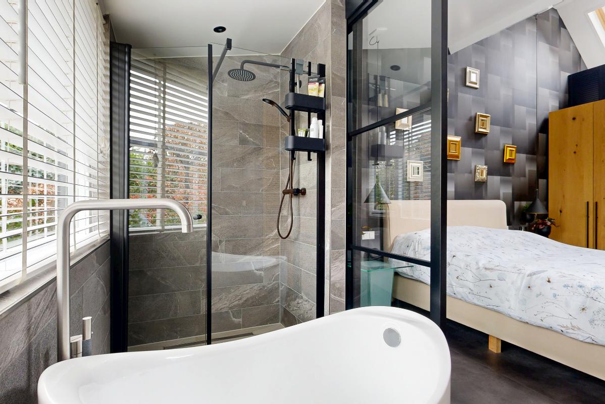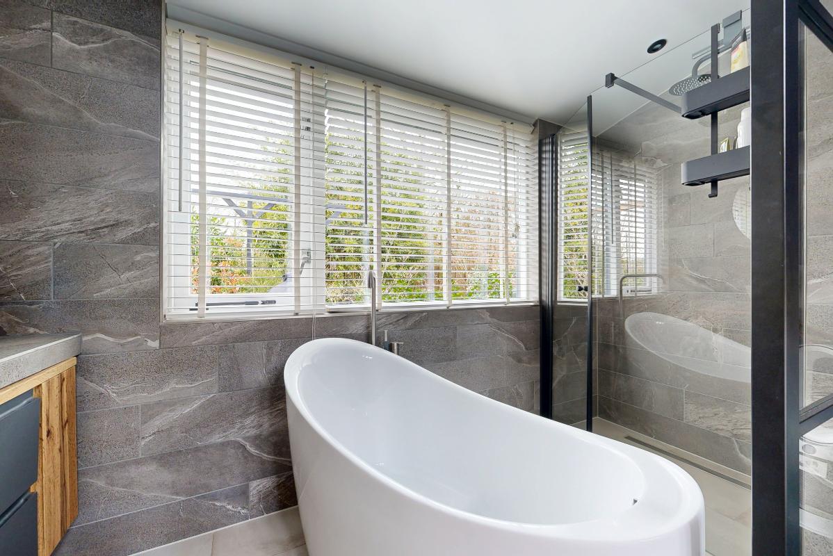 Beneden slapen en baden? Dat kan! Aan de achterzijde vind je een ruime slaapkamer voorzien van PVC vloer met vloerverwarming. Via stijlvolle ensuite deuren bereik je de luxe badkamer met een vrijstaand zitbad, inloopdouche en wastafelmeubel. In het plafond zitten sfeervolle inbouwspots. In deze ruimte kun je elke dag heerlijk tot rust komen.