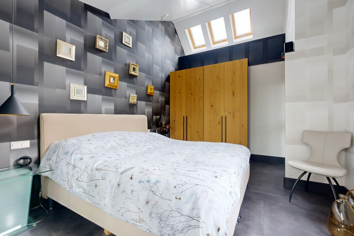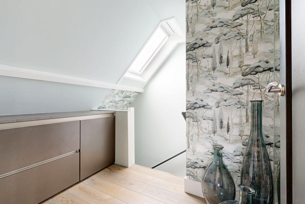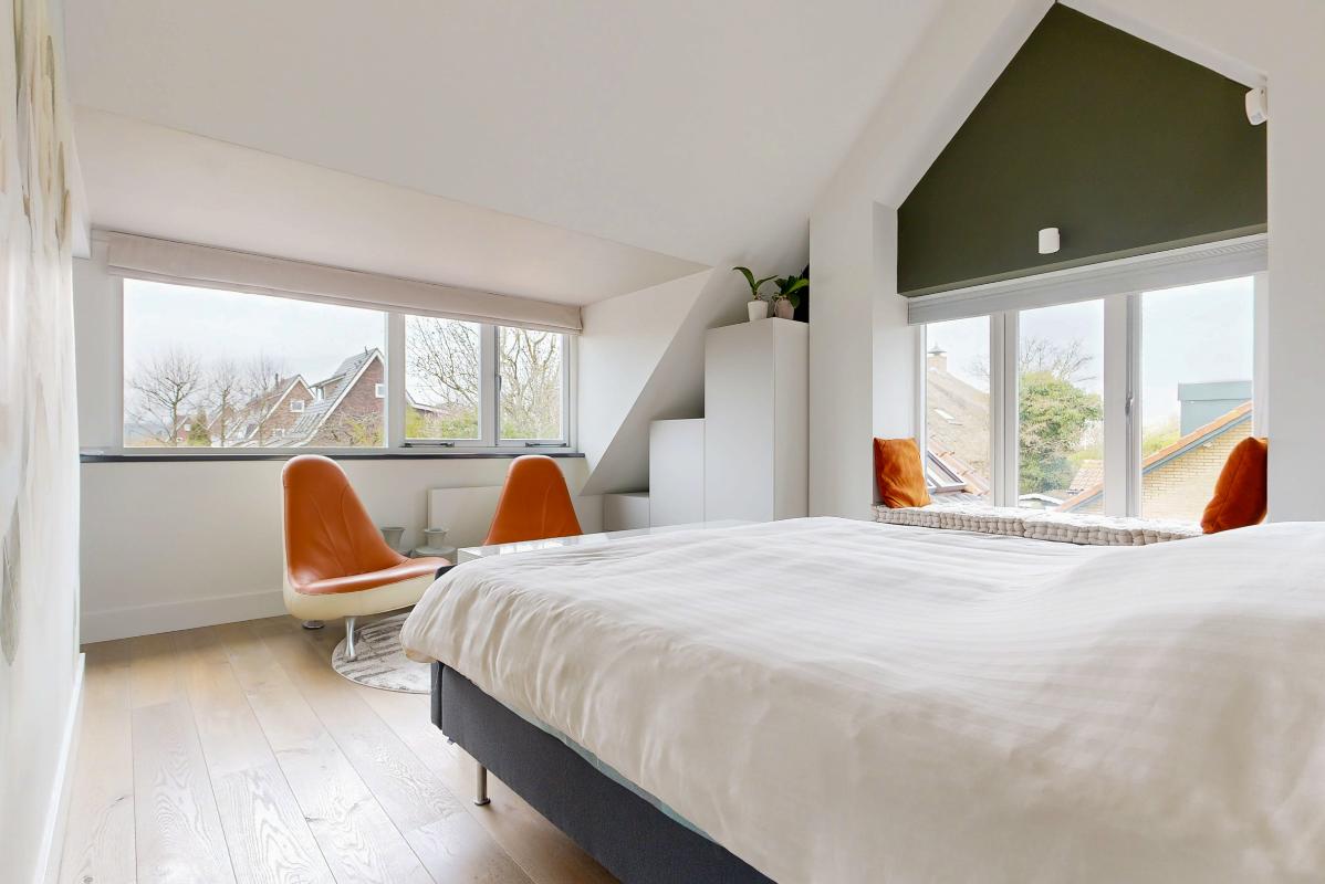 Op de eerste verdieping kom je op een lichte overloop met Velux dakraam. Vanaf de overloop is er toegang tot een praktische vliering. Ook bevindt zich op deze verdieping een royale slaapkamer met twee inloopkasten en een tweede badkamer. Deze badkamer is uitgerust met een inloopdouche, toilet en wastafelmeubel. De brede dakkapel aan de achterzijde zorgt voor extra ruimte en licht en is voorzien van elektrische zonwering. Deze verdieping beschikt over een houten vloer en heeft eveneens vloerverwarming.