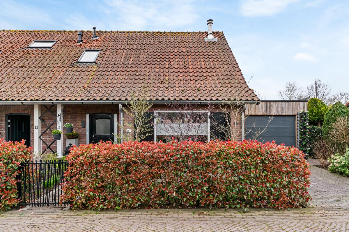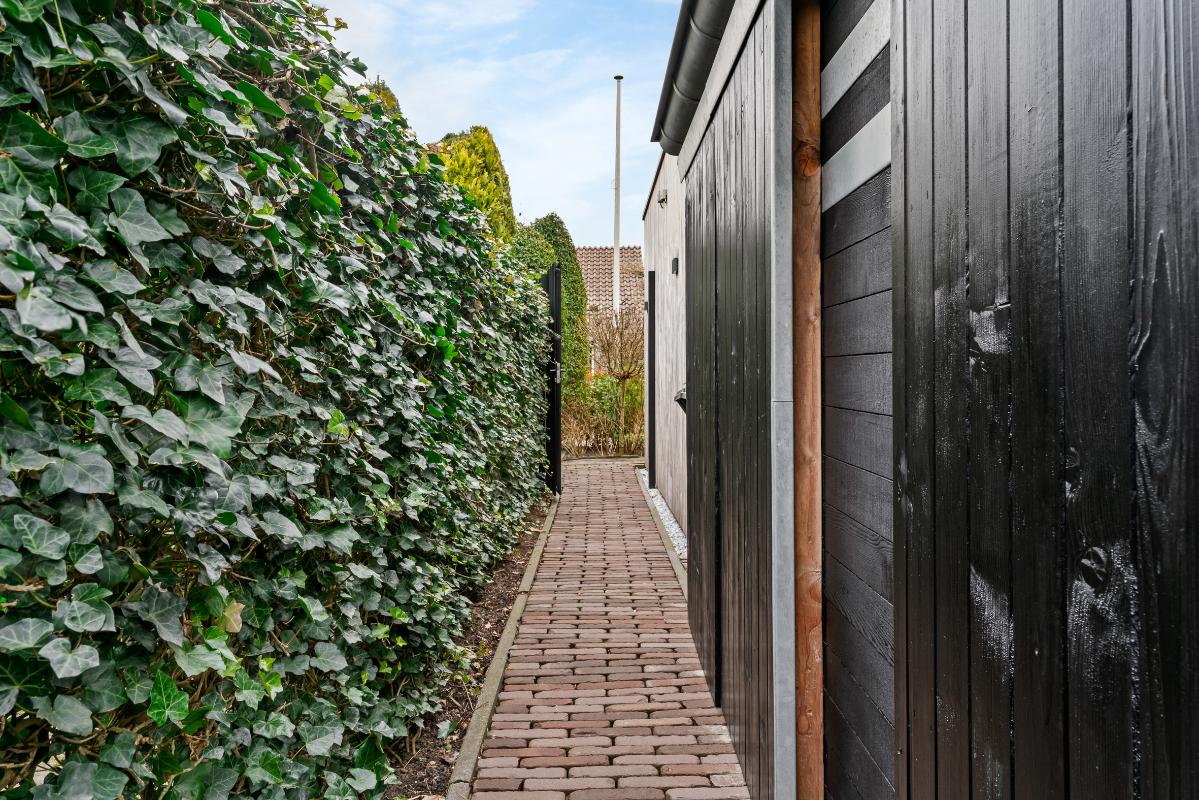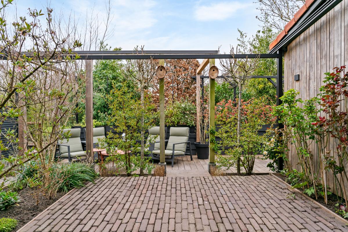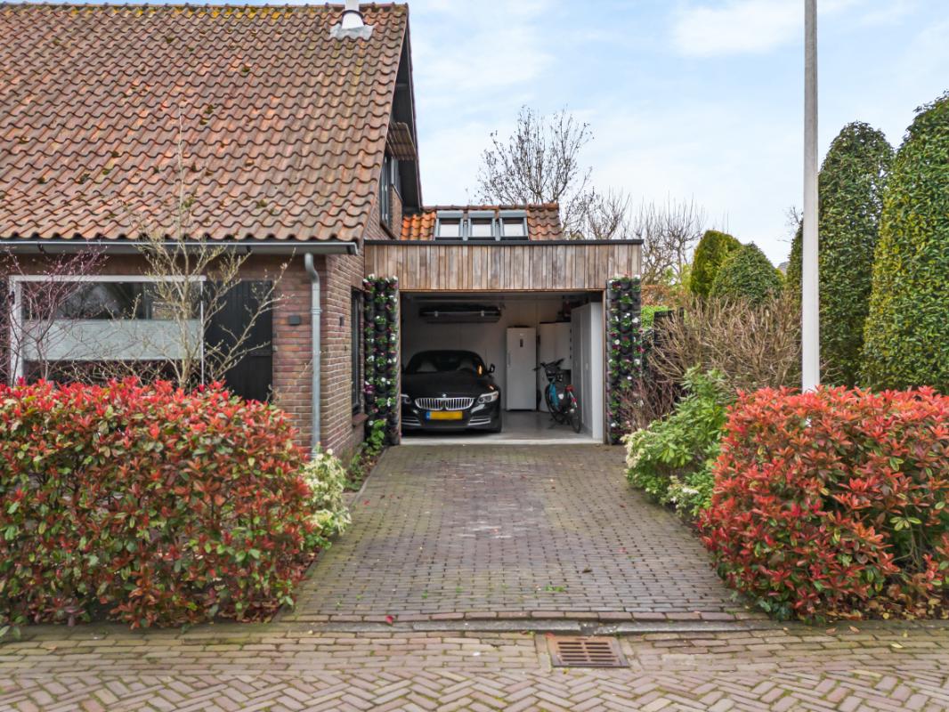 Via de openslaande deuren (met horren) stap je de zonnige achtertuin op het zuidwesten in. De tuin grenst aan het water en is fraai aangelegd met mooie beplanting. Dankzij het grote zonnescherm zit je hier altijd comfortabel, of je nu kiest voor zon of schaduw. Aan de zijkant van de woning vind je een stenen garage met sedum dak en een elektrische overheaddeur en een houten berging. Parkeren kan eenvoudig op de eigen oprit.