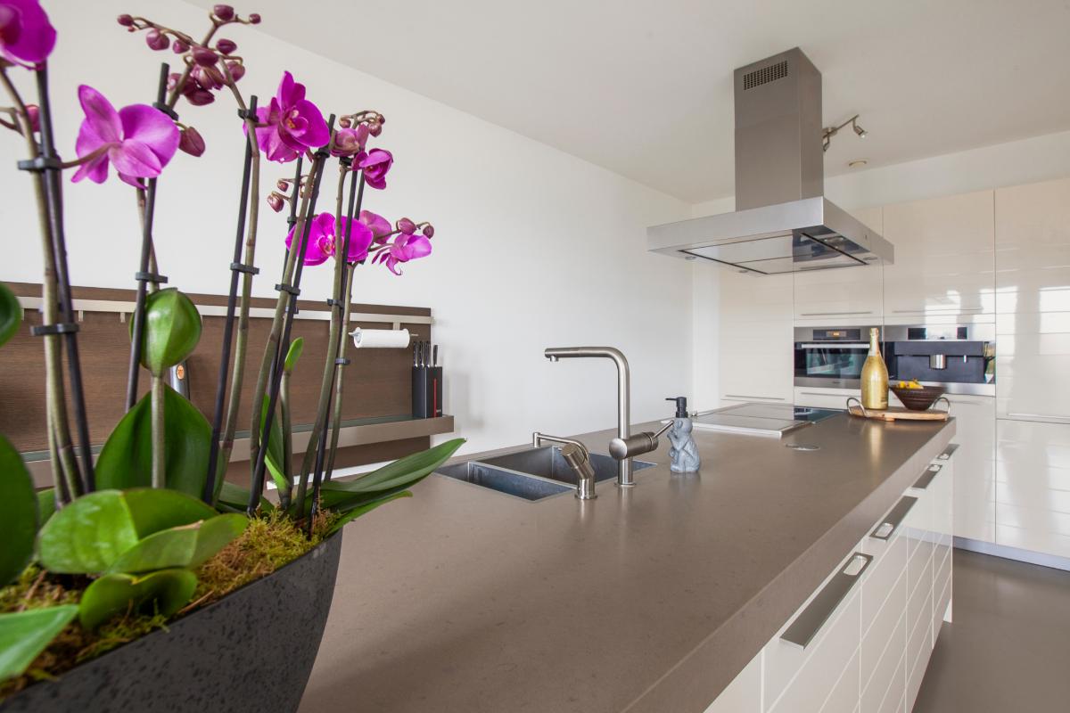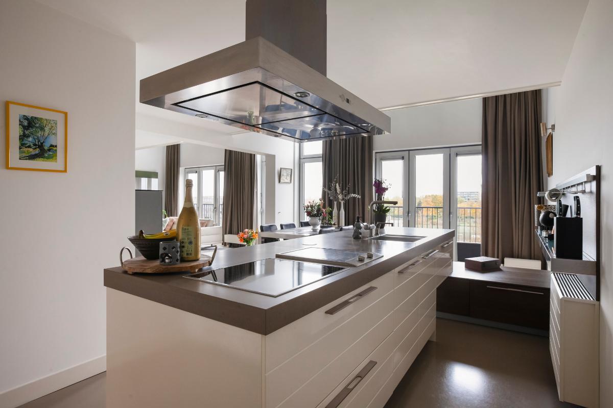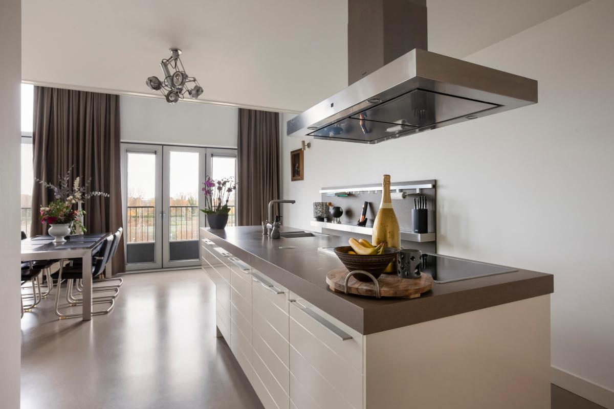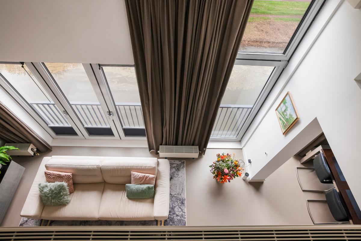 De woonkamer vormt zonder twijfel het stralende middelpunt van de woning. De indrukwekkende plafondhoogte en de prachtige vide zorgen voor een spectaculaire en ruimtelijke woonbeleving. Dankzij de grote raampartijen wordt de leefruimte overspoeld met natuurlijk daglicht, wat zorgt voor een lichte en uitnodigende sfeer. De moderne open keuken sluit hier naadloos op aan en vormt een stijlvolle en elegante plek om te koken en te genieten. De keuken is uitgevoerd met een kook- en spoeleiland, een strakke kastenwand en is voorzien van hoogwaardige inbouwapparatuur, waaronder een inductiekookplaat met afzuigkap, vaatwasser, koelkast, vriezer, combi-oven, Quooker en koffiezetapparaat.