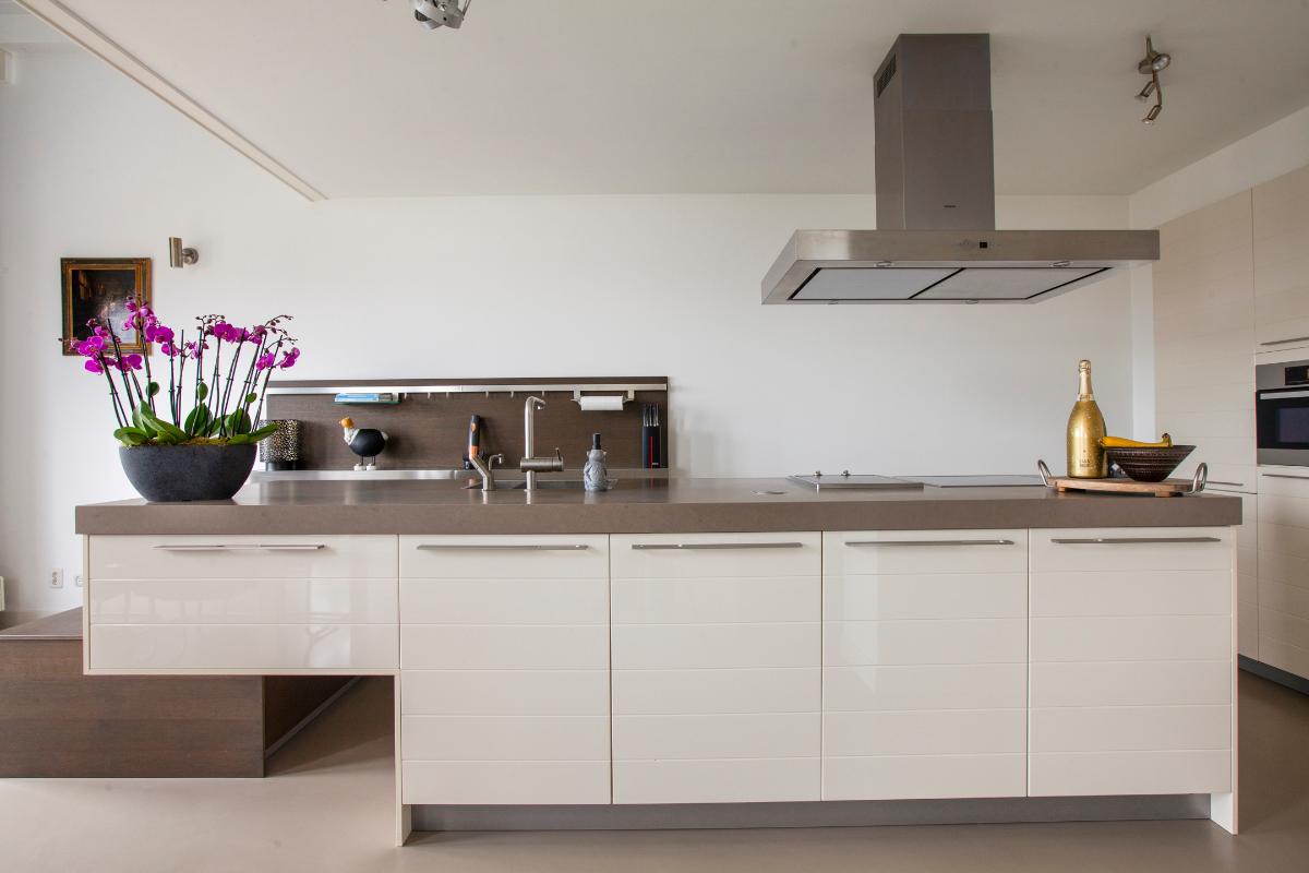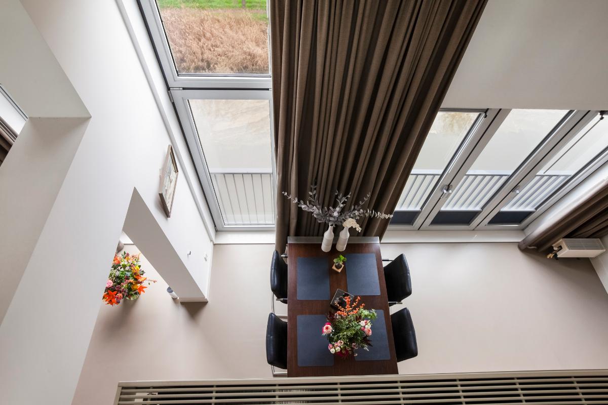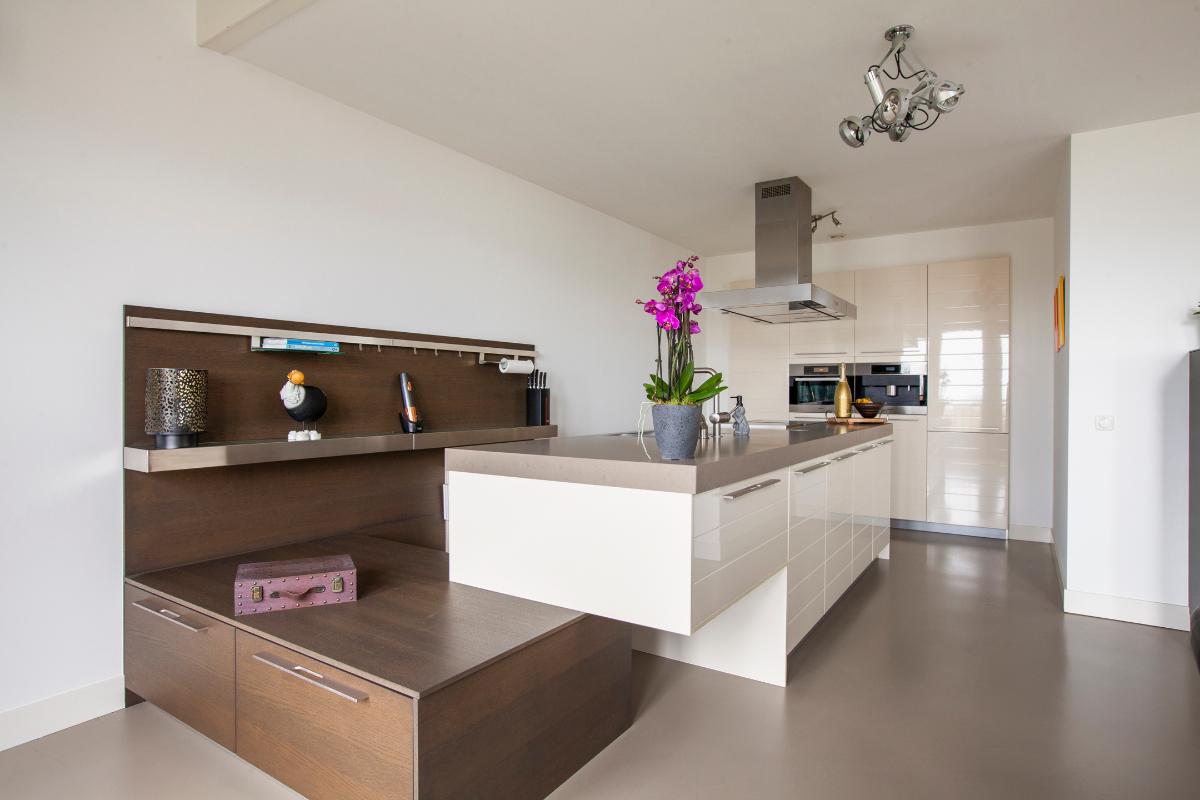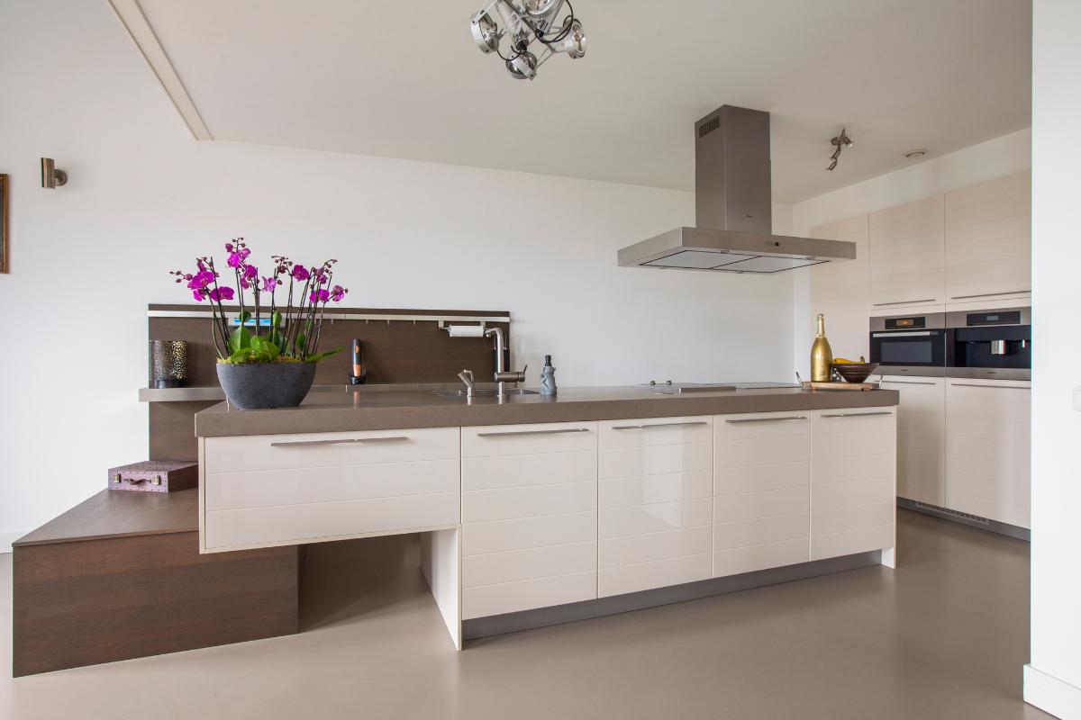 De woonkamer vormt zonder twijfel het stralende middelpunt van de woning. De indrukwekkende plafondhoogte en de prachtige vide zorgen voor een spectaculaire en ruimtelijke woonbeleving. Dankzij de grote raampartijen wordt de leefruimte overspoeld met natuurlijk daglicht, wat zorgt voor een lichte en uitnodigende sfeer. De moderne open keuken sluit hier naadloos op aan en vormt een stijlvolle en elegante plek om te koken en te genieten. De keuken is uitgevoerd met een kook- en spoeleiland, een strakke kastenwand en is voorzien van hoogwaardige inbouwapparatuur, waaronder een inductiekookplaat met afzuigkap, vaatwasser, koelkast, vriezer, combi-oven, Quooker en koffiezetapparaat.
