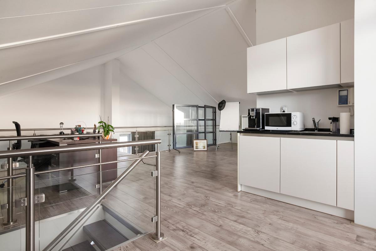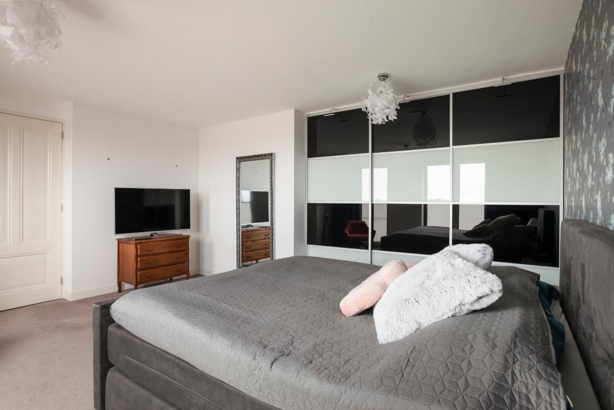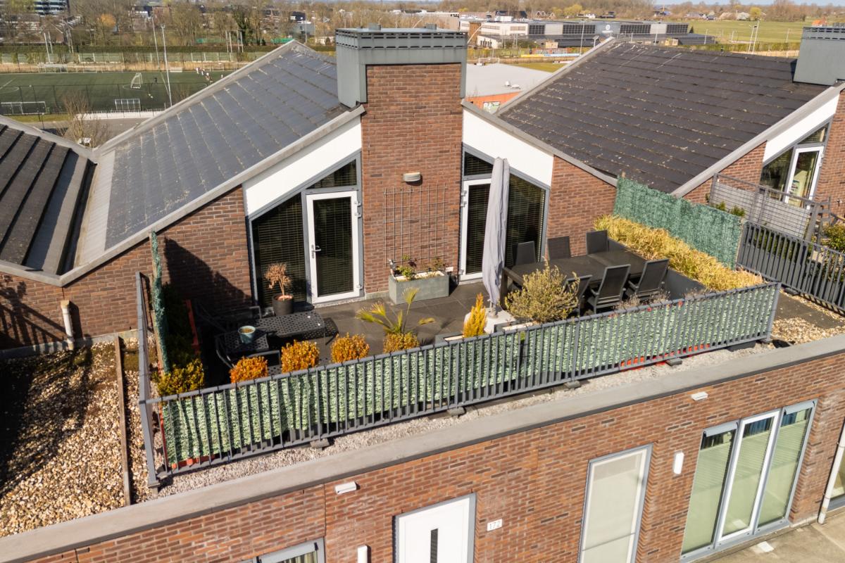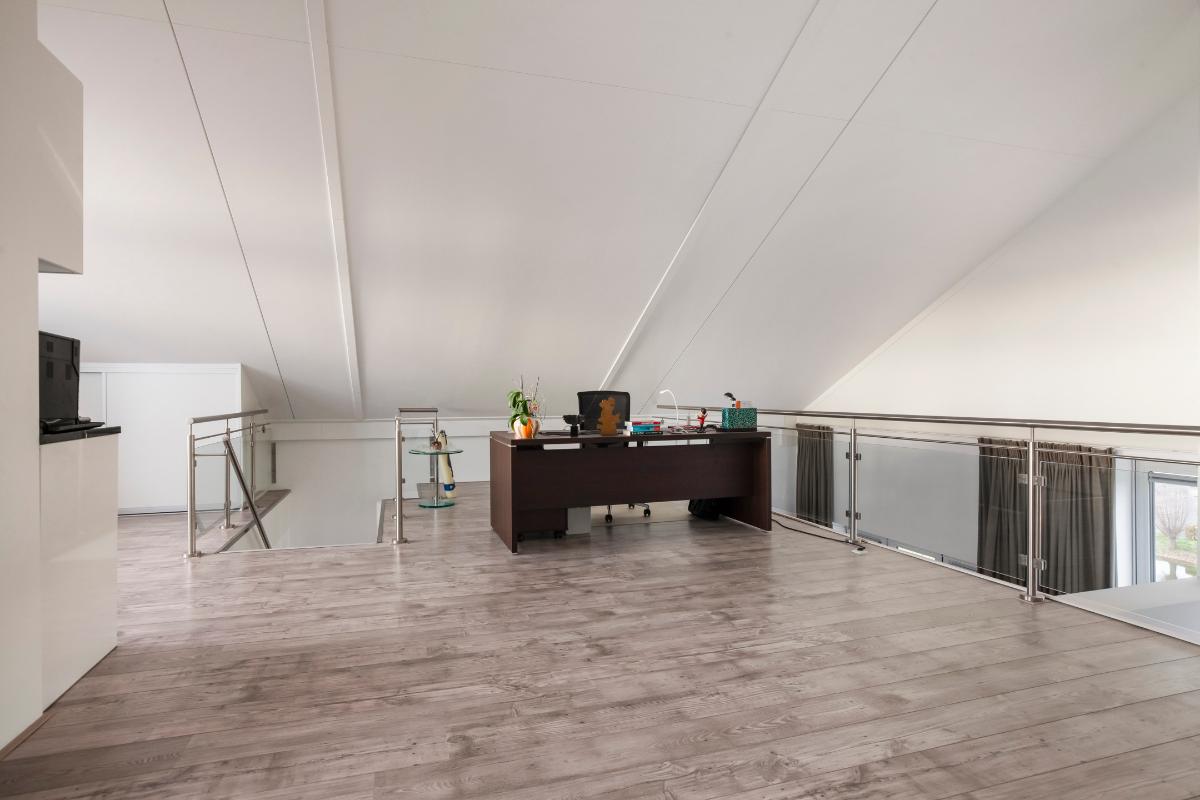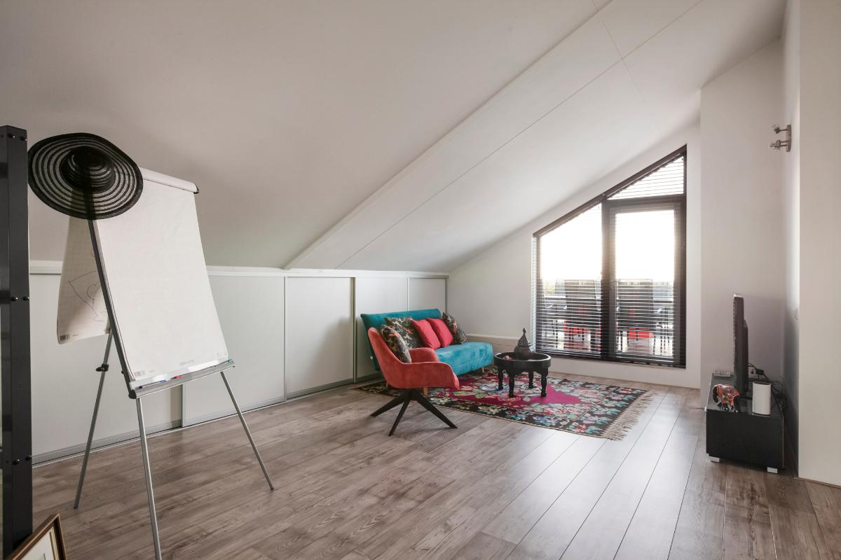 Via de vaste trap in de woonkamer bereik je de royale tweede woonlaag. Deze multifunctionele verdieping biedt talloze mogelijkheden en kan volledig naar eigen wens worden ingericht, bijvoorbeeld als inspirerende werkruimte, hobbykamer of comfortabele logeerkamer. De aanwezige pantry maakt deze verdieping extra praktisch en compleet. Vanuit hier stap je zo het zonnige dakterras op het zuidoosten op. Hier geniet je van een prachtig uitzicht over de waterrijke omgeving, begin je de dag met de ochtendzon, ontspan je in het warme middaglicht en sluit je de dag sfeervol af met een drankje terwijl de zon ondergaat.