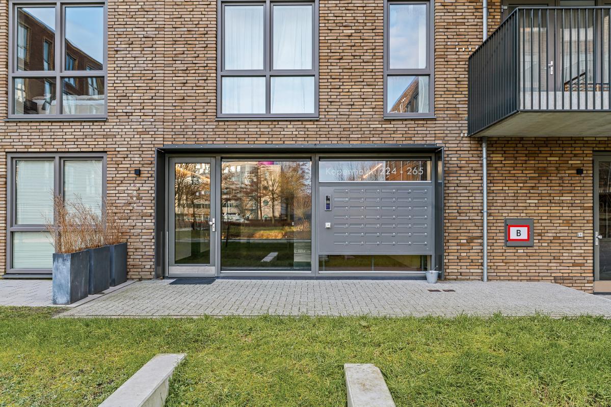 Via de centrale entree met brievenbussen en toegang tot de gezamenlijke fietsenstalling bereik je het appartement. De hal biedt toegang tot alle vertrekken en is voorzien van een video-intercominstallatie. Vanuit hier bereik je het toilet, de berging, de moderne badkamer, twee slaapkamers en de woonkamer met open keuken.