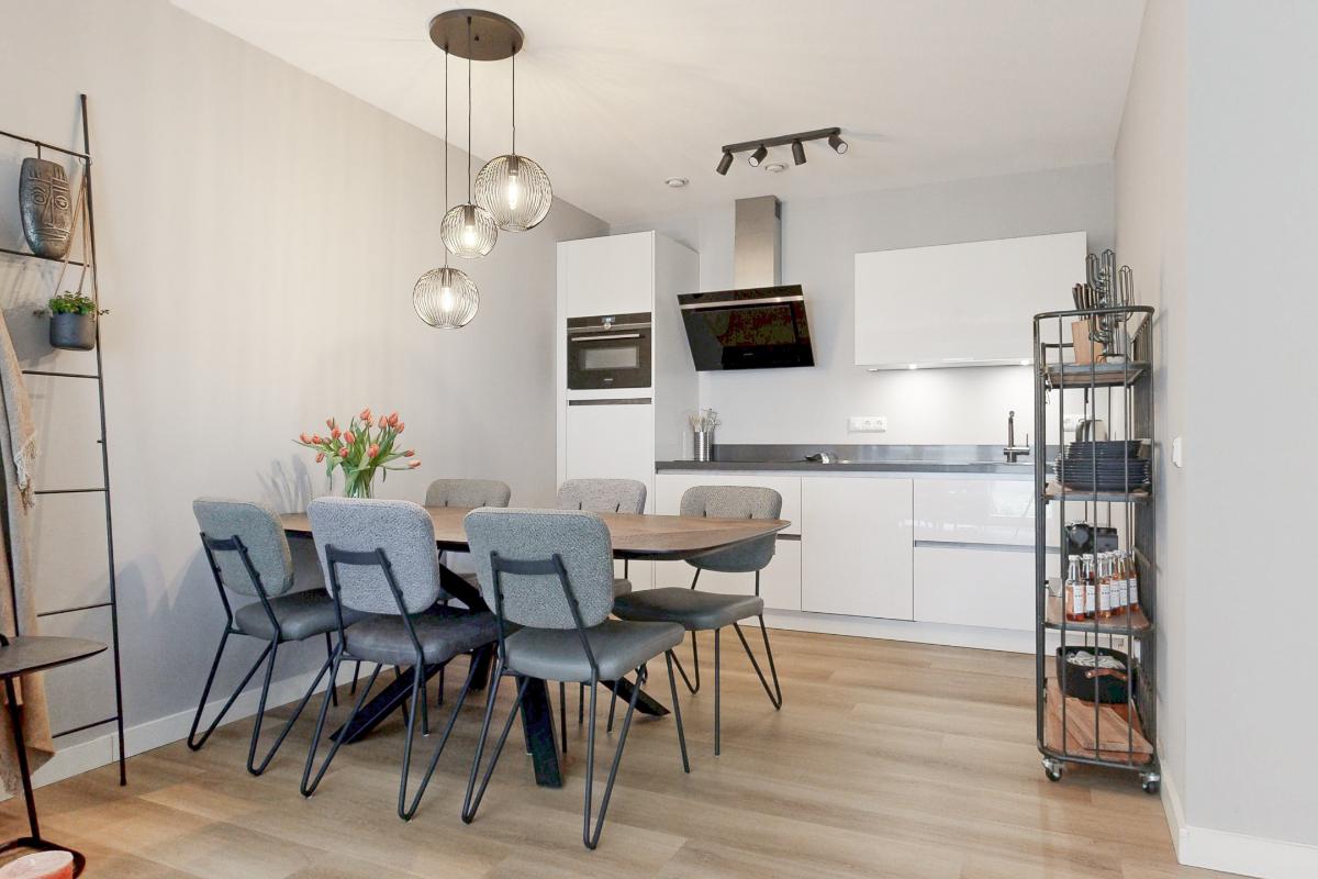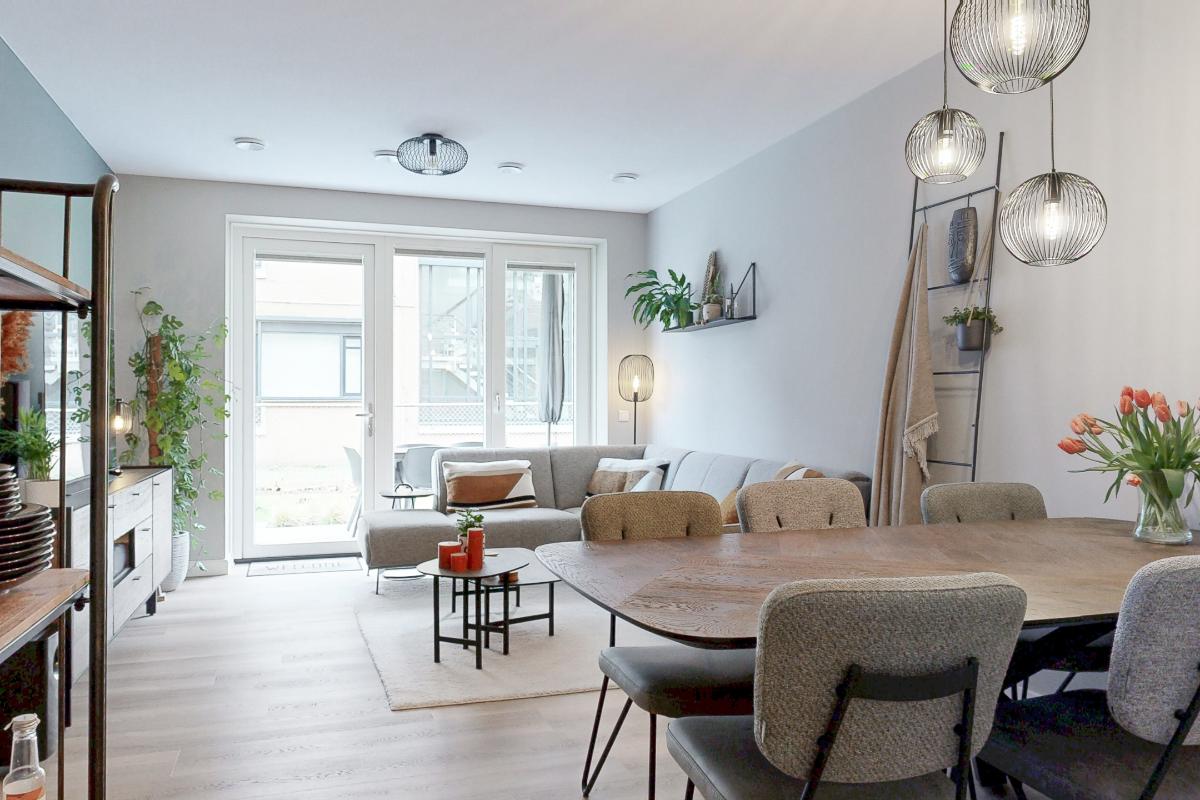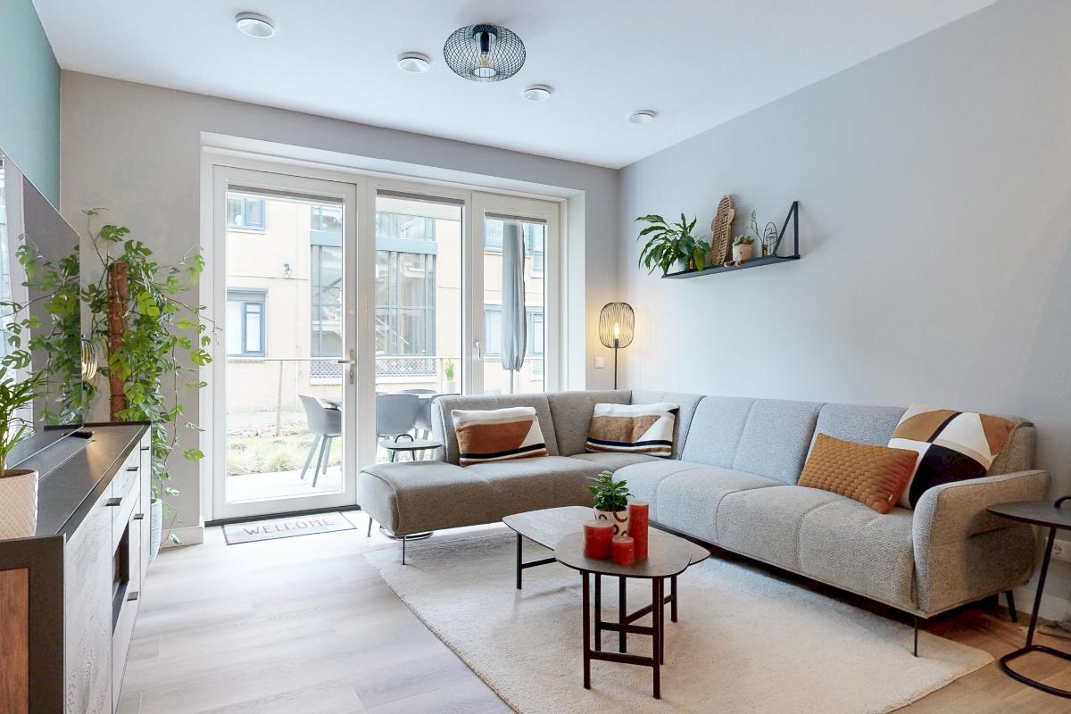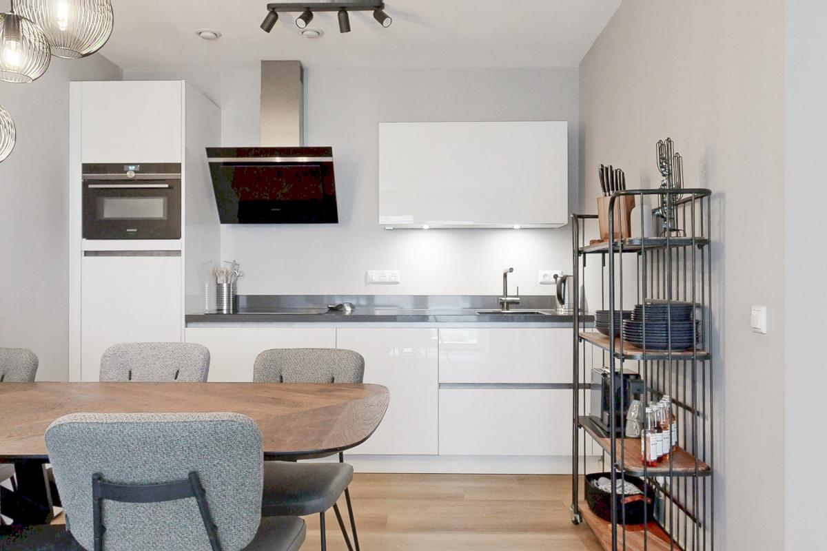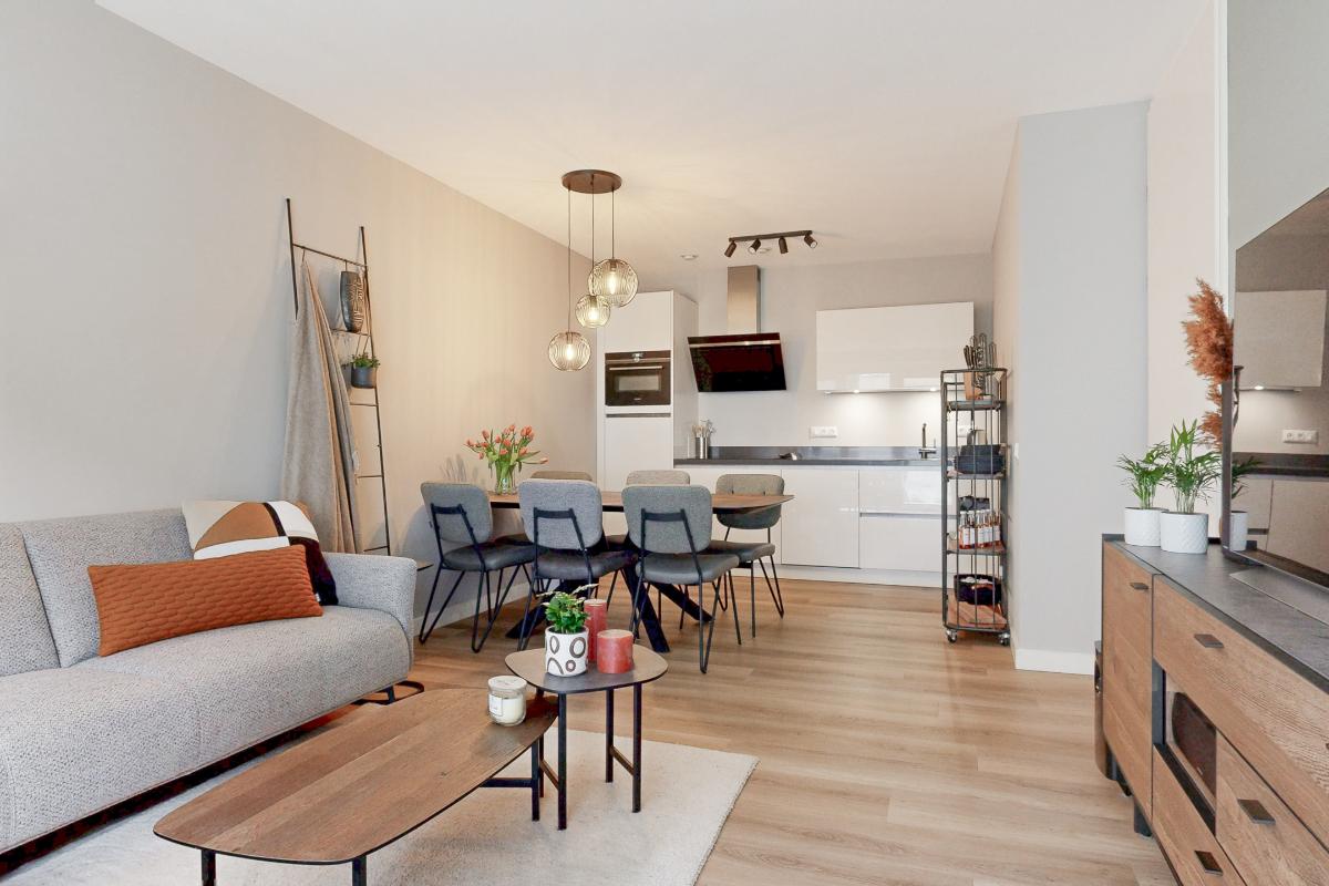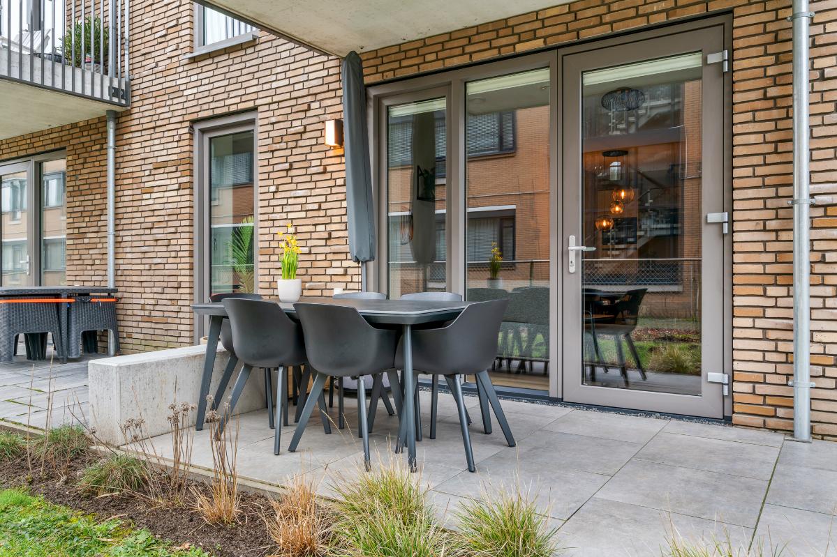 De lichte leefruimte met open keuken vormt het centrale middelpunt van het appartement. De moderne keuken is stijlvol en voorzien van hoogwaardige Siemens inbouwapparatuur, waardoor comfort en uitstraling perfect hand in hand gaan. Vanuit de woonkamer heb je direct toegang tot het terras en tuin op het zuidwesten. Deze is gezellig aangelegd en biedt een heerlijke plek om in alle rust van de middag- en avondzon te genieten.