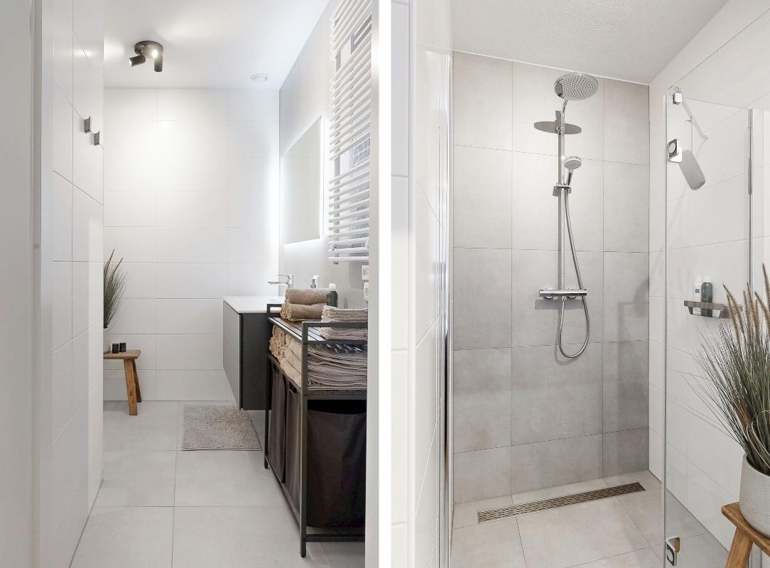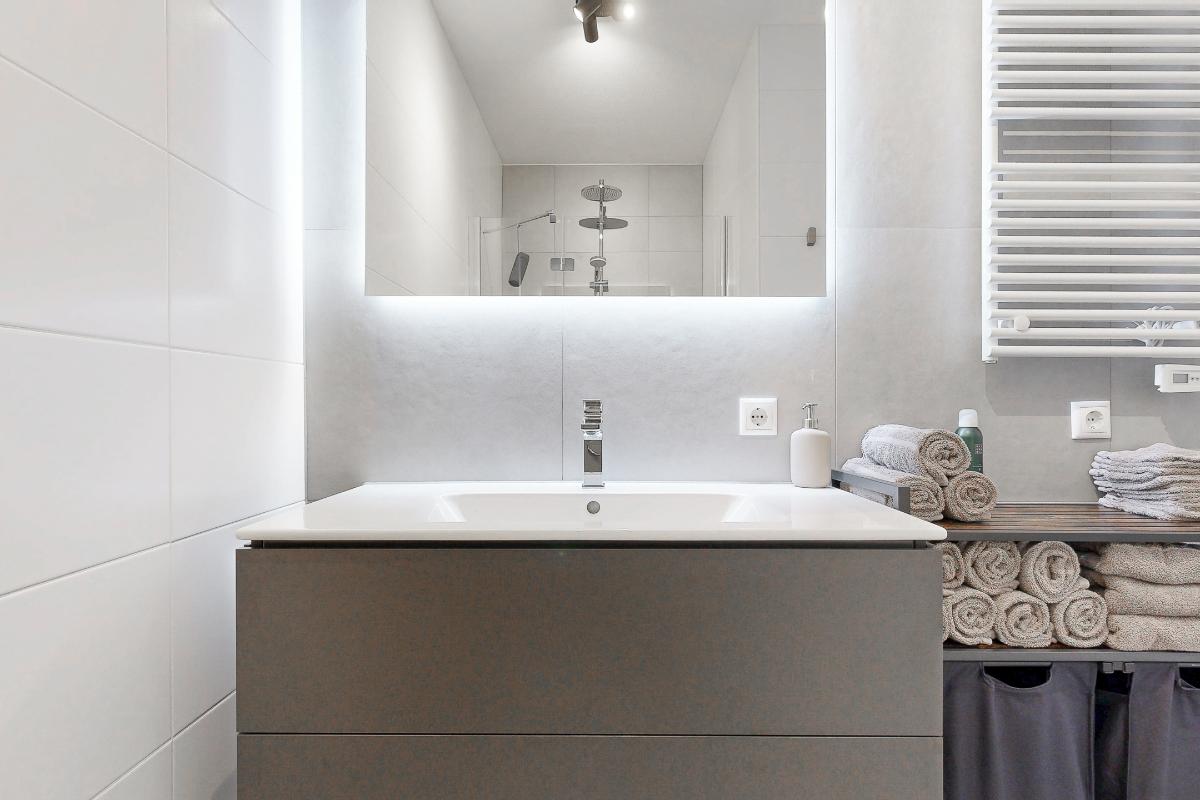 De badkamer is comfortabel en stijlvol ingericht met een extra brede douche, een brede wastafel met meubel en een elektrische handdoekradiator.