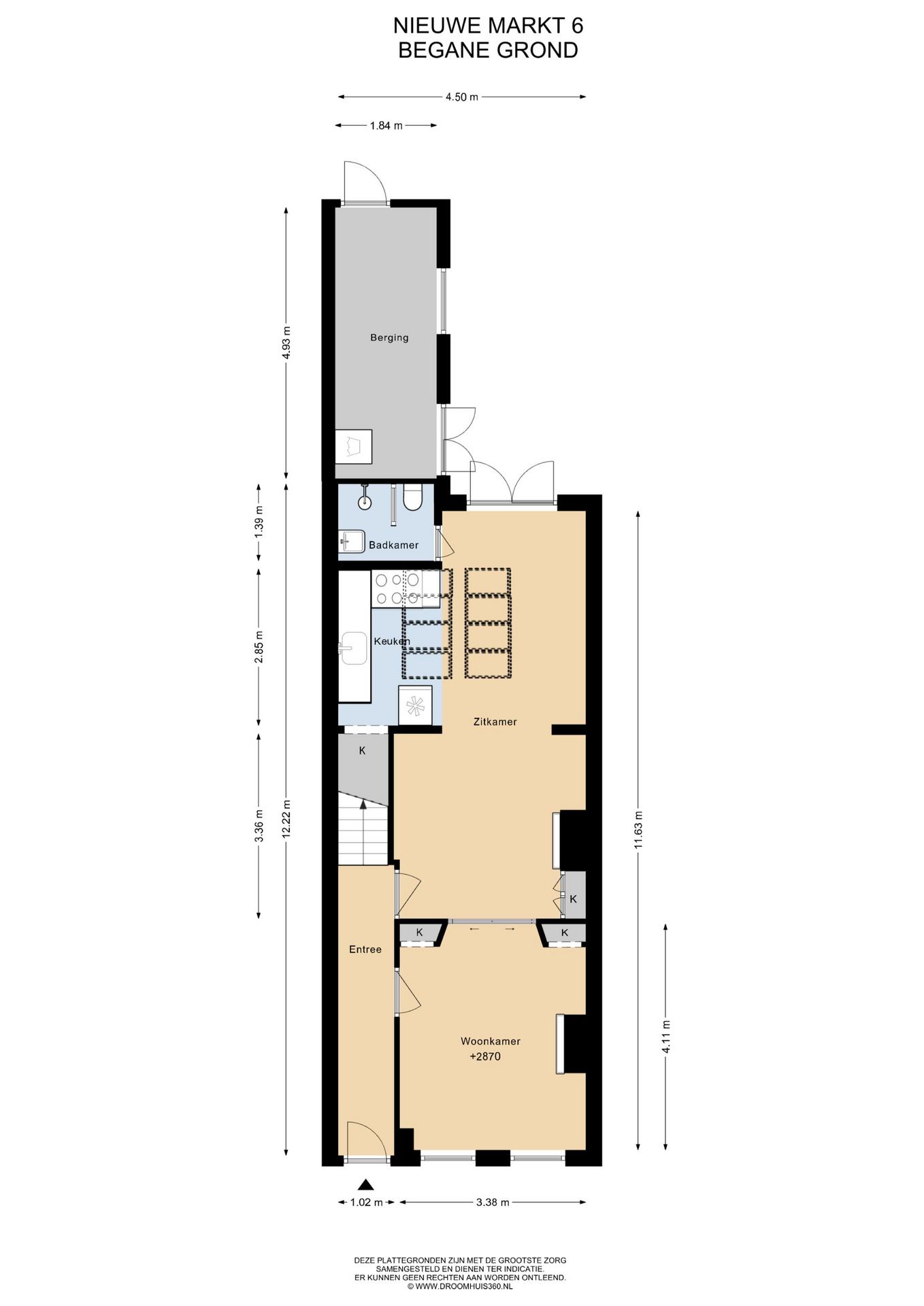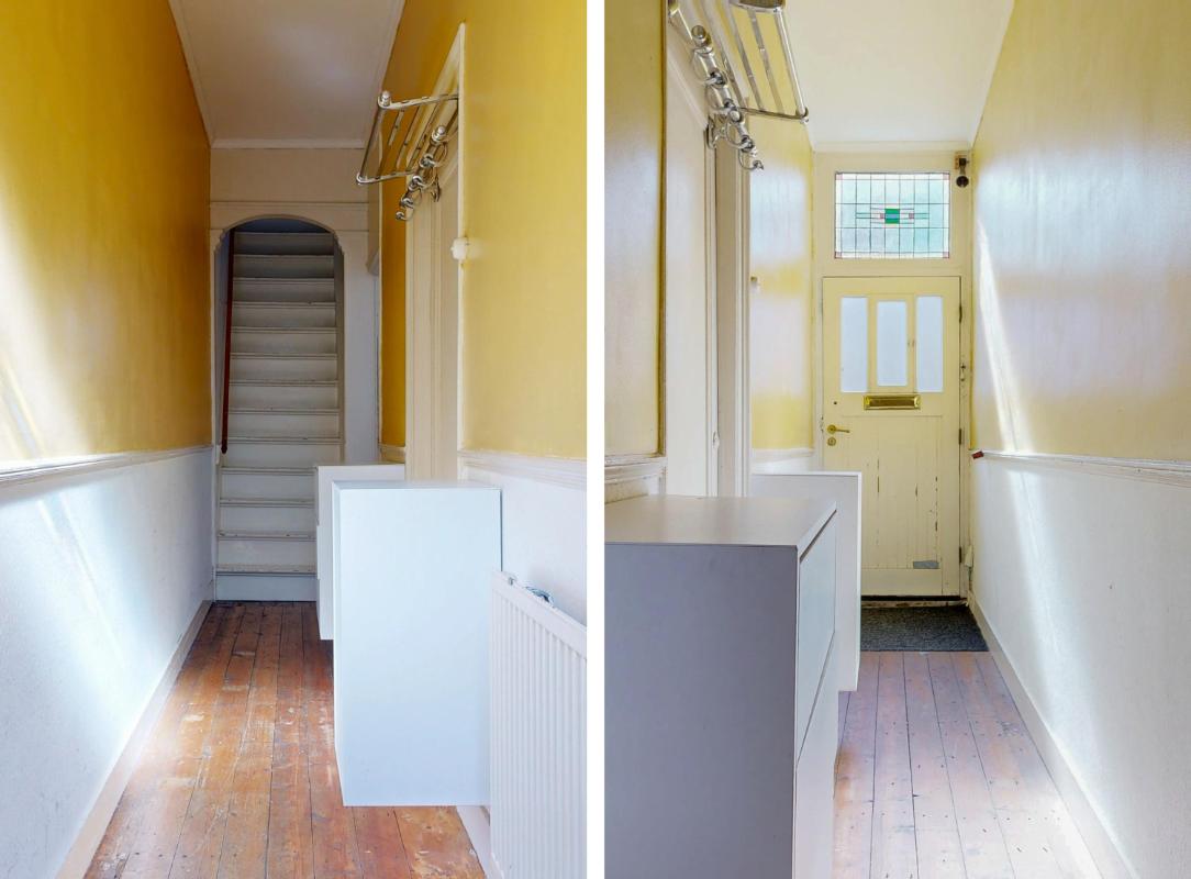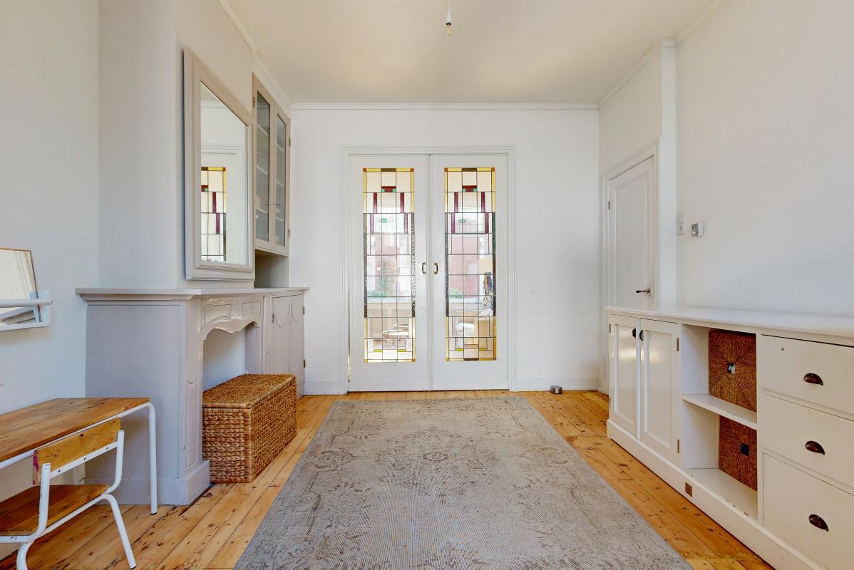 Via de entree met trapopgang kom je binnen in de hal, met twee deuren naar de woonkamer. Deze is verdeeld in twee sfeervolle ruimtes, gescheiden door ensuite deuren. Beide delen beschikken over een schouw en (inbouw)kasten, wat zorgt voor een fijne en praktische leefruimte.