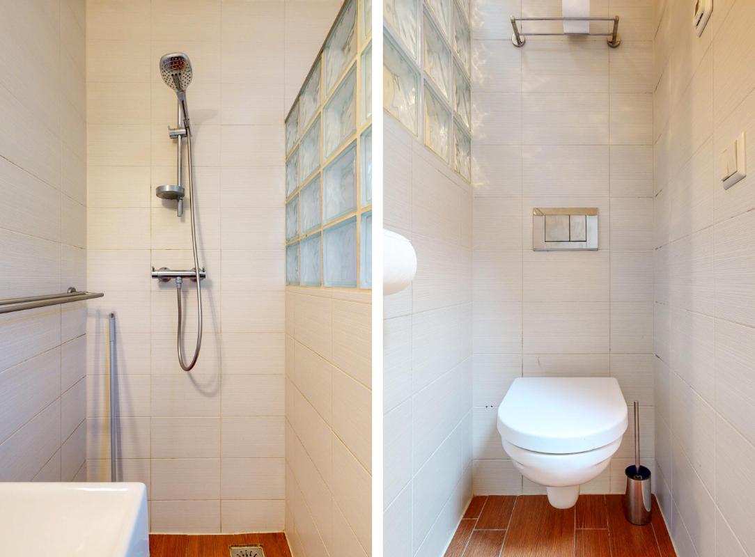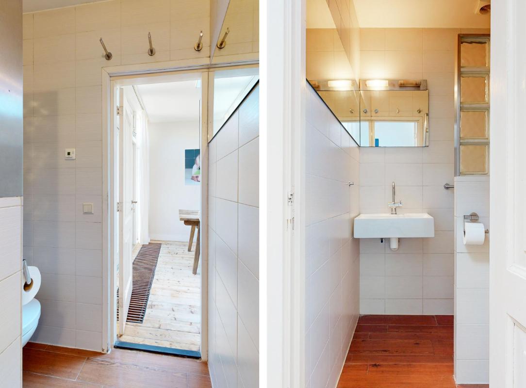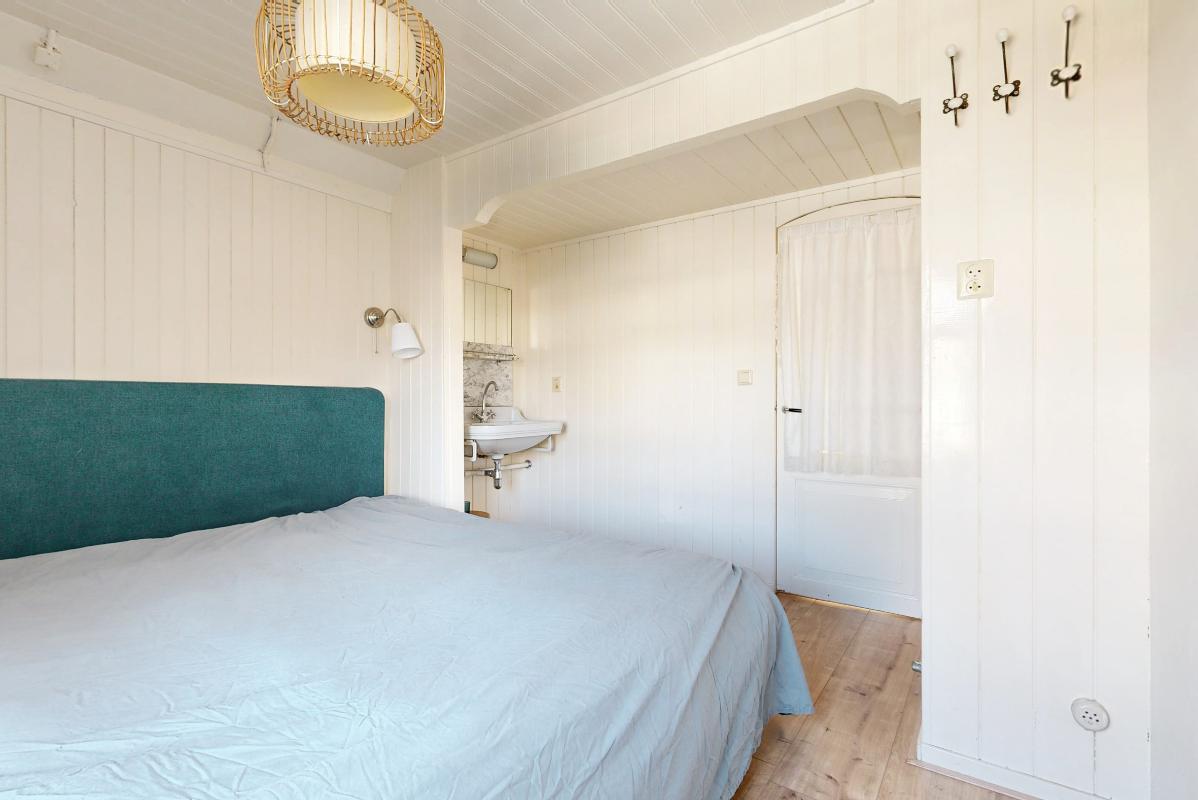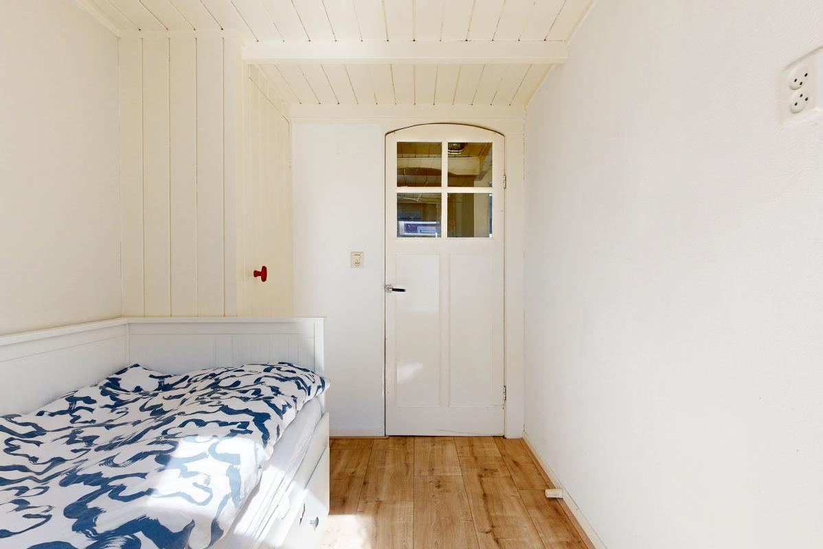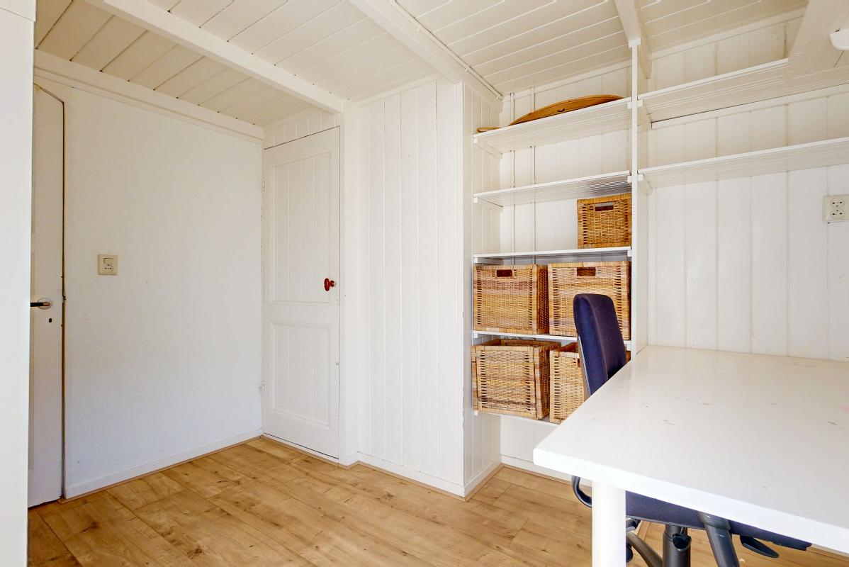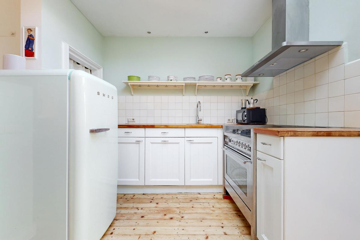 Aan de achterzijde ligt de open keuken in de uitbouw. Dankzij de lichtstraat is dit een heerlijk lichte plek. De keuken is voorzien van een 5-pits gasfornuis met oven en een praktische voorraadkast onder de trap. De begane grondvloer is afgewerkt met een houtenvloer. Via de openslaande deuren bereik je de achtertuin. De badkamer op de begane grond beschikt over een toilet, douche en wastafel.