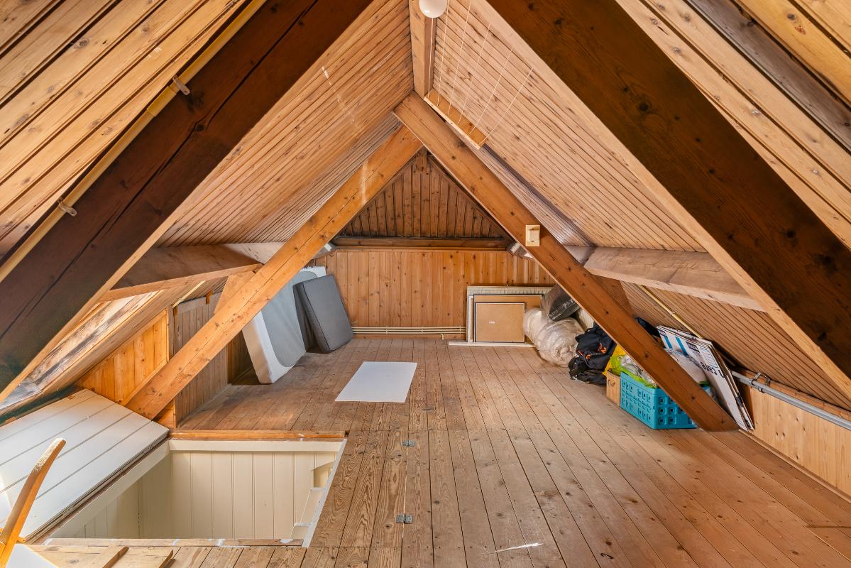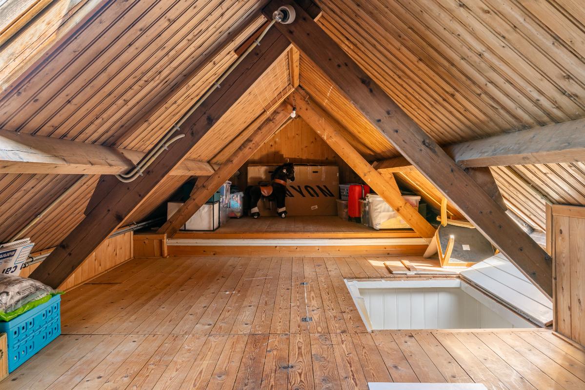 De eerste verdieping biedt een overloop met toegang tot het terras, diverse inbouwkasten en drie slaapkamers met laminaat en inbouwkasten. De slaapkamer aan de achterzijde heeft een wastafel. Via een vaste trap bereik je de ruime vliering met twee dakramen en veel bergruimte.