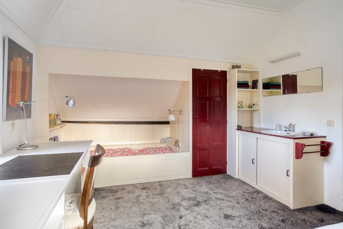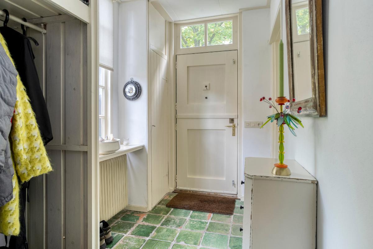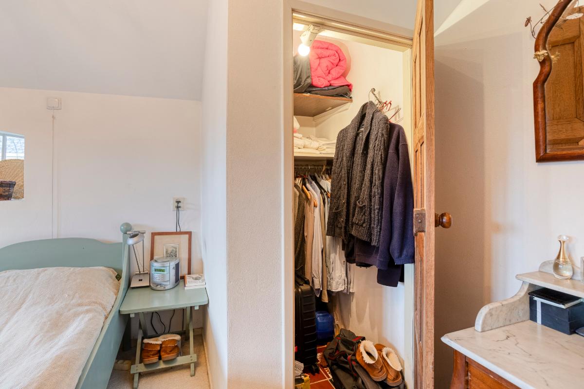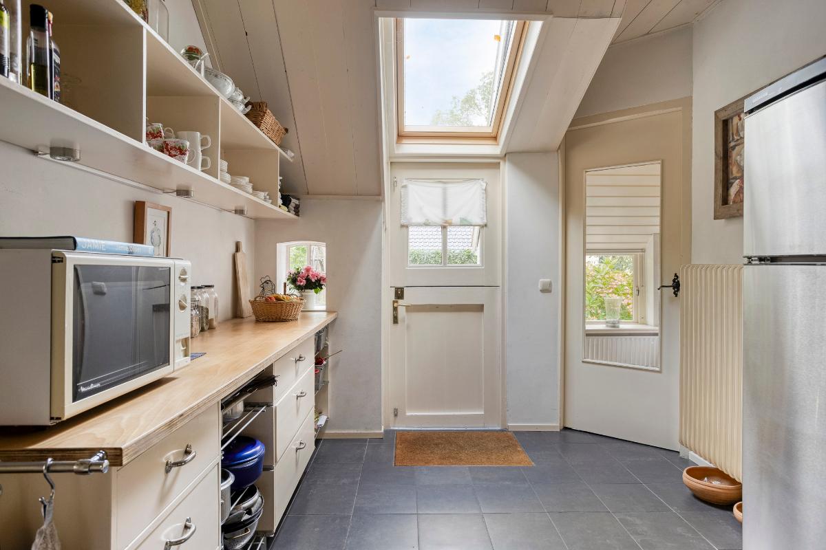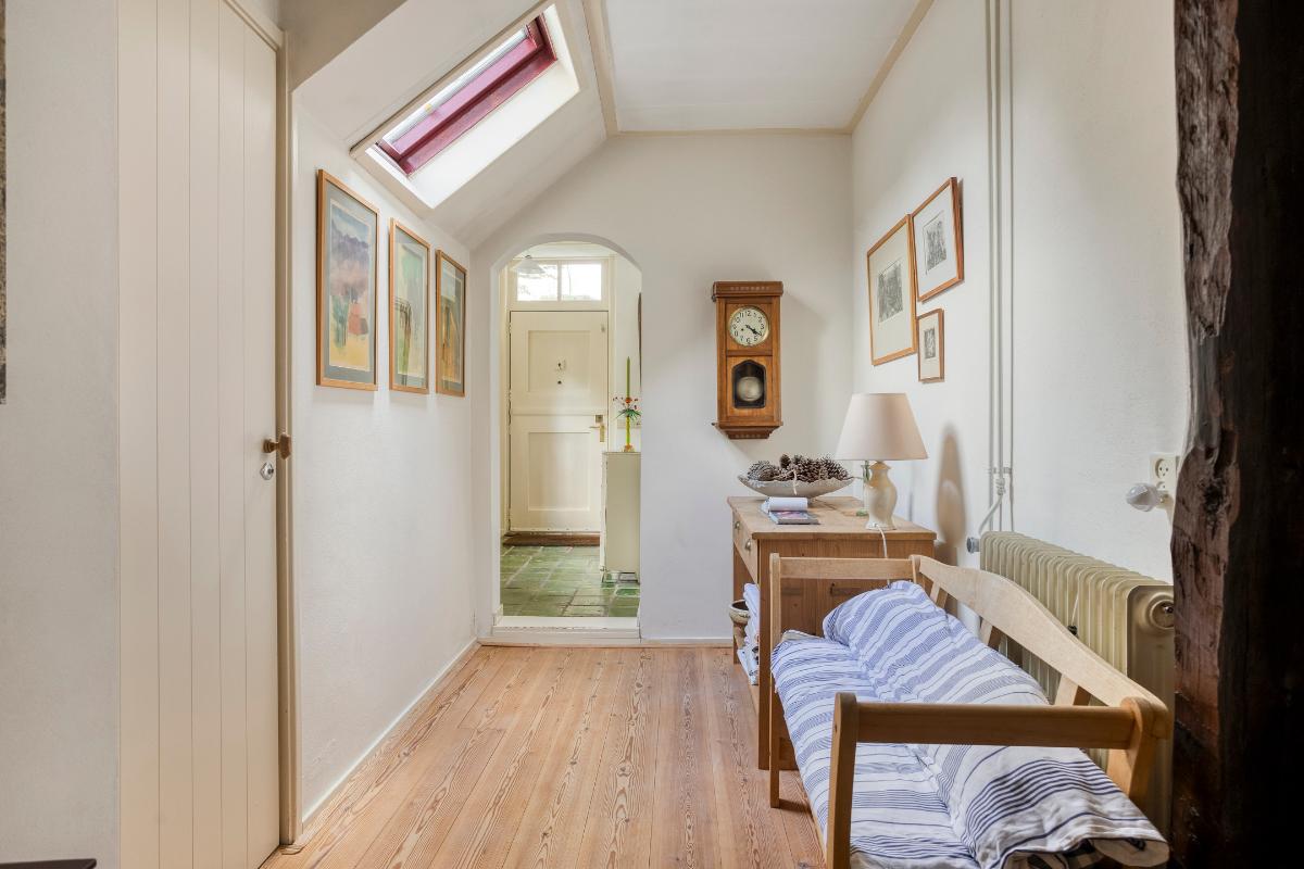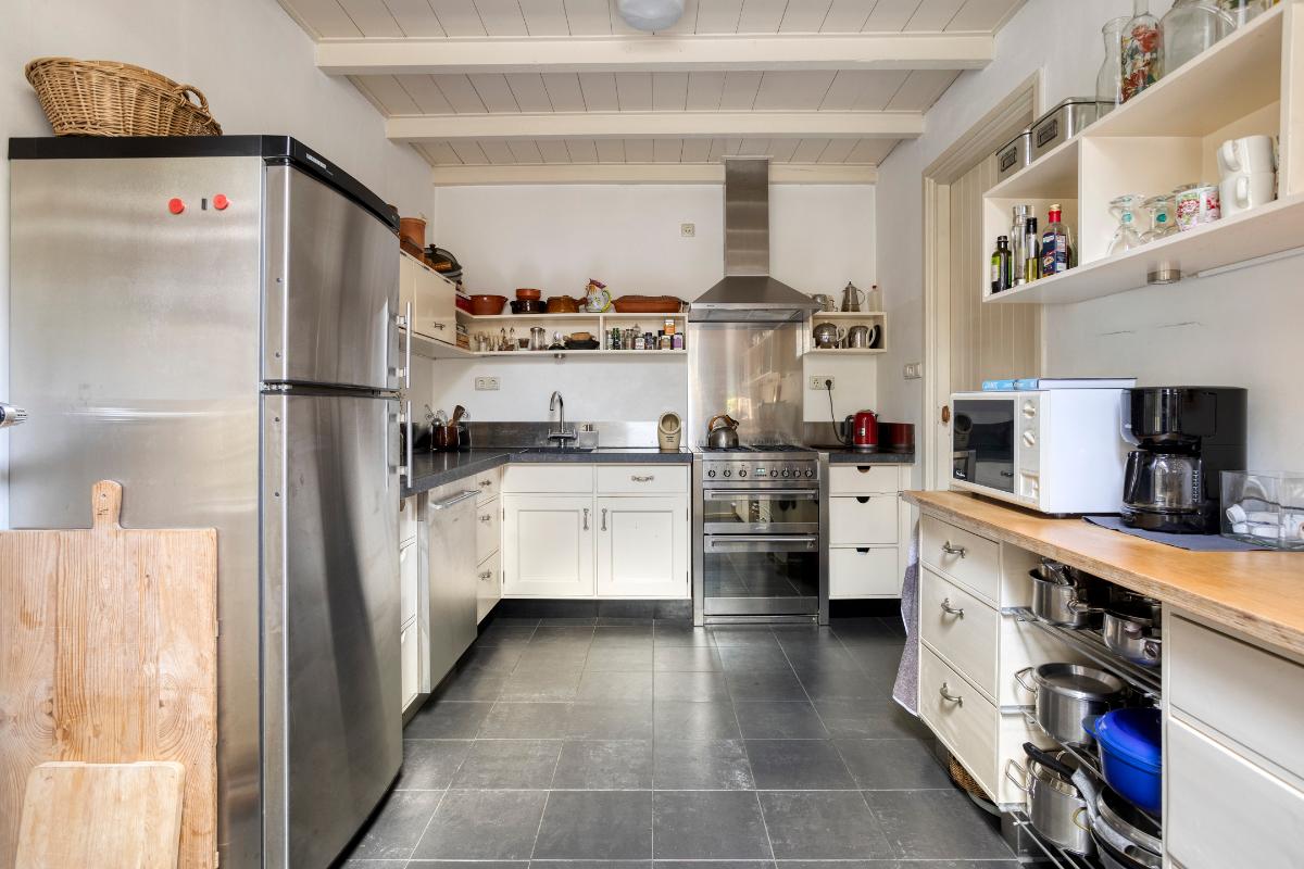 Indeling Begane grond: entree/hal met meterkast, garderobekast en vaste kast. De zeer charmante (voormalige) woonkamer aan de voorzijde is in gebruik als eetkamer. Deze eetkamer heeft een wijnkeldertje, een sfeervolle schouw, een wiemel en een op maat gemaakte boekenkast. Van de voormalige bedstedes is de één verbouwd tot werkhoek en de ander tot voorraadkast met als entree de authentieke/oorspronkelijke bedsteedeuren. Aansluitend bevindt zich de ruime keuken met zijentree en dakraam. De met de hand en op maat gemaakte keukeninrichting is v.v. hard stenen werkblad, diverse houten lades, een gasfornuis met twee ovens, afzuigkap en vaatwasser. De heerlijk lichte en zonnige L-vormige woonkamer ligt aan de achterzijde, is tuingericht en biedt optimale privacy. De woonkamer heeft een open haard, een op maat gemaakte boekenkast, tuindeur en een open trap naar de verdieping. De centraal in de woning gelegen hal v.v. vaste kast en dakraam. Deze hal geeft toegang tot de toiletruimte met hangtoilet en fonteintje, tot de ouderslaapkamer met vaste kasten en tot de geheel betegelde badkamer met ligbad, aparte douche, wastafel en wasmachine aansluiting. De inpandige c.v.ruimte is van buitenaf te bereiken. 1e Verdieping: overloop/videruimte met dakraam, toegang tot zolderruimte boven het voorhuis en tot de twee slaapkamers resp. één met dakkapel, vaste open kast en wastafelmeubel en één met dakraam, vaste bedbank en vaste kast en wastafelmeubel.
