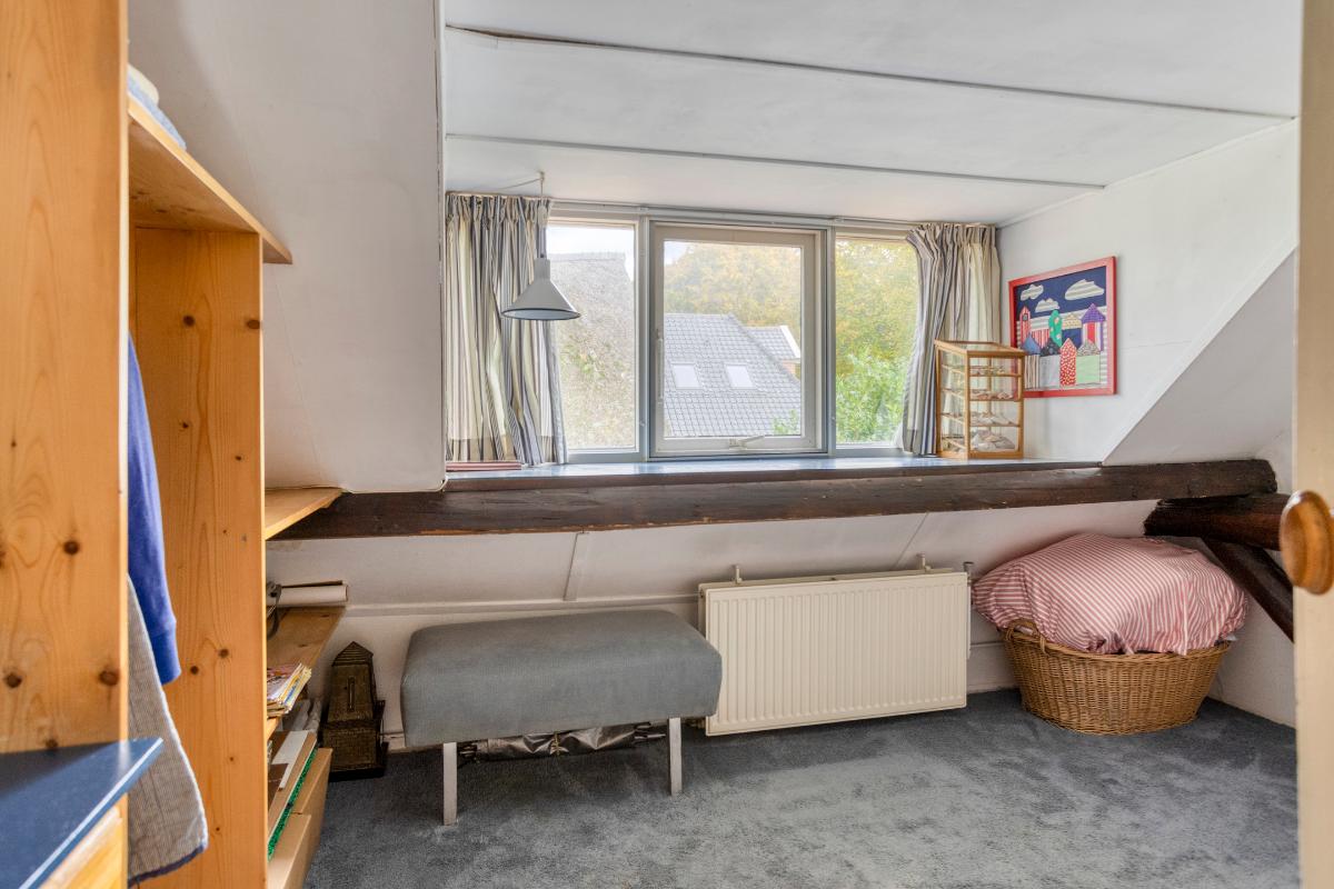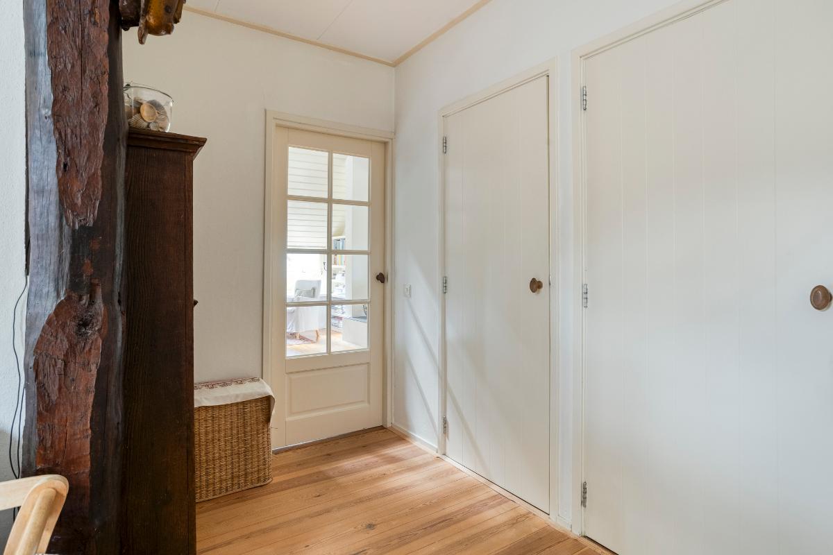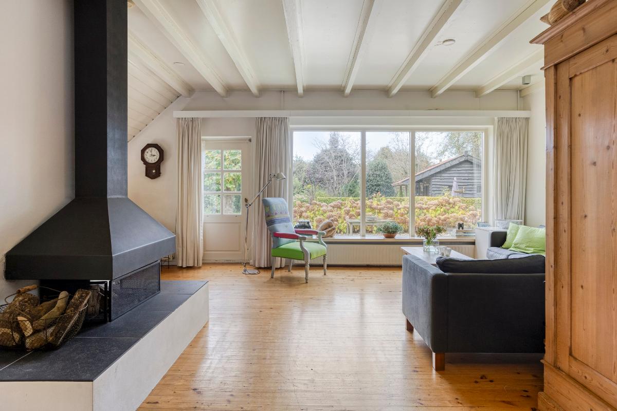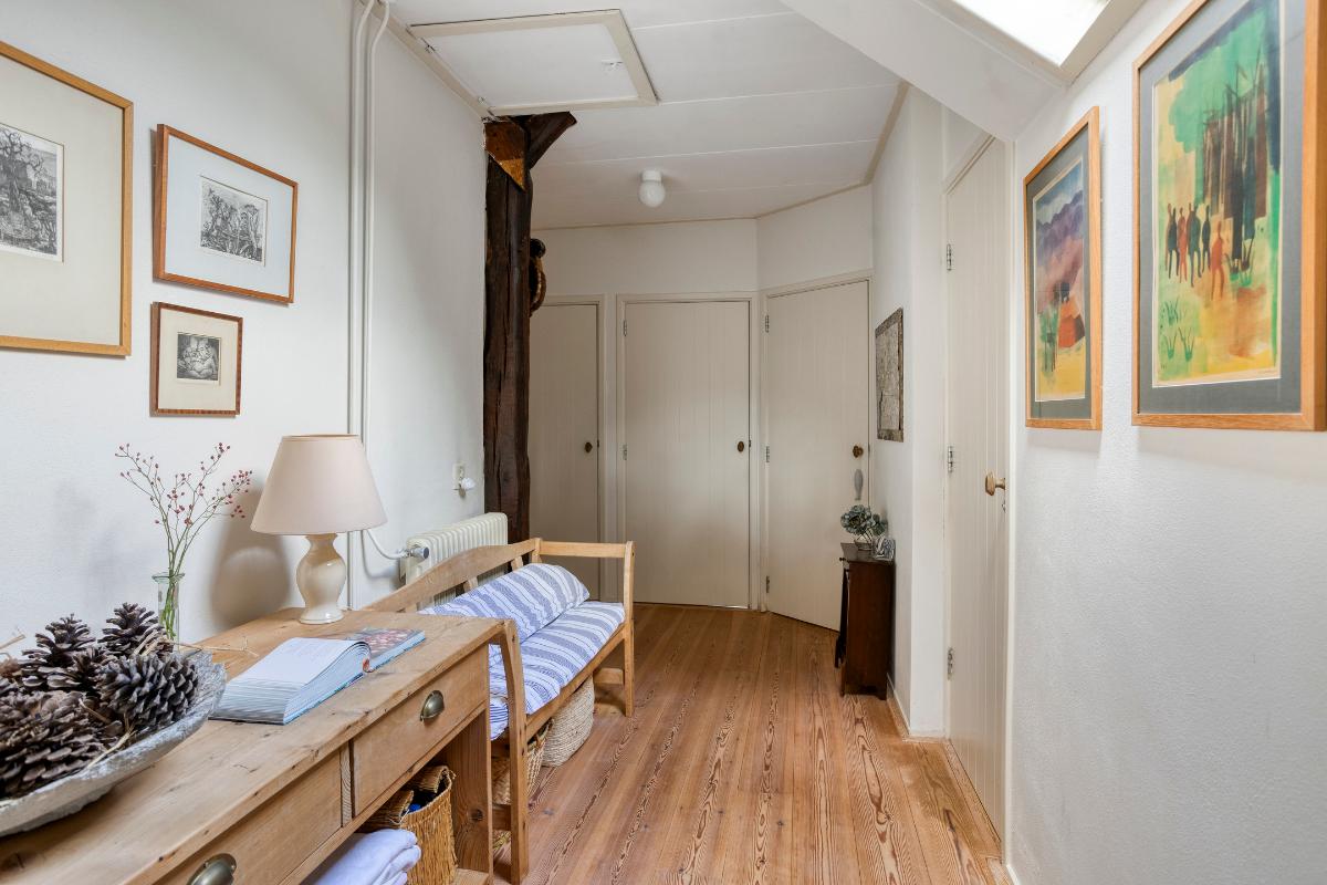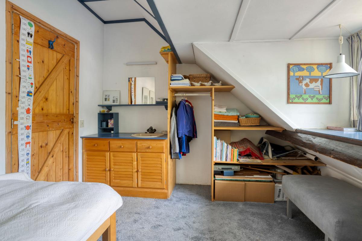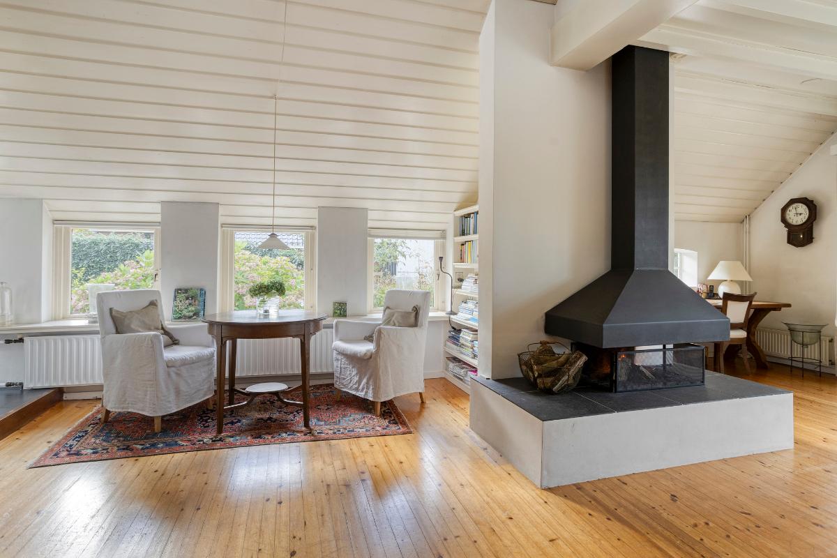 Indeling Begane grond: entree/hal met meterkast, garderobekast en vaste kast. De zeer charmante (voormalige) woonkamer aan de voorzijde is in gebruik als eetkamer. Deze eetkamer heeft een wijnkeldertje, een sfeervolle schouw, een wiemel en een op maat gemaakte boekenkast. Van de voormalige bedstedes is de één verbouwd tot werkhoek en de ander tot voorraadkast met als entree de authentieke/oorspronkelijke bedsteedeuren. Aansluitend bevindt zich de ruime keuken met zijentree en dakraam. De met de hand en op maat gemaakte keukeninrichting is v.v. hard stenen werkblad, diverse houten lades, een gasfornuis met twee ovens, afzuigkap en vaatwasser. De heerlijk lichte en zonnige L-vormige woonkamer ligt aan de achterzijde, is tuingericht en biedt optimale privacy. De woonkamer heeft een open haard, een op maat gemaakte boekenkast, tuindeur en een open trap naar de verdieping. De centraal in de woning gelegen hal v.v. vaste kast en dakraam. Deze hal geeft toegang tot de toiletruimte met hangtoilet en fonteintje, tot de ouderslaapkamer met vaste kasten en tot de geheel betegelde badkamer met ligbad, aparte douche, wastafel en wasmachine aansluiting. De inpandige c.v.ruimte is van buitenaf te bereiken. 1e Verdieping: overloop/videruimte met dakraam, toegang tot zolderruimte boven het voorhuis en tot de twee slaapkamers resp. één met dakkapel, vaste open kast en wastafelmeubel en één met dakraam, vaste bedbank en vaste kast en wastafelmeubel.