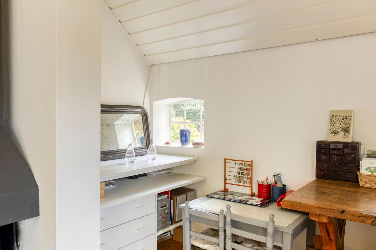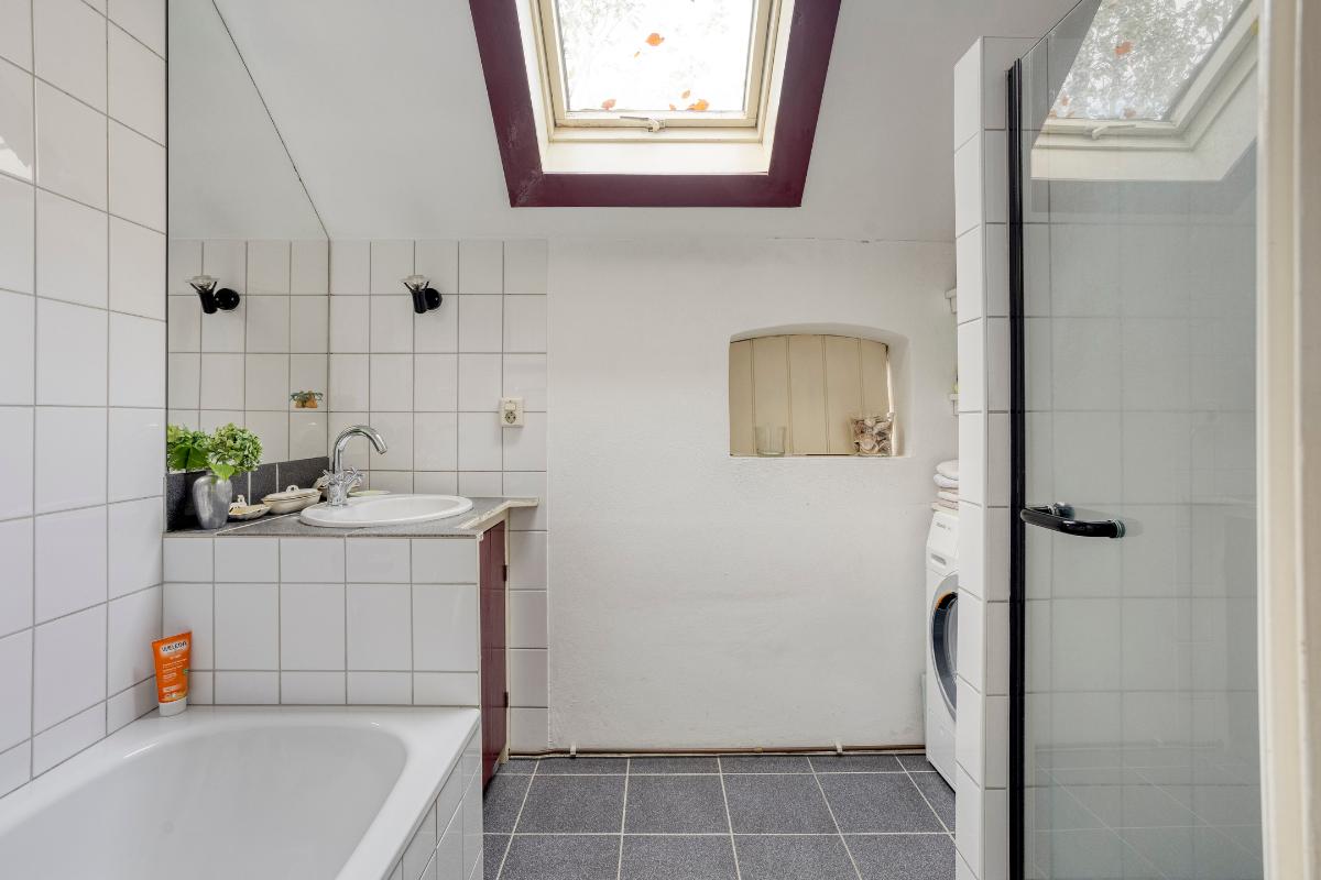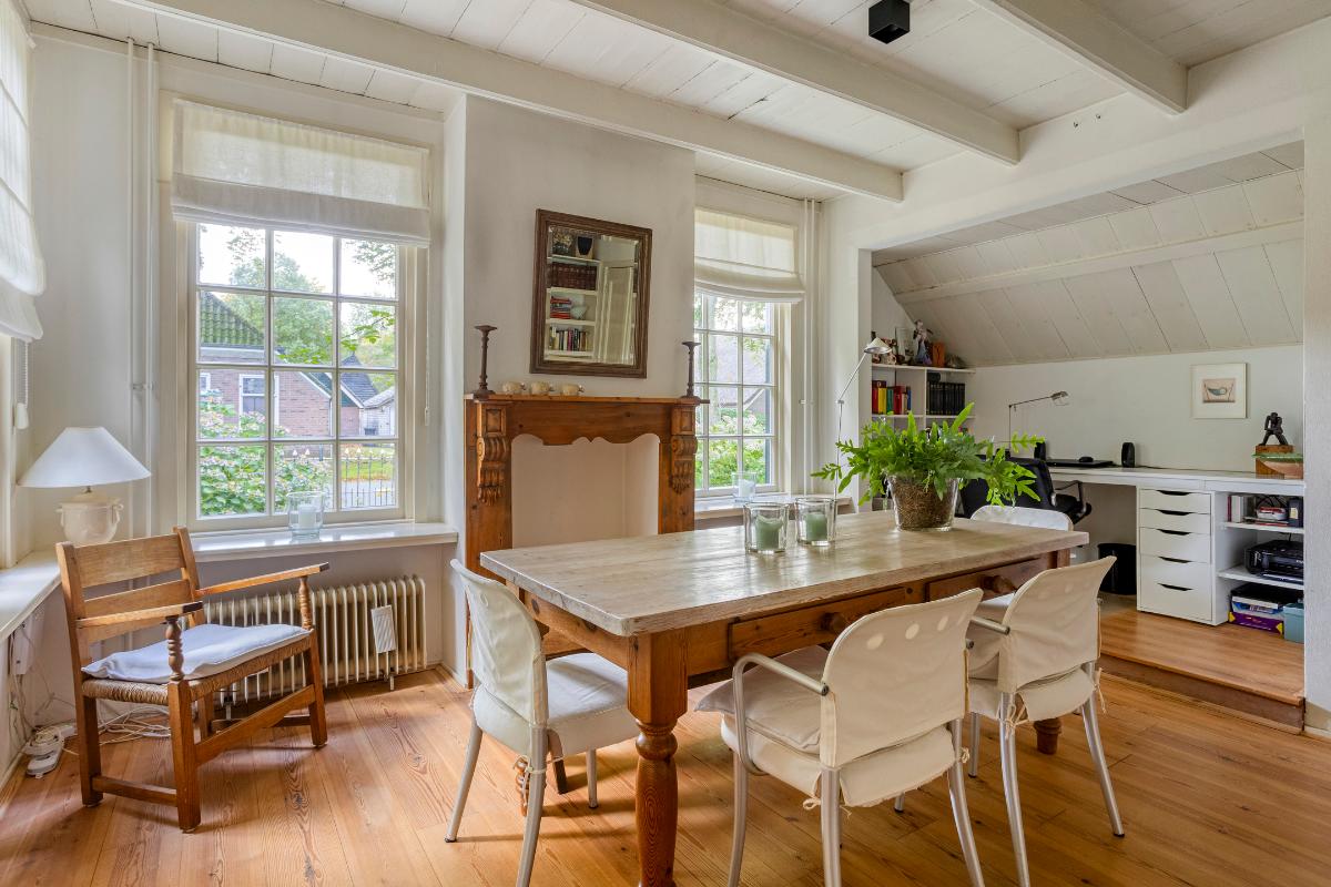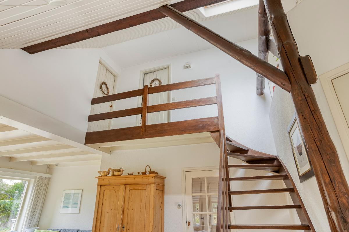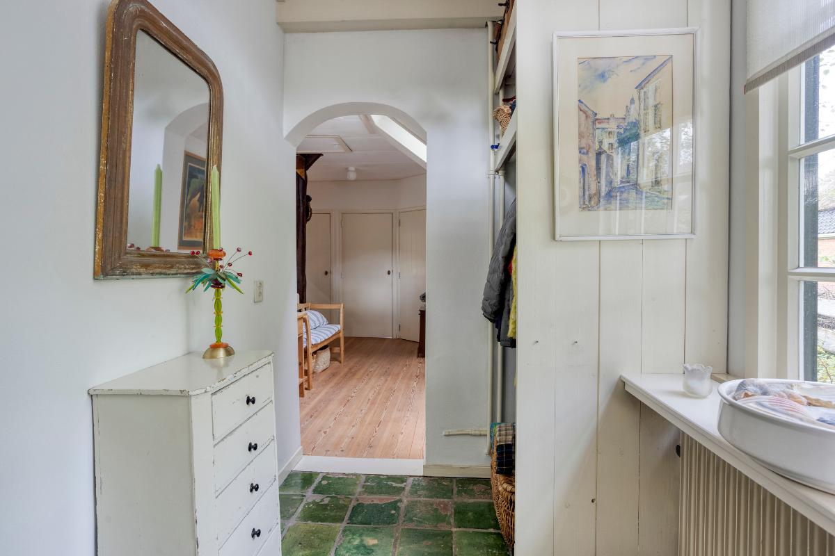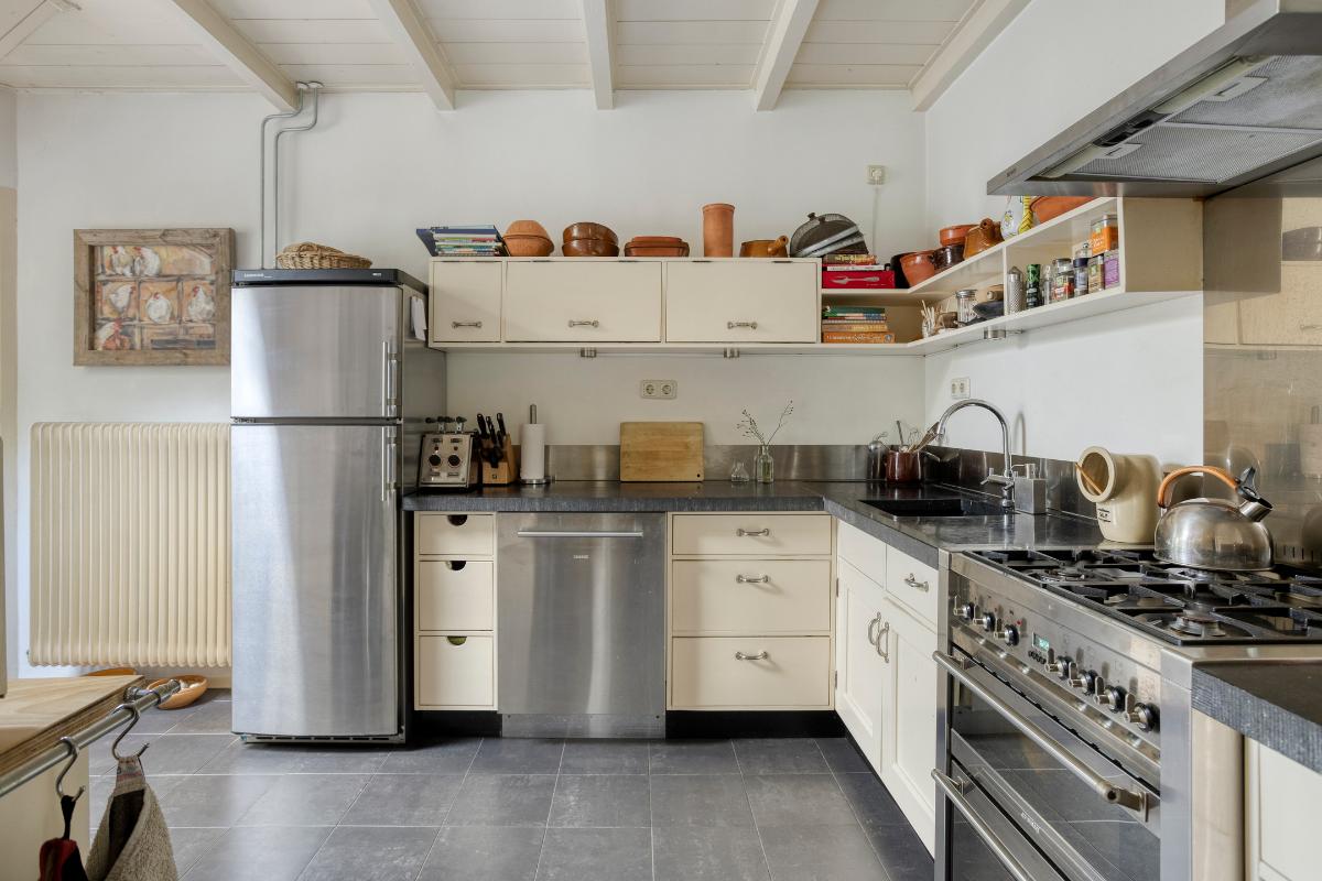Indeling Begane grond: entree/hal met meterkast, garderobekast en vaste kast. De zeer charmante (voormalige) woonkamer aan de voorzijde is in gebruik als eetkamer. Deze eetkamer heeft een wijnkeldertje, een sfeervolle schouw, een wiemel en een op maat gemaakte boekenkast. Van de voormalige bedstedes is de één verbouwd tot werkhoek en de ander tot voorraadkast met als entree de authentieke/oorspronkelijke bedsteedeuren. Aansluitend bevindt zich de ruime keuken met zijentree en dakraam. De met de hand en op maat gemaakte keukeninrichting is v.v. hard stenen werkblad, diverse houten lades, een gasfornuis met twee ovens, afzuigkap en vaatwasser. De heerlijk lichte en zonnige L-vormige woonkamer ligt aan de achterzijde, is tuingericht en biedt optimale privacy. De woonkamer heeft een open haard, een op maat gemaakte boekenkast, tuindeur en een open trap naar de verdieping. De centraal in de woning gelegen hal v.v. vaste kast en dakraam. Deze hal geeft toegang tot de toiletruimte met hangtoilet en fonteintje, tot de ouderslaapkamer met vaste kasten en tot de geheel betegelde badkamer met ligbad, aparte douche, wastafel en wasmachine aansluiting. De inpandige c.v.ruimte is van buitenaf te bereiken. 1e Verdieping: overloop/videruimte met dakraam, toegang tot zolderruimte boven het voorhuis en tot de twee slaapkamers resp. één met dakkapel, vaste open kast en wastafelmeubel en één met dakraam, vaste bedbank en vaste kast en wastafelmeubel.