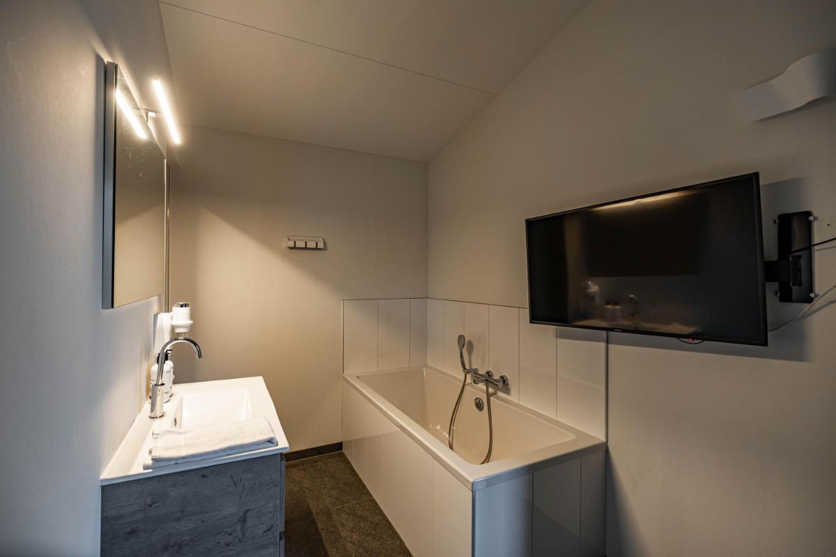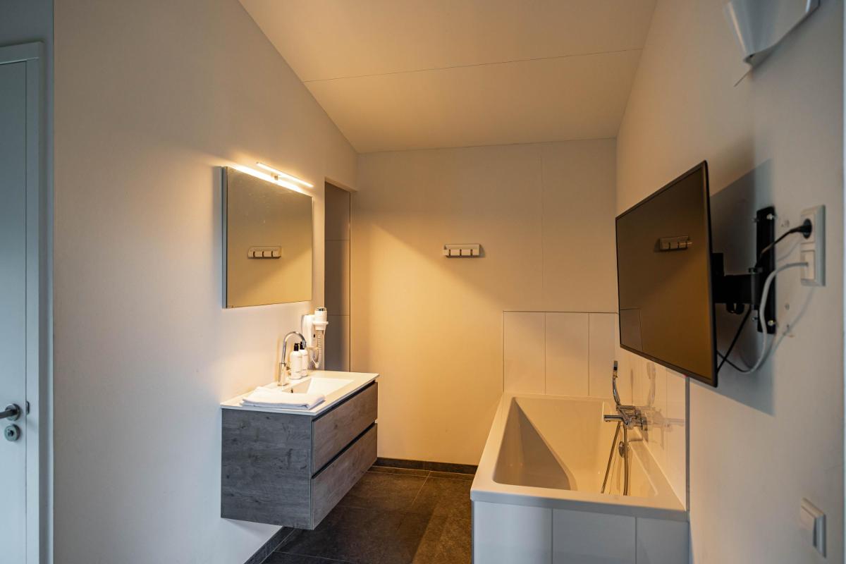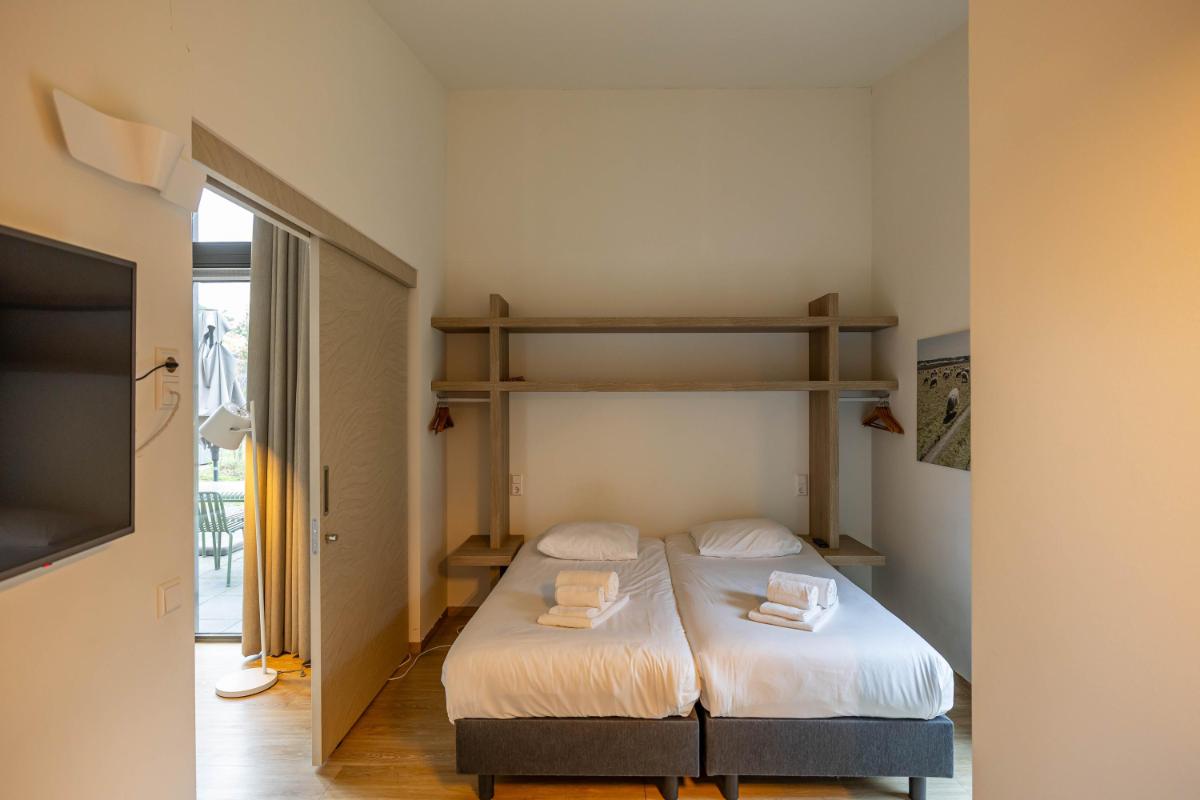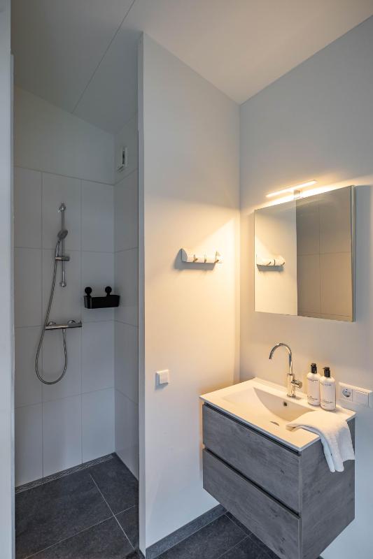 De bungalow beschikt over twee volwaardige slaapkamers, elk met een eigen karakter en hoog afwerkingsniveau. De hoofdslaapkamer is voorzien van een fraai vormgegeven badkamer en-suite, waardoor een privé wellnessgevoel ontstaat. De tweede slaapkamer ligt gunstig in de woning en heeft toegang tot een eigen separate badkamer, wat de woning bijzonder praktisch maakt voor zowel gezinnen als gasten.