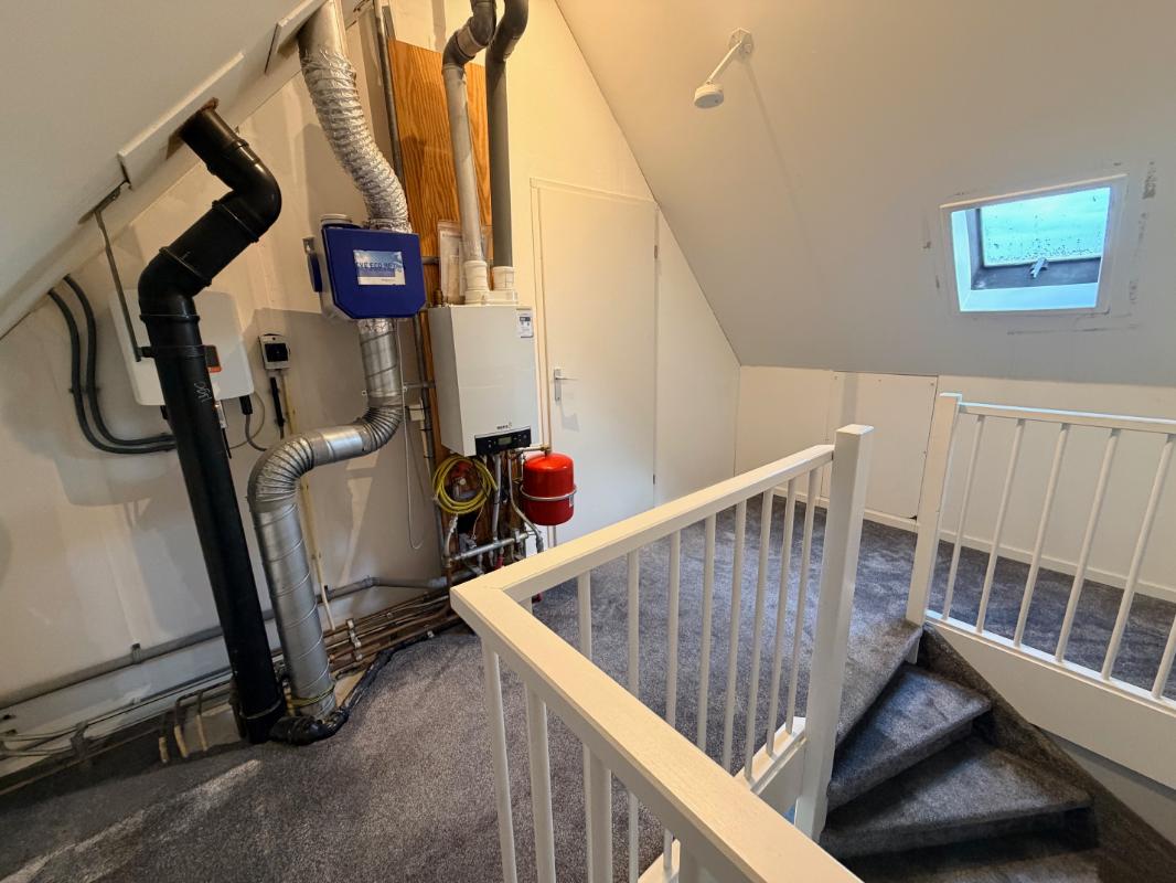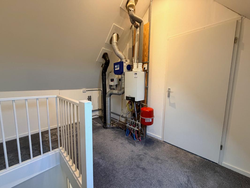 2e verdieping De 2e verdieping is bereikbaar via een vaste trap. Via een ruime overloop met klapraampje, waar zich ook de opstelplaats voor de Cv-installatie, eveneens aansluiting voor wasmachine en mechanische ventilatie systeem bevindt betreedt u de 4e slaapkamer, welke voorzien is van een Velux dakraam en genoeg bergruimte achter de knieschotten.