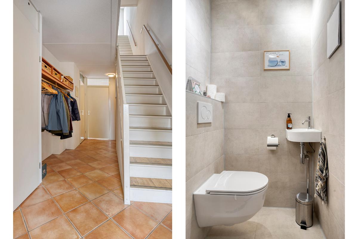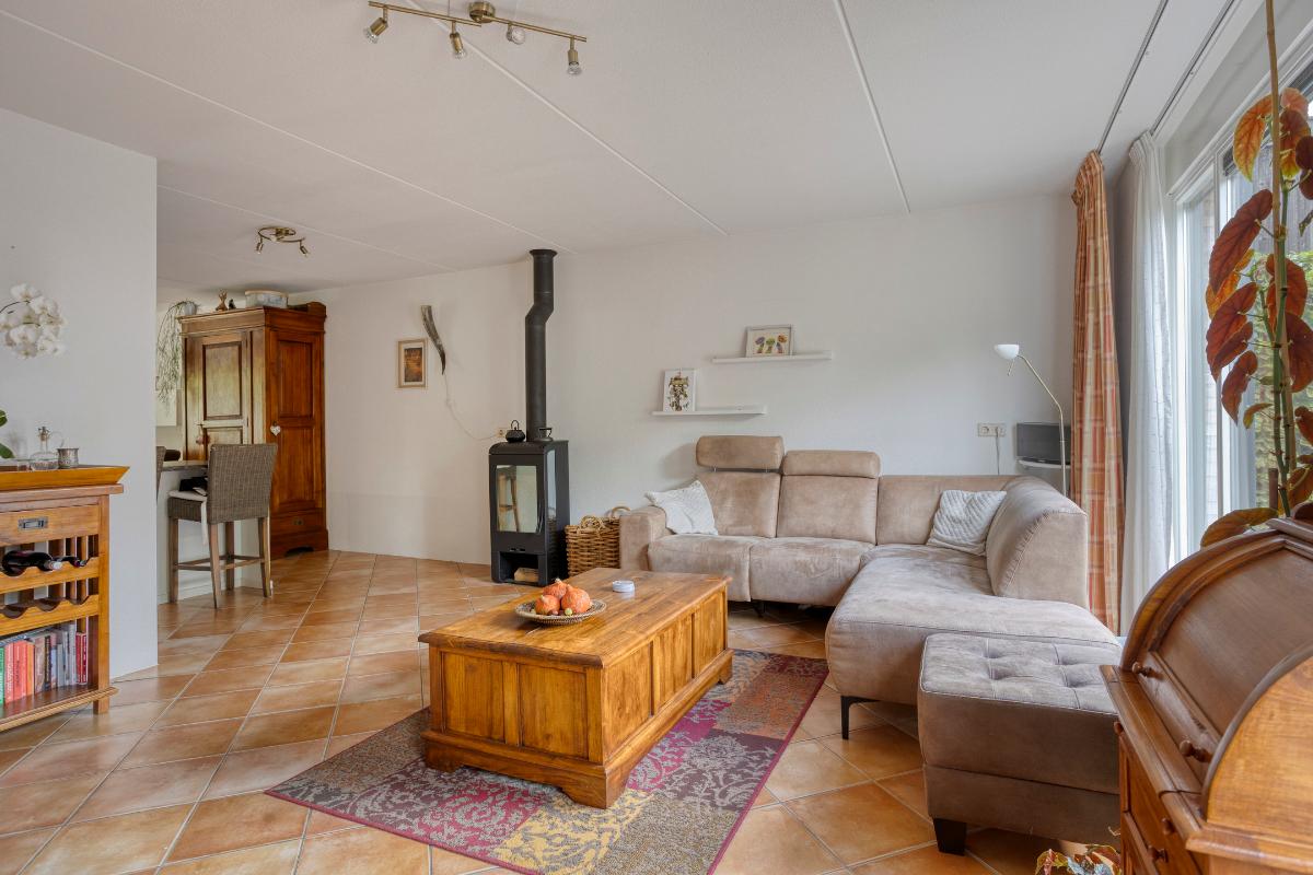 Begane grond U betreedt de woning via de entree/hal, voorzien van moderne toiletruimte met toilet en fontein, meterkast, trapopgang naar de 1e verdieping met trapkast, toegangsdeur naar de woonkamer en deur naar de garage. De ruime living, met houthaard, is zeer licht door de grote raampartij aan de achterzijde van de woning en geeft fraai uitzicht op de achtertuin. De open keuken aan de voorzijde is voorzien van L -vormig keukenblok met een aantal onder- en bovenkasten en diverse inbouwapparatuur, te weten inductieplaat, afzuigkap, combimagnetron, koelkast en vaatwasser. De gehele begane grondvloer is voorzien van een plavuizen vloer met vloerverwarming.