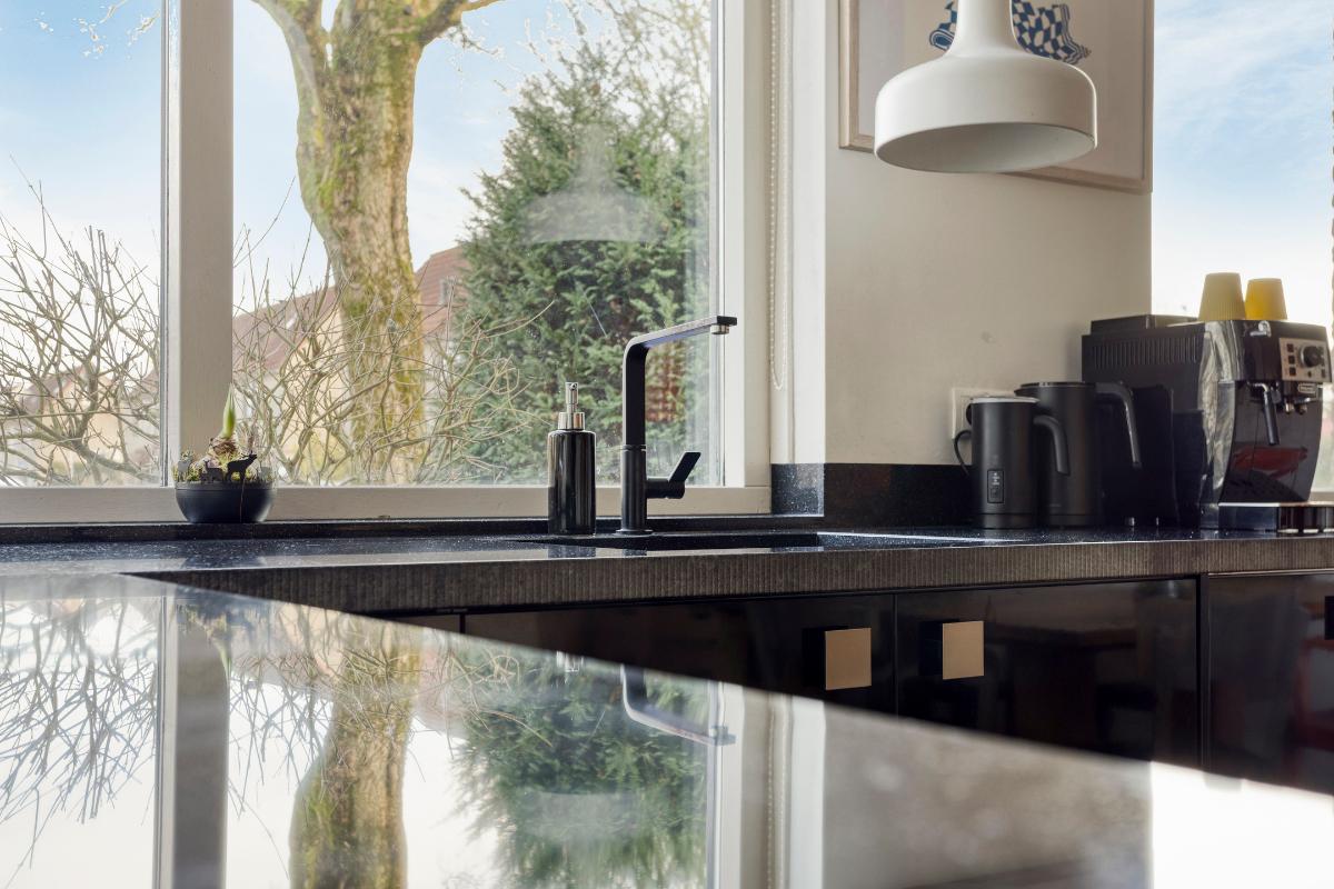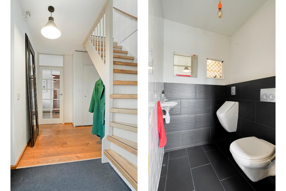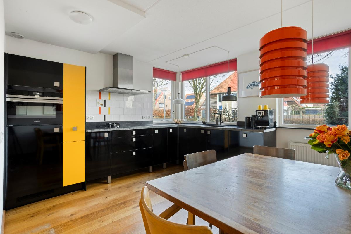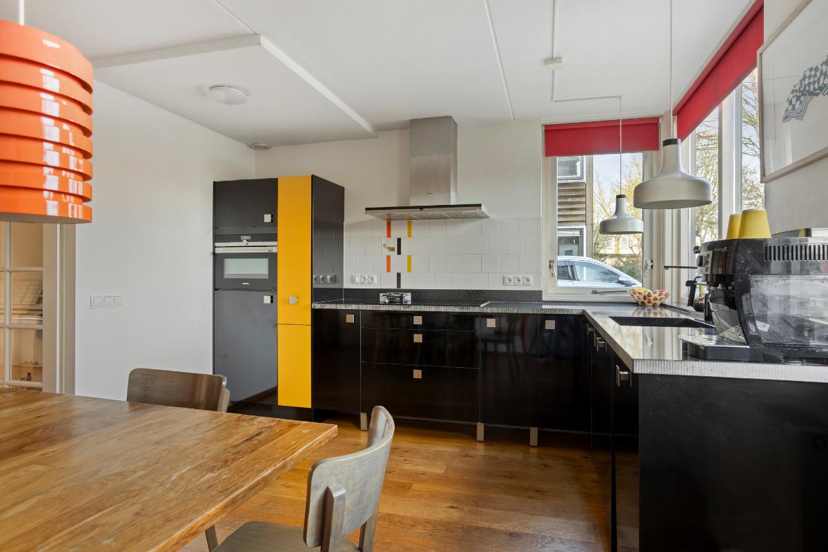 Indeling Begane grond Hal met meterkast, trapopgang naar de 1e verdieping, brede tuingerichte woonkamer met houtkachel, schuifpui naar de achtertuin. Aan de voorzijde bevindt zich de zwarte, open keuken in een hoekopstelling met een donkere natuurstenen aanrechtblad en voorzien van diverse inbouwapparatuur (inductiekookplaat met gas wokpit, RVS-afzuigkap, combimagnetron, koelkast en vaatwasser). Via de hoofdentree komt u tevens in de 2e hal (onderdeel van de voormalige garage) voorzien van toiletruimte met wandcloset, urinoir en fonteintje. Een ruime berging volgt met de deur naar de achtertuin en kleine aangebouwde overkapping. De gehele begane grondvloer is voorzien van een houtenvloer met convectorput en radiatoren..