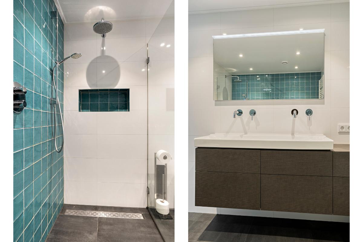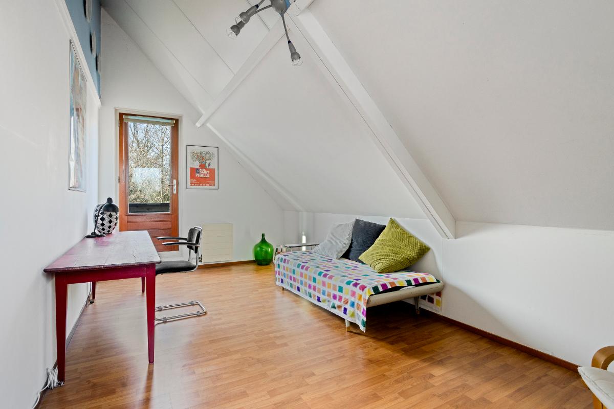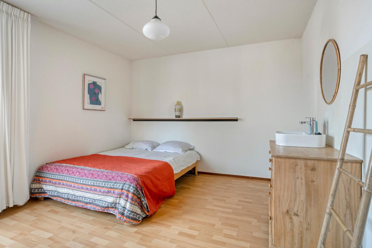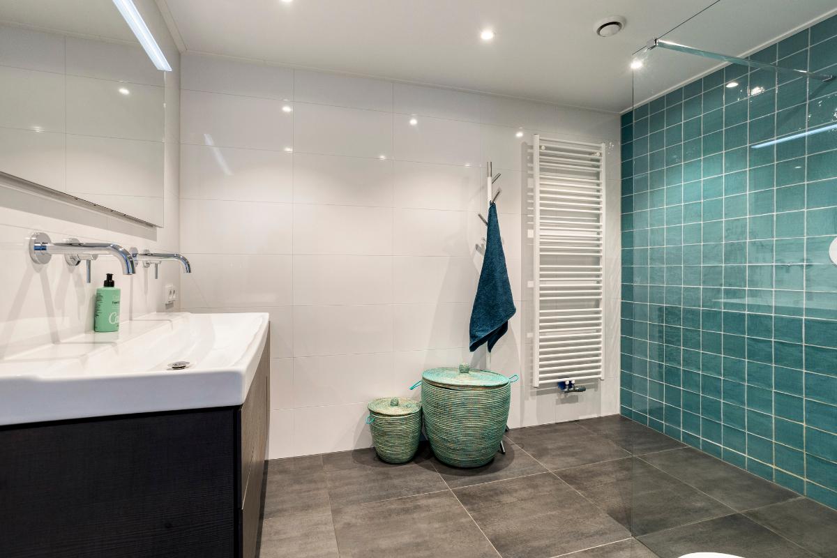 1e verdieping Overloop, 1e ruime slaapkamer aan de voorzijde met eigen wastafelmeubel, 2e slaapkamer aan de achterzijde met walk-in closet en deur naar balkon. 3e slaapkamer aan de zijgevel met eveneens deur naar het balkon. De inpandige badkamer aan de achterzijde met inloopdouche, dubbel wastafelmeubel, wandcloset en designradiator vormt het sluitstuk van deze ruime verdieping. Alle slaapkamers zijn voorzien van een laminaatvloer.