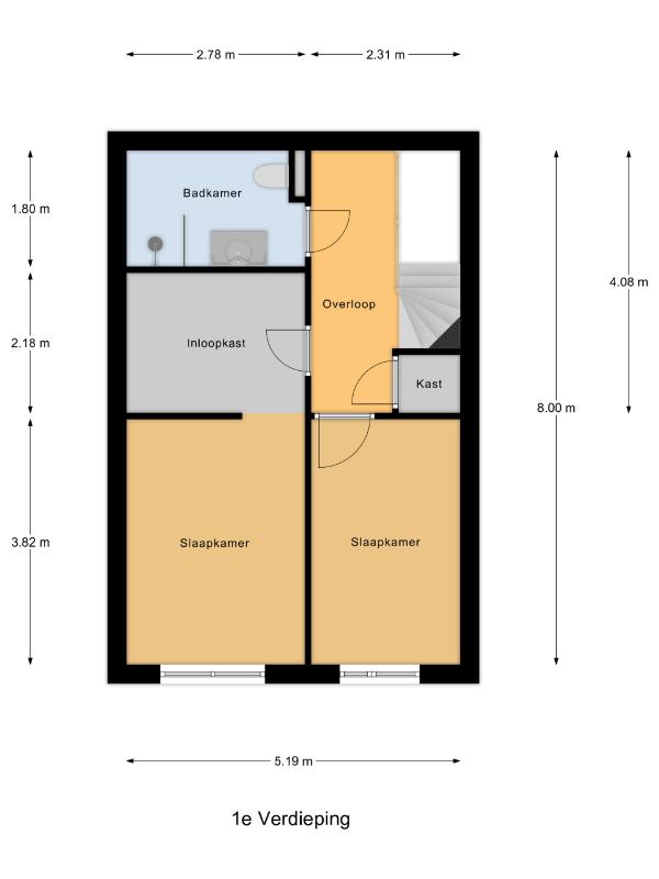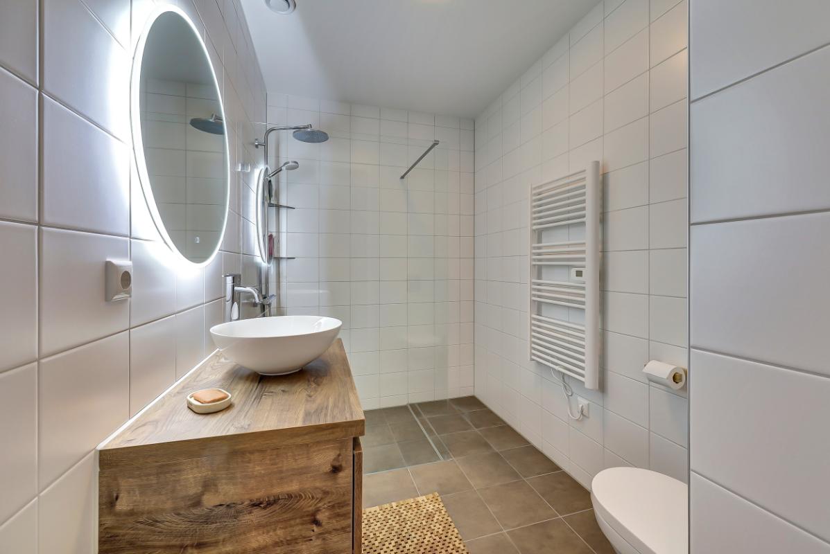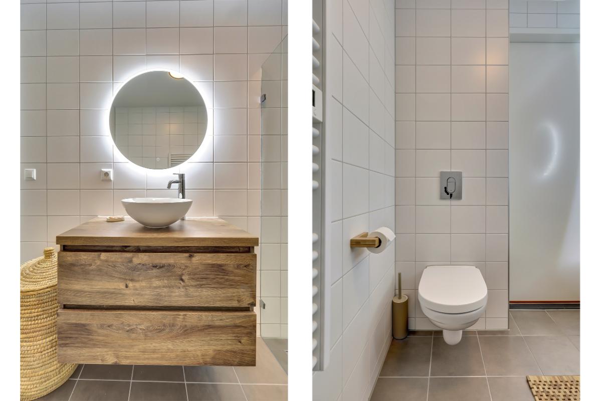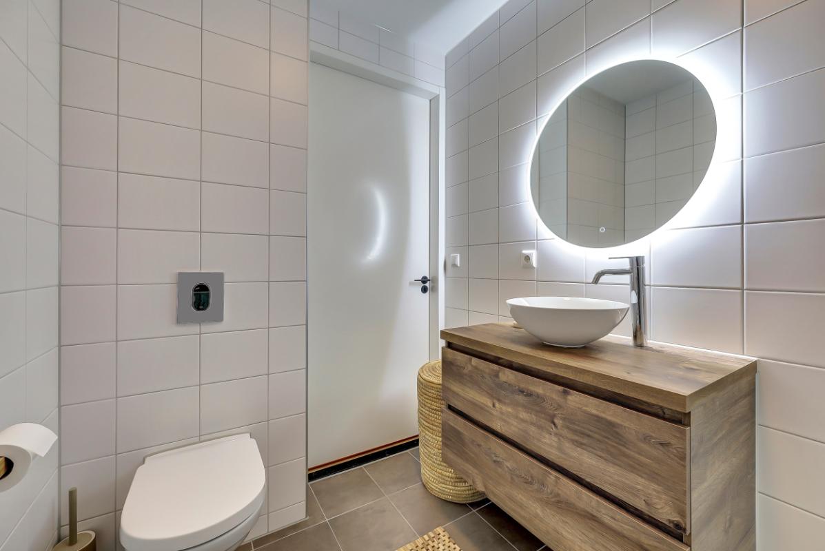 1e verdieping: Overloop met kast voor de aansluiting van de was/droogcombinatie, toegang tot twee ruime slaapkamers en een ruime inloopkast. Moderne badkamer met wc, ruime waskom en een stortdouche combinatie.