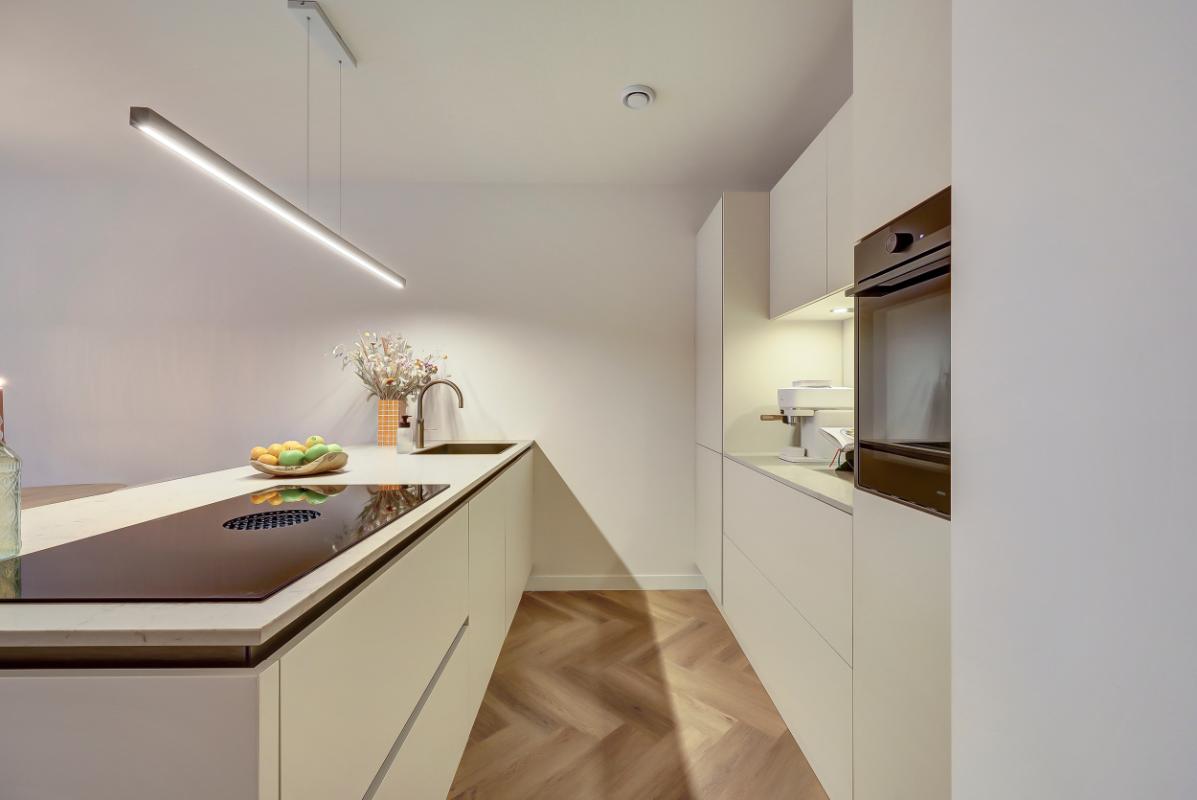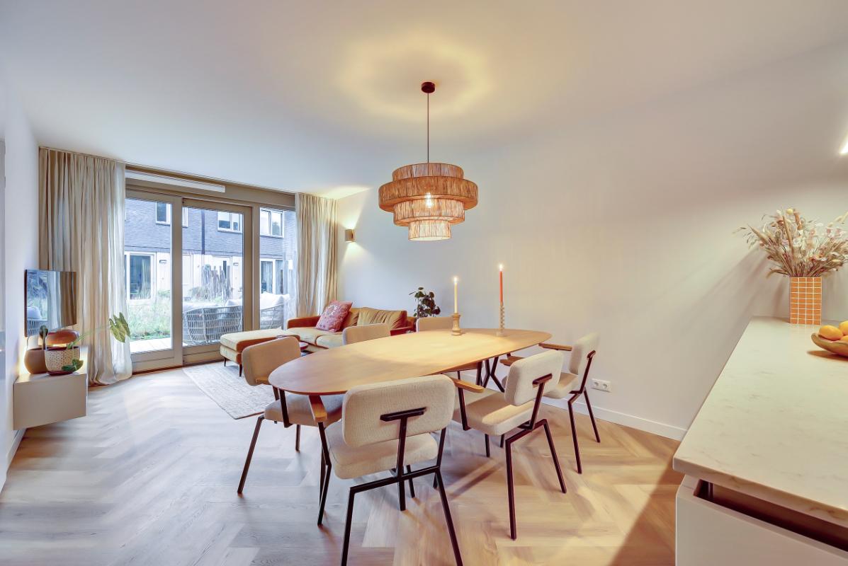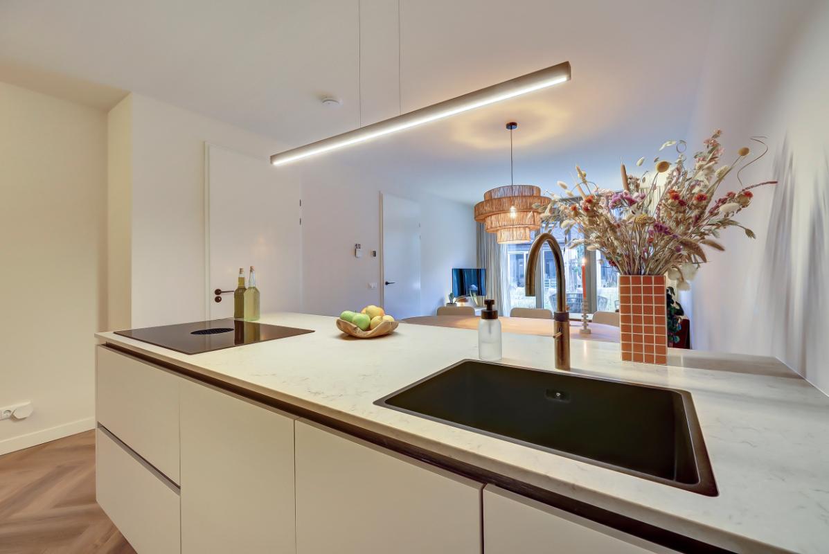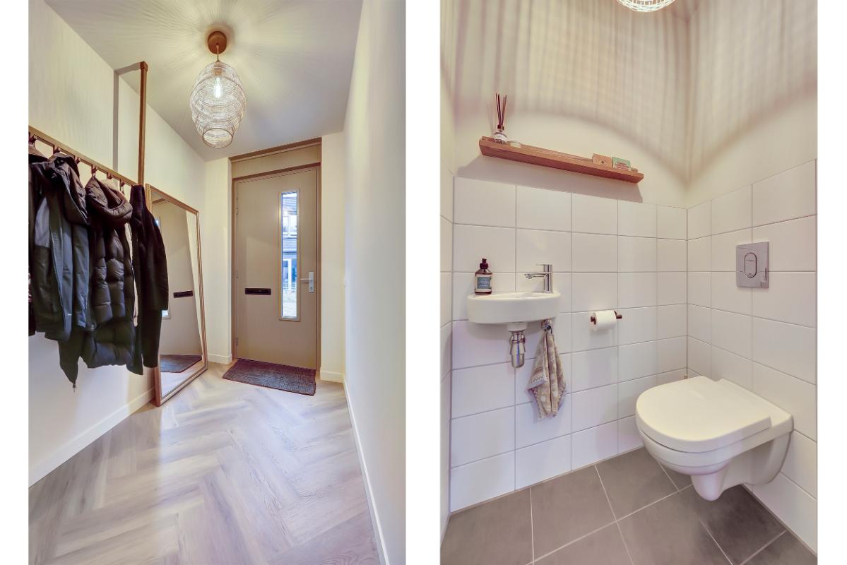 Indeling Begane grond: Ruime entree, met garderobe. Moderne toiletruimte met hangend toilet en fonteintje. Woonkamer en woonkeuken Sfeervolle woonkamer, trapkast en toegang tot het terras via een open pui. Luxe woonkeuken in beige kleurstelling en messing details, met composiet werkblad, een kook- en -spoelschiereiland. Een inductiekookplaat met geïntegreerde afzuiging (BORA PUXU) en een luxe uitgebreide oven van ATAG. Trapopgang naar de eerste verdieping. Op de vloer zowel boven als beneden ligt een pvc-vloer in visgraatmotief met vloerverwarming.