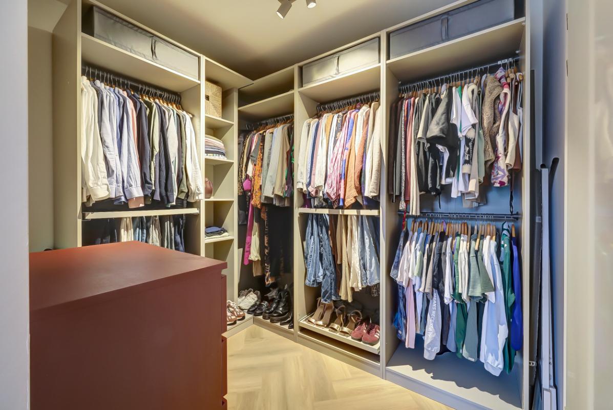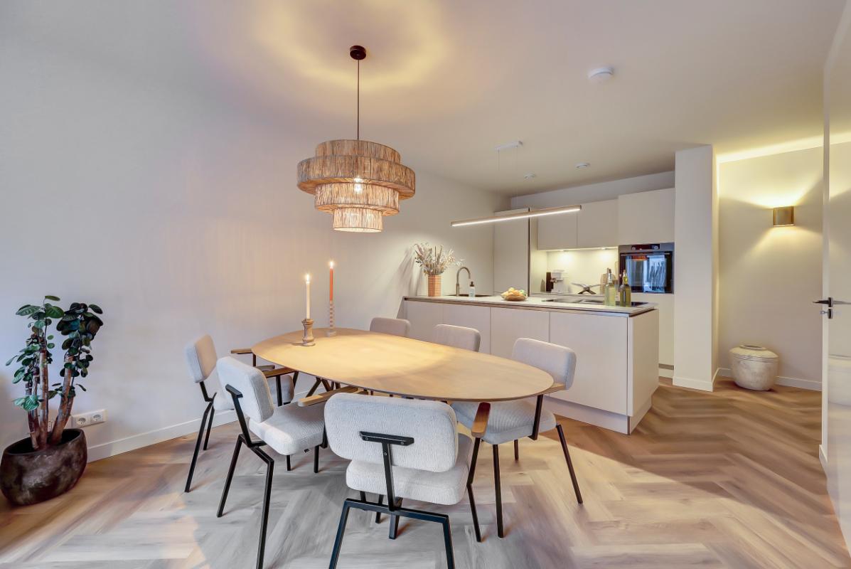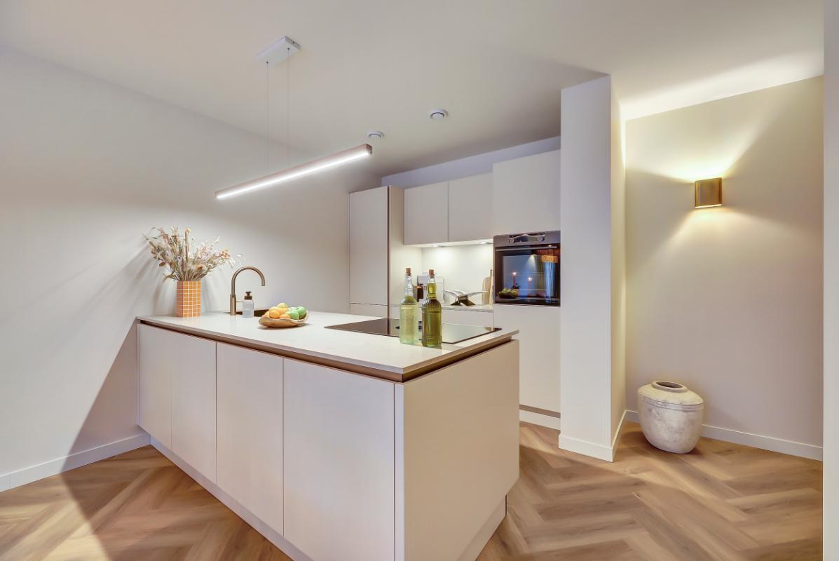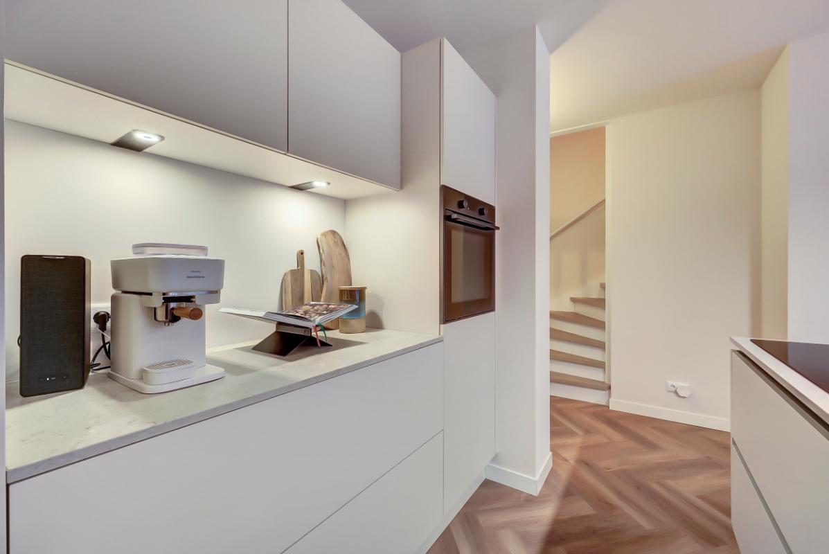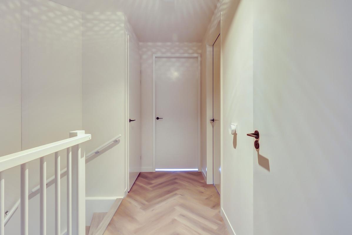 Indeling Begane grond: Ruime entree, met garderobe. Moderne toiletruimte met hangend toilet en fonteintje. Woonkamer en woonkeuken Sfeervolle woonkamer, trapkast en toegang tot het terras via een open pui. Luxe woonkeuken in beige kleurstelling en messing details, met composiet werkblad, een kook- en -spoelschiereiland. Een inductiekookplaat met geïntegreerde afzuiging (BORA PUXU) en een luxe uitgebreide oven van ATAG. Trapopgang naar de eerste verdieping. Op de vloer zowel boven als beneden ligt een pvc-vloer in visgraatmotief met vloerverwarming.