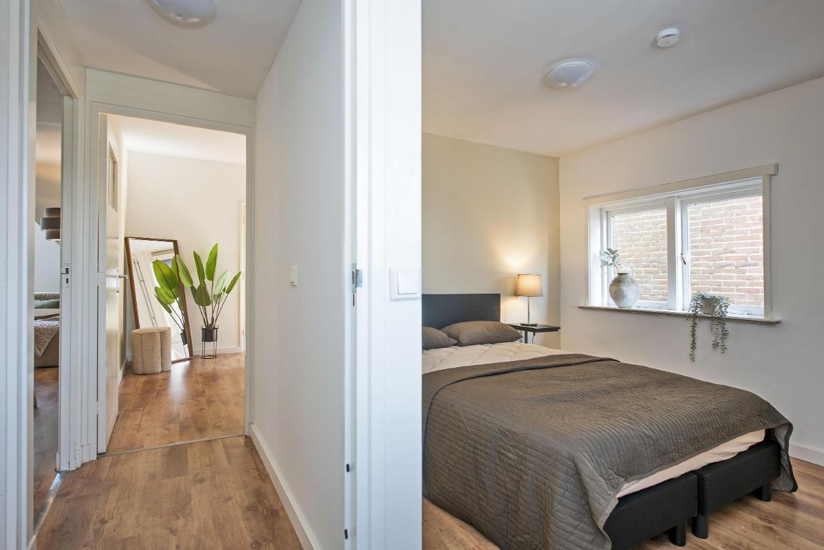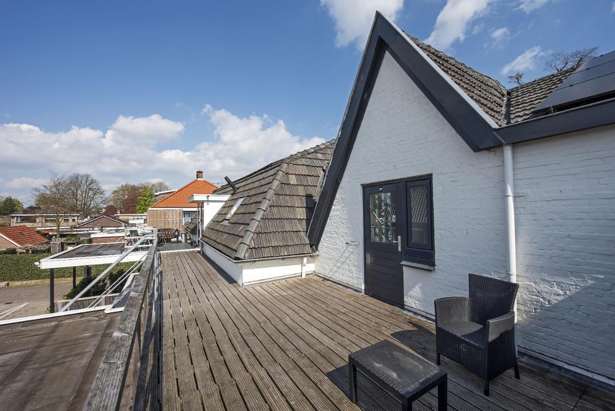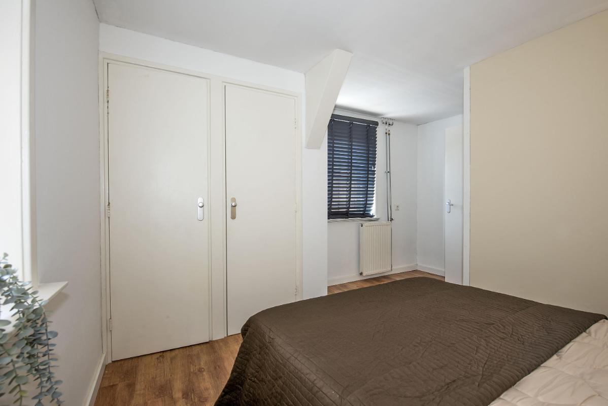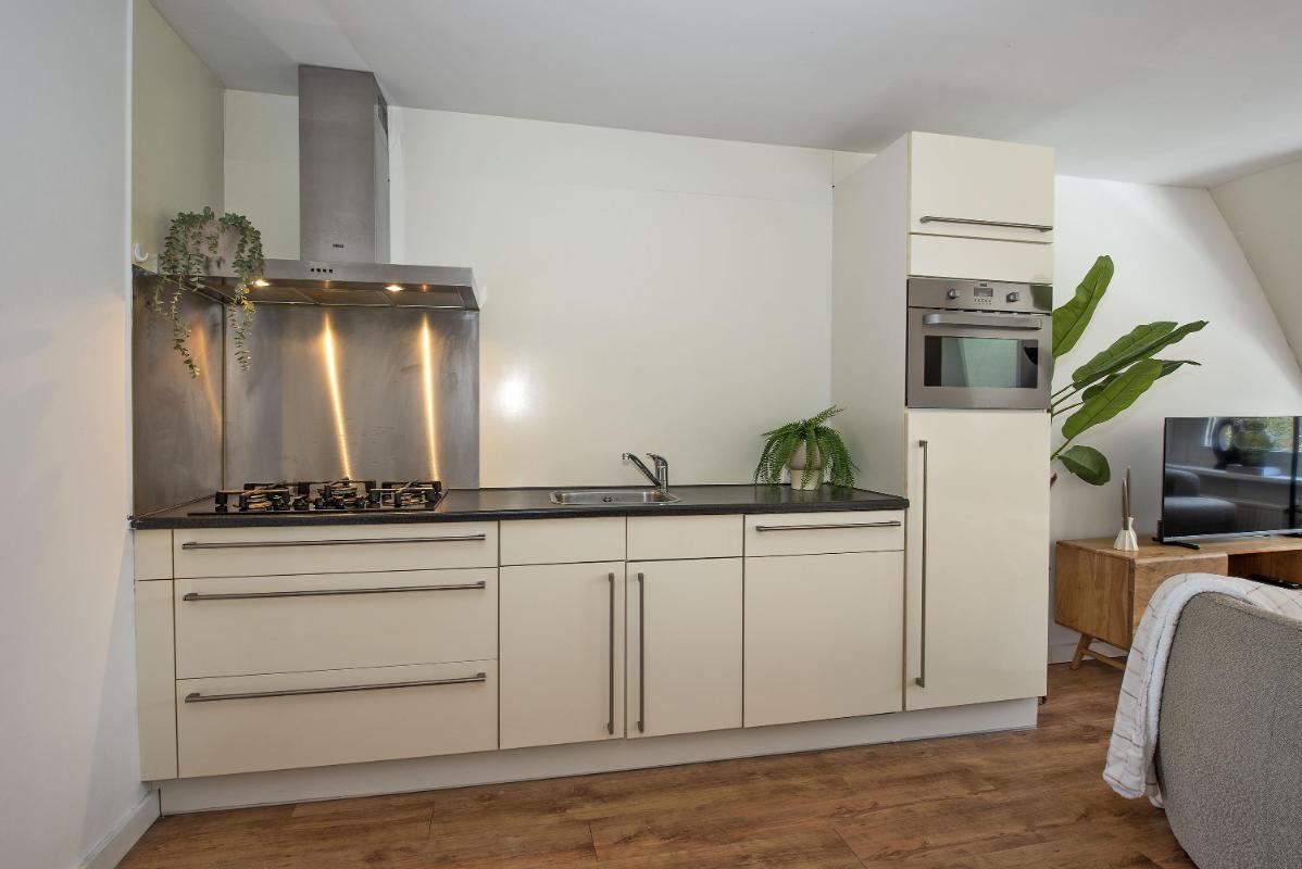 Indeling: Appartement: opgang middels trap, dakterras, entree, hal, toilet met fontein, meterkast, sfeervolle woonkamer met open keuken voorzien van inbouwapparatuur, portaal, ruime slaapkamer met vaste kasten, badkamer met douche, waskom en opstelplaats voor de wasapparatuur, slaapkamer met vaste kasten.