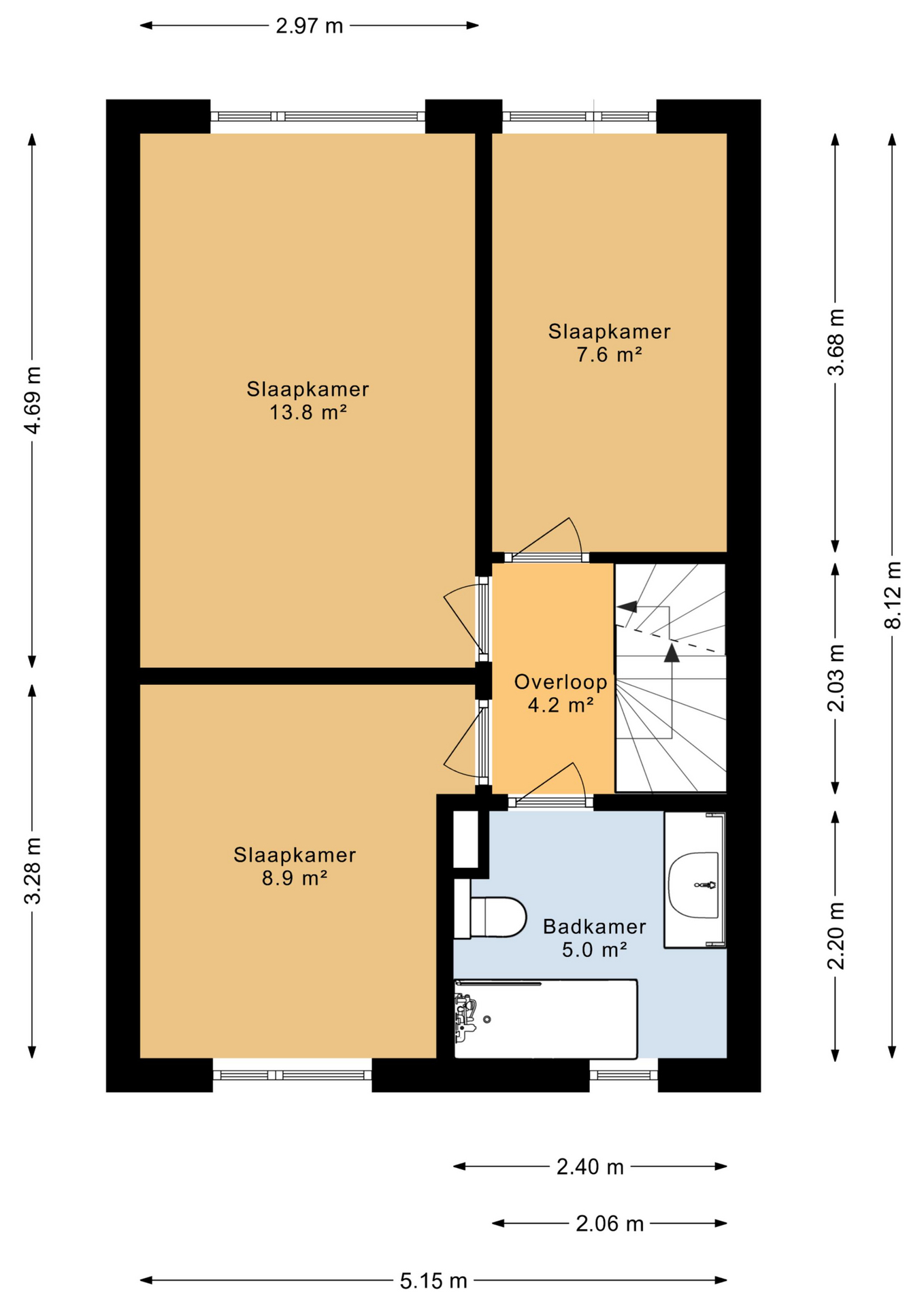 Op de eerste verdieping bevinden zich drie slaapkamers. De hoofdslaapkamer is ruim en licht en biedt voldoende plek voor een groot bed en een kastenwand. De twee andere kamers zijn ideaal als kinder-, werk- of hobbykamer en hebben een prettige lichtinval.